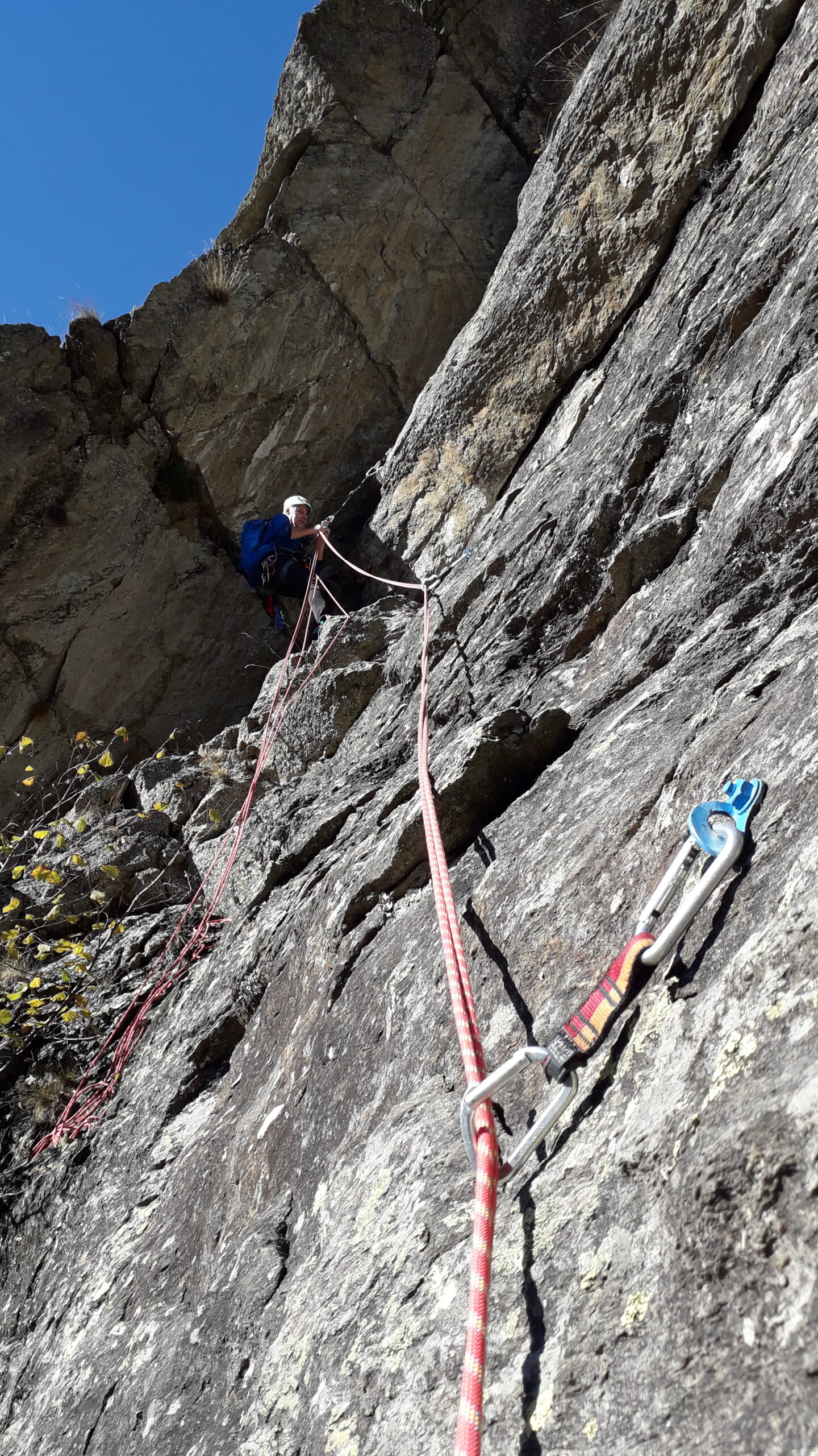 La via e’ breve, comunque carina, e niente affatto banale. Tirato dritto anche noi per la variante diretta di 5c al secondo tiro. Interessanti e delicati i passaggi in placca a seguire. Il grip non e’ dei migliori, cio’ dovuto alla presenza di parecchio lichene in superficie. Bello il diedro con i chiodi in numero giusto e piazzati dove ti aspetti di trovarli salendo. Fisica l’uscita alla catena di S4 ( ultima lunghezza) facilitata dallo spit aggiunto a meta tra lo spit sottostante e la catena stessa.