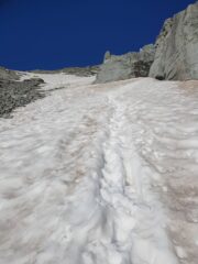 La salita dal versante Valgrisanche, fatta in estate, è resa complessa dalla difficoltà di trovare la traccia lungo la pietraia quasi interamente priva di neve; fondamentale aiutarsi con una traccia gps e aguzzare la vista per vedere gli ometti. In generale il percorso è ancora molto mutevole e perdersi è facile, bisogna anche fare attenzione alla stabilità delle rocce sul tracciato. Quest’anno abbiamo trovato la salita dell’ex ghiacciaio Morion e il pendio sotto al colle ancora discretamente innevati, condizione da non dare per scontata. Fatta in traversata dalla Valgrisanche alla Valdigne, discesa sul ghiacciaio del Rutor ancora in buone condizioni, terminale chiusa sulla dx orografica; ultimo tratto su ghiaccio poi da quota 2940 si passa su morena; percorso attrezzato con catene e canaponi in 2 punti prima di raggiungere i prati del Rif.Deffeyes.