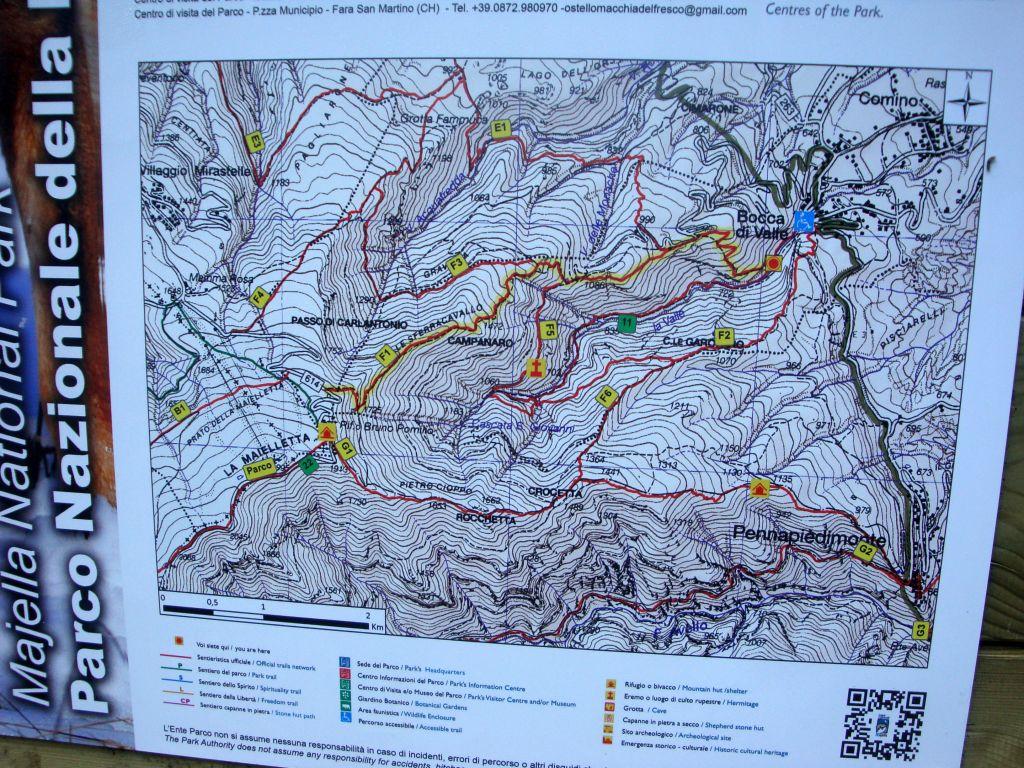 Da Bocca di Valle (m.647) si segue la carreggiabile segnata con il numero F2 che inizia in prossimità del ponte sul torrente in corrispondenza dell’insegna in legno della comunità Montana Maielletta.
