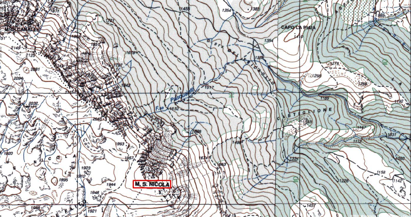 Discesa:Scendere nel canalone Nord di Monte S. Nicola. abbassarsi nel canale per circa 250 m. di dislivello.Piegare poi a dx (direzione Est)traversando per uscire dal canale prima della fascia boscosa.Lambire il bosco e ricollegarsi con l’itinerario di salita alla Q.1625 circa.