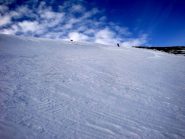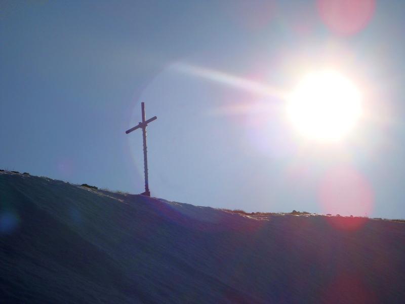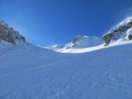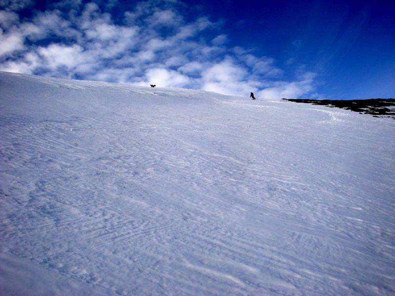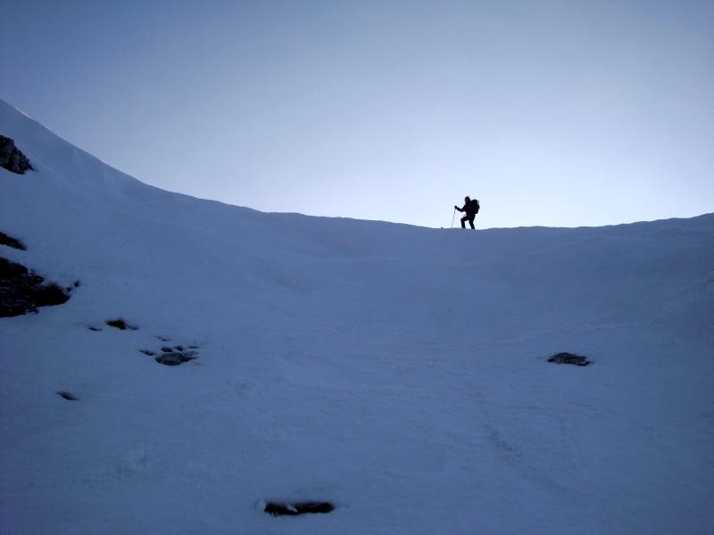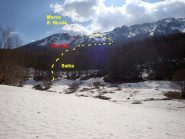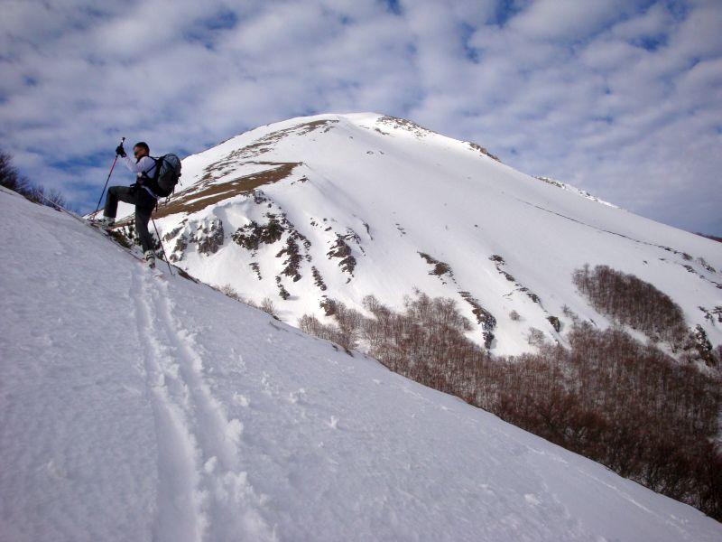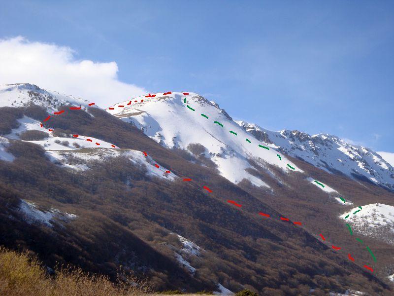 Alla q.1800 circa si esce dal bosco,ritrovandosi alla base dei contrafforti rocciosi e più in alto dei salti di roccia presenti sulla sx.A questo punto si piega a sx in traverso e si risalgono i pendii obliqui,soprastanti i salti di roccia. Con attenzione (vietato scivolare)in direzione Sud ,si risalgono tali pendii sospesi fino a raggiungere la cresta a q.1957,sul bordo sx orografico del Canale S. Nicola. Rapidamente in vetta (2012).