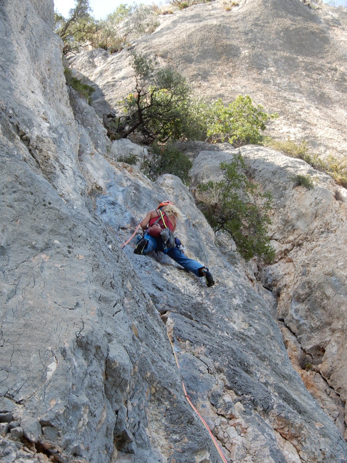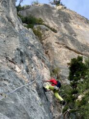 - L10: a destra montando su un ginepro e salendo una parete decisamente verticale. Un breve tratto di roccia non molto sana precede la S10, 25m (6a+)