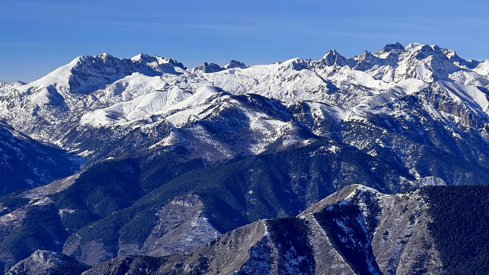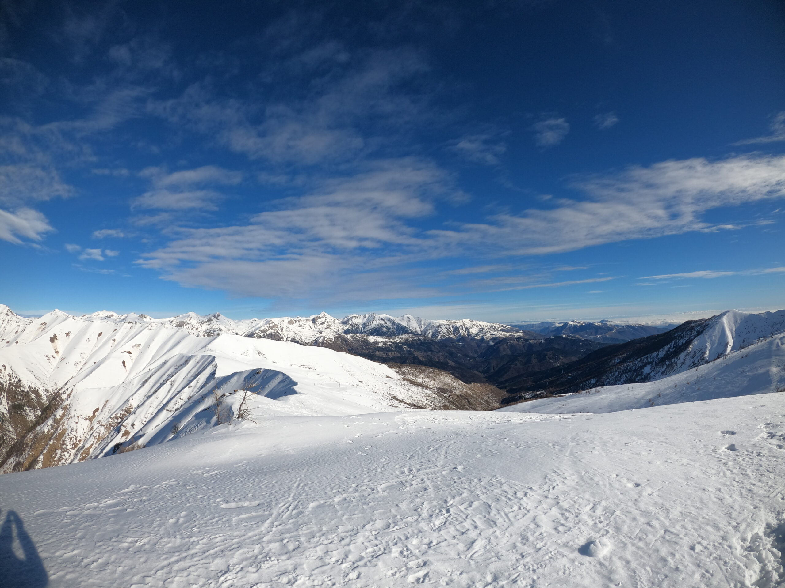 Panorama che spazia dalla Costa azzurra, (sovente si vede la Corsica), alle cime delle Alpi Liguri e Marittime.