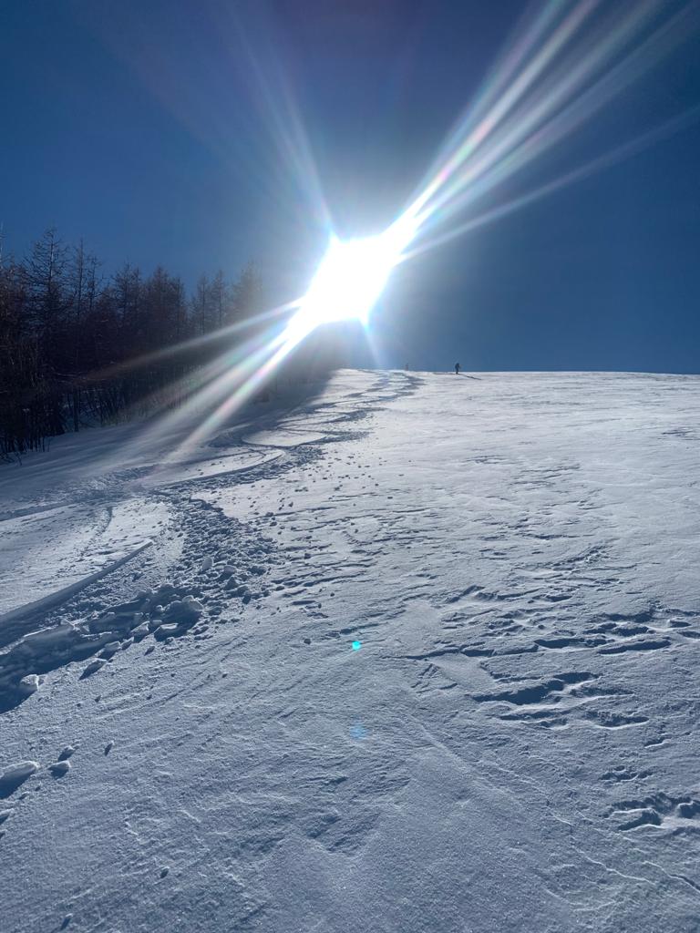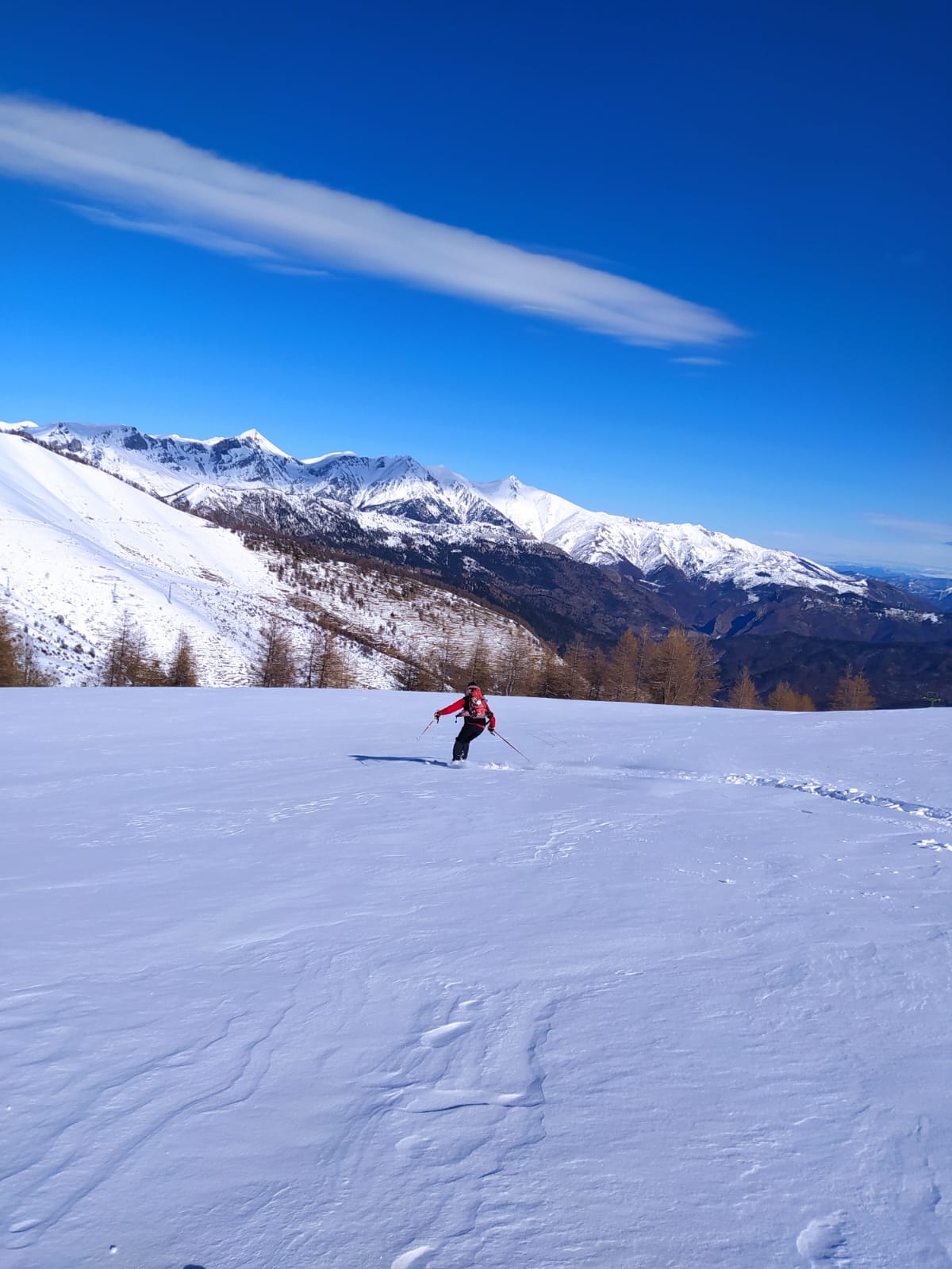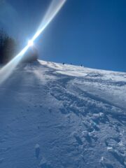 Giornata magnifica con una leggera nevicata di ieri, 10 centimetri in basso su fondo portante, in alto il vento ha creato accumuli ben visibili, abbiamo fatto traccia nonostante le numerose auto a Monesi grandi spazi intonsi e immacolati, sciata molto piacevole scendendo presto, appena un poco di verglas sulle creste e neve dura nei primi 100 metri, ma con ottimo grip, Monesi quest’ anno ci ha salvato…..non ho messo 5 stelle solo perchè è una gitarella…..
