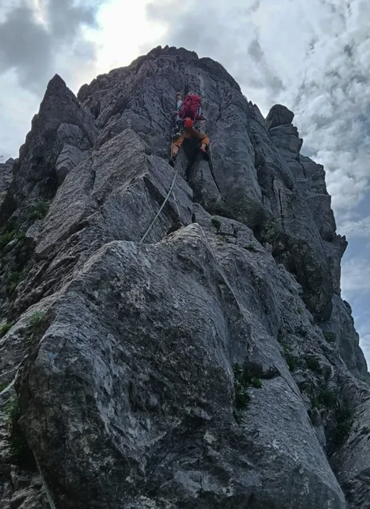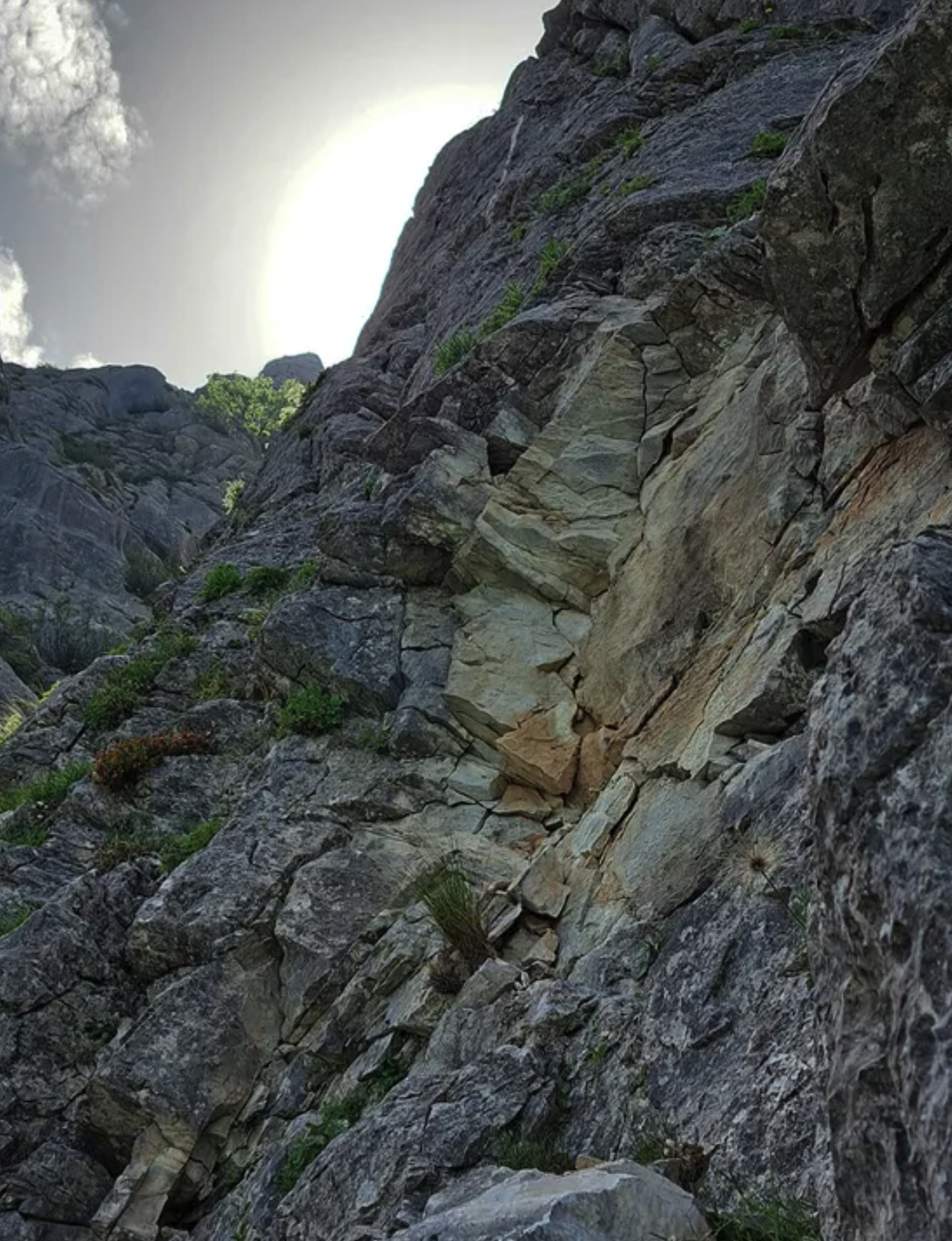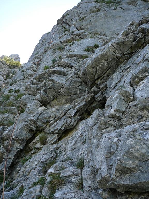 4° tiro: salire la placchetta liscia sopra la sosta (passo delicato, almeno IV) per poi traversare quasi subito a sinistra, andando a prendere l’evidente camino, che si sale comodamente in opposizione (IV). Se ne esce a destra su terreno più facile fino alla sosta. Nota: l’originale non saliva il camino ma andava dritta sopra la sosta, un po’ più facile ma poco proteggibile e più esposto.