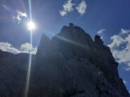 alcuni metri (IV/IV+), poi facile fino alla sosta, situata a cavallo di un caratteristico intaglio.