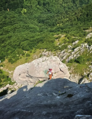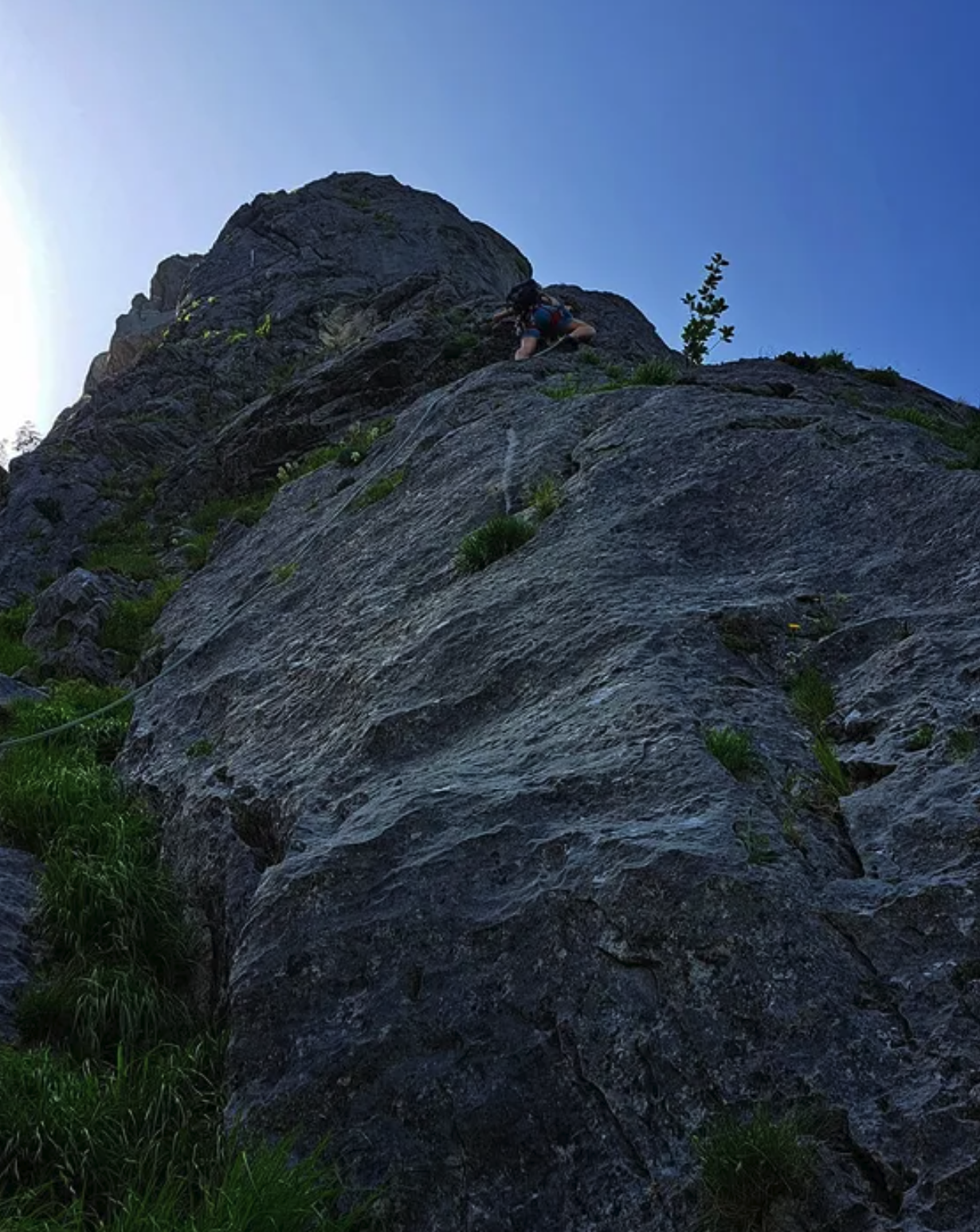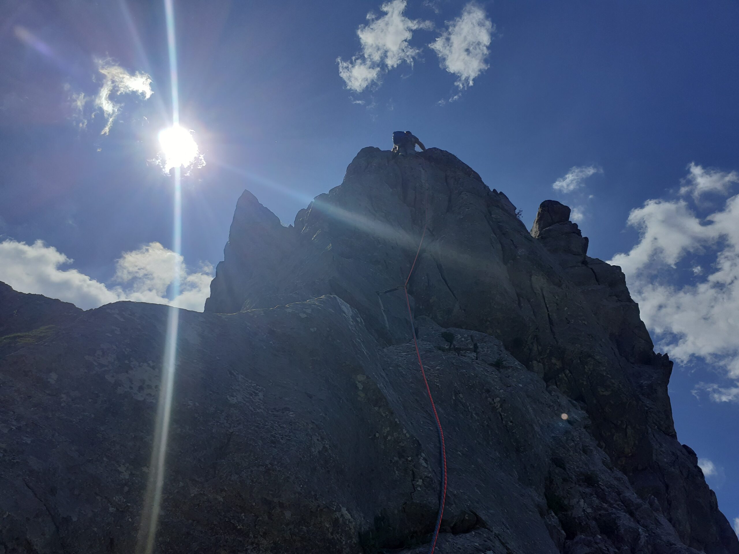 6° tiro: pochi passi facili (ancora un paio di fix, friend incastrato) e si arriva in vetta. Sul punto più alto c’è una sosta (anche di calata) con un fascio di cordini.