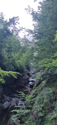 5° tiro: Seguendo i fix, si deve salire la fessura strapiombante sopra la sosta (V/V+). La via classica però la evitava: prima del secondo fix si può traversare delicatamente a sinistra (IV) e ci si immette in un bel diedrino-canale (III+, molto ben proteggibile con friend e clessidre, presente anche un friend incastrato) fino a tornare, dopo 7-8 metri, verso i fix a destra, sopra il passo duro. Successivamente si prosegue su terreno più facile, si incontra una vecchia sosta a chiodi e dopo un ultimo passo più verticale (IV-) la sosta moderna a fix. Considerevole attrito alla corda, se si fa l’aggiramento.