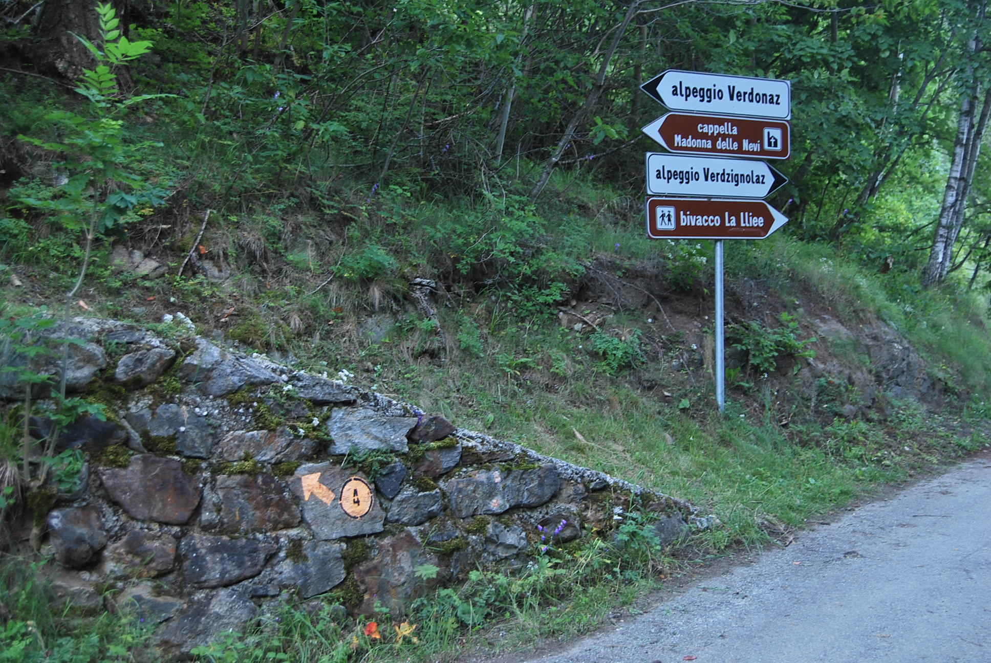Ho seguito l’itinerario inverso. Partenza dalla Valpelline, località Vernosse (fermata autobus); si attraversa il villaggio, si segue la strada asfaltata fino al ponte di Bagnera (1265 m), si ignora il primo bivio (sentiero n.5), al successivo (indicazioni Verdona e Madonna delle Nevi) si imbocca il sentiero n. 4 che va seguito fino alla testata del vallone dove si trova l’alpe della Tza di Verdona e il piccolo Santuario. Sentiero sempre evidente, bolli sempre presenti anche se non molto frequenti. Alla Tza di Verdona si trova un cippo con le frecce per i vari sentieri, seguire quello per il Colle di Saint Barthelemy (a 50’) che ora coincide con l’intervallivo 105. Al colle sono salito sulla punta erbosa (destra salendo, quota 2714 m) dove il panorama è davvero superlativo.