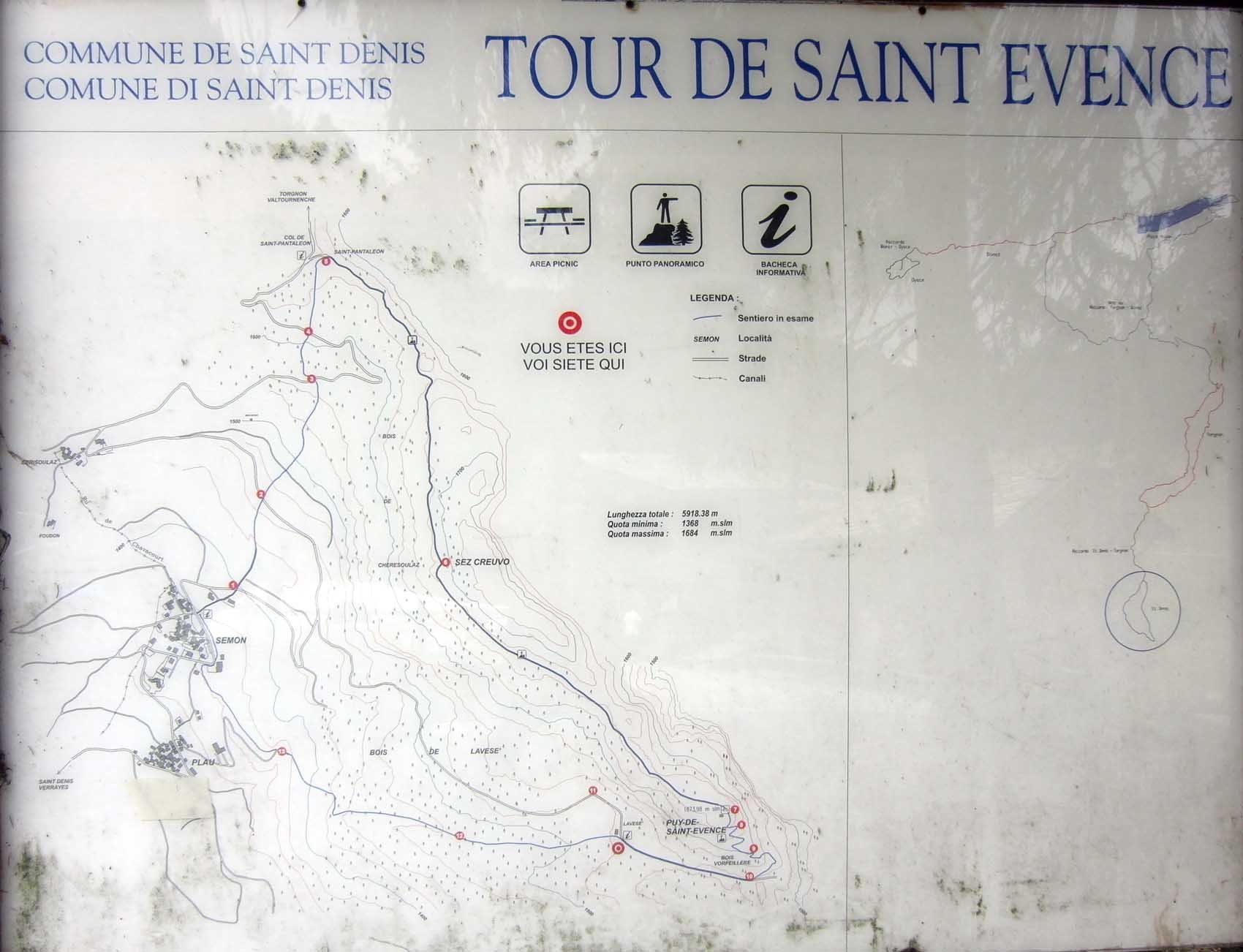 Dalle case di Mongnod seguire la carrareccia in direzione S prendendo quindi il sentiero che sulla sx porta alla cappella di Saint-Pantaleon. Dietro alla cappella (indicazioni) parte il sentiero che con alcuni saliscendi porta alla Cappella di Saint-Evence.