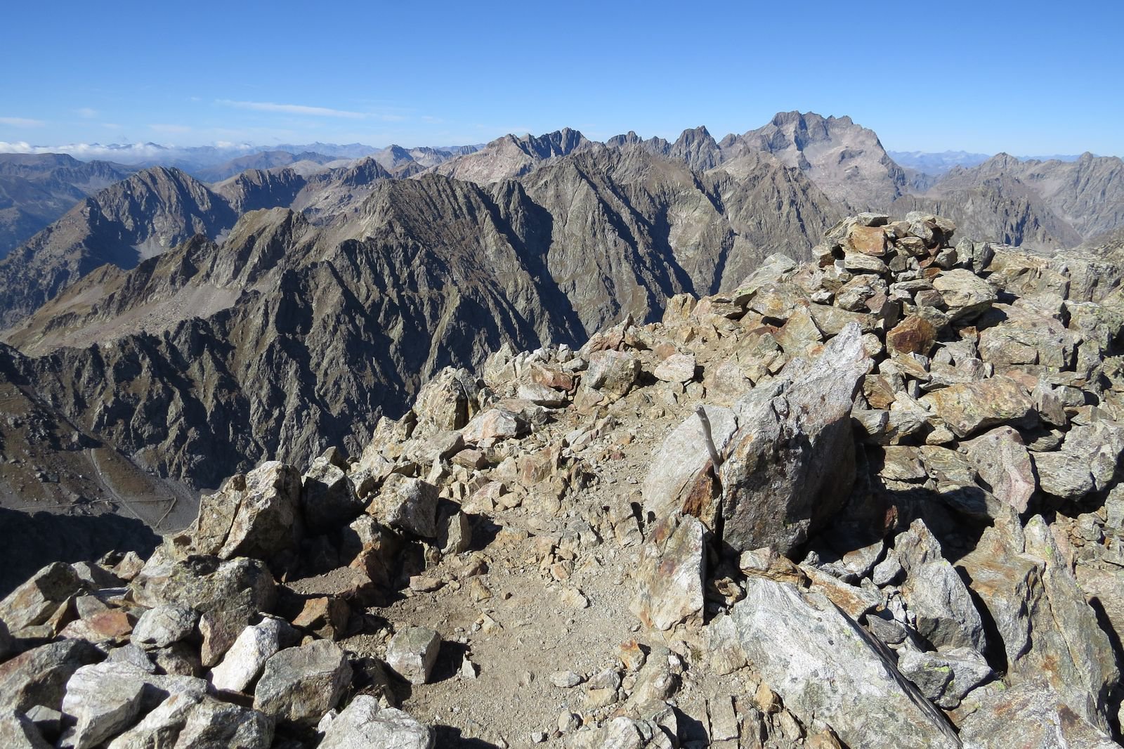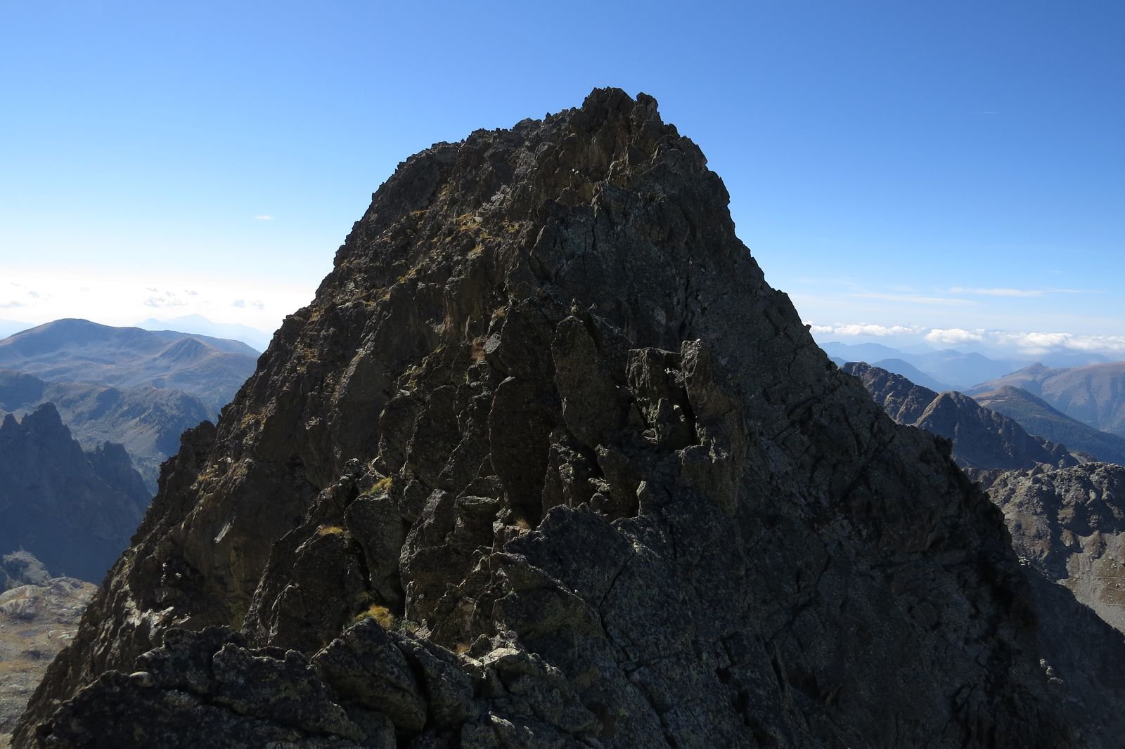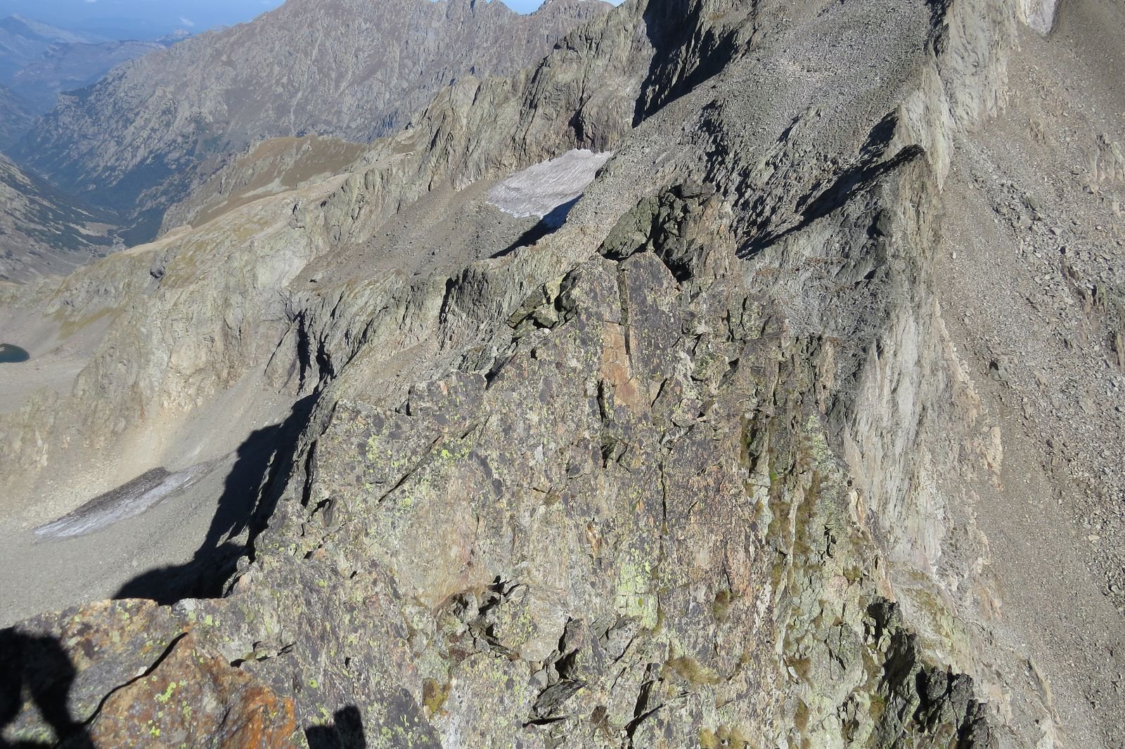 Un tratto molto articolato può essere aggirato sul versante Sud-Est una decina di metri sotto il filo (ometti), mentre l’ultima parte si percorre nuovamente sul filo, con superando direttamente n ultimo un grosso blocco che costringerebbe ad un aggiramento piuttosto complicato (passo di III-).