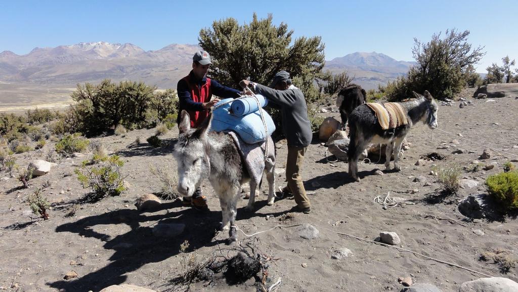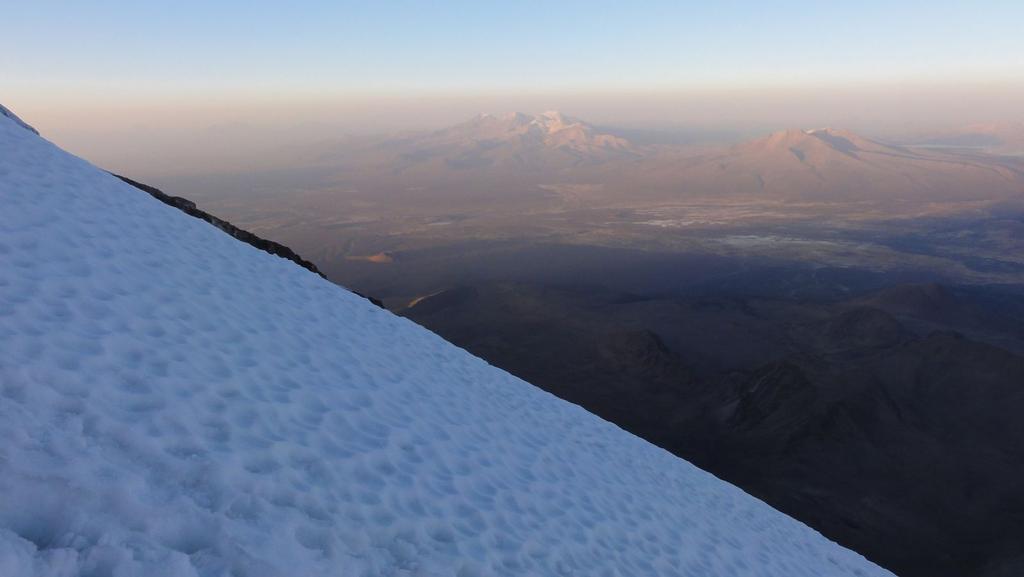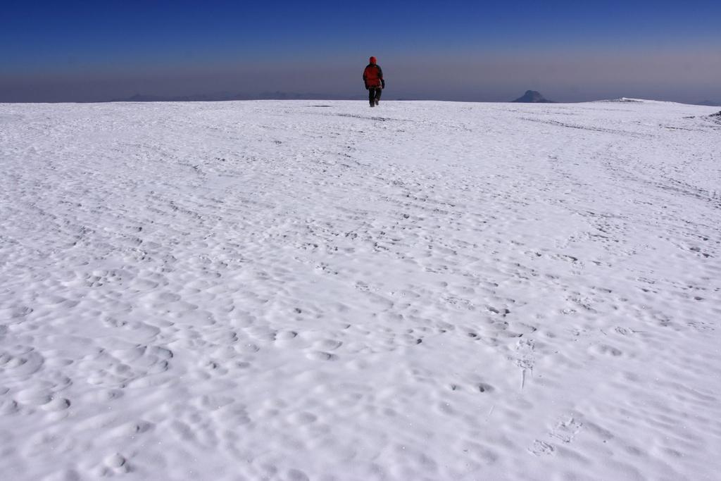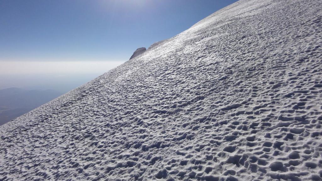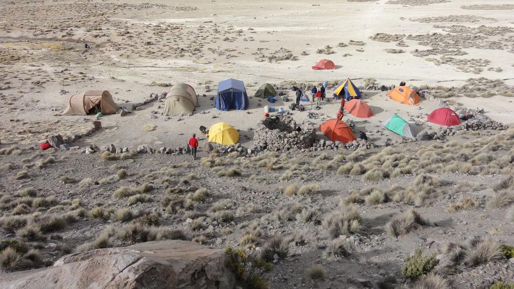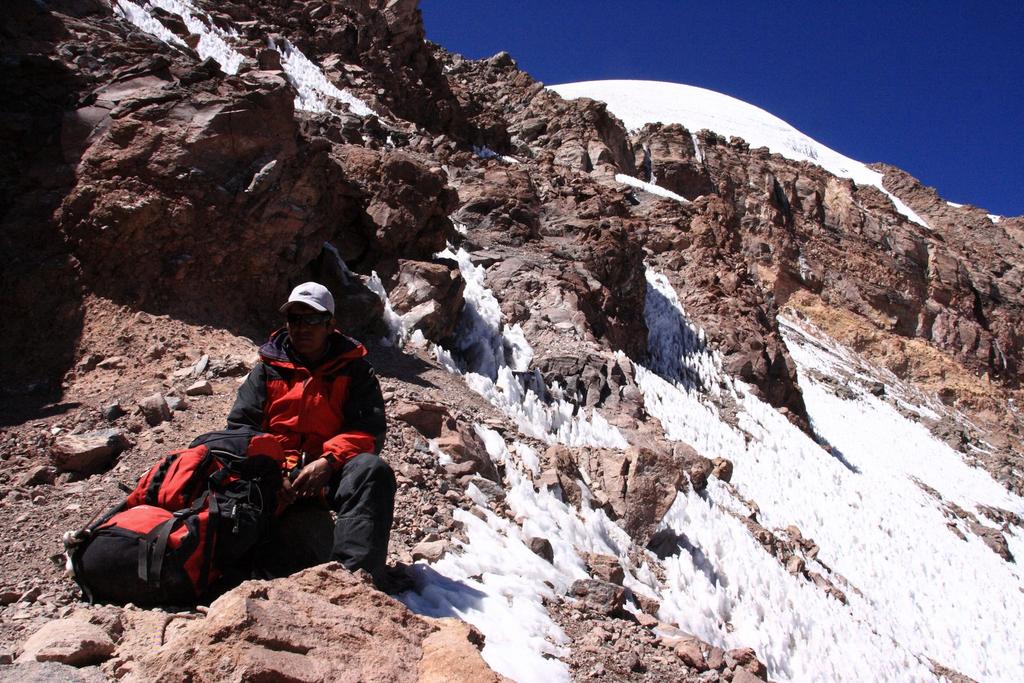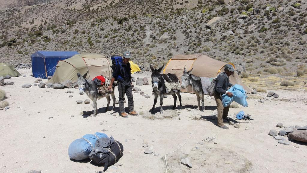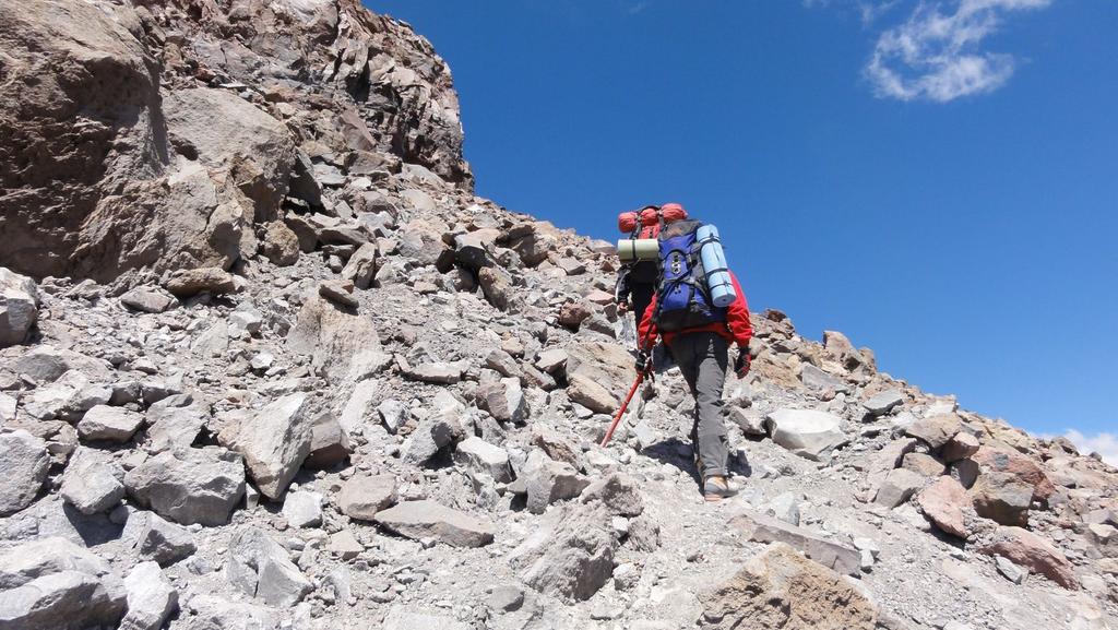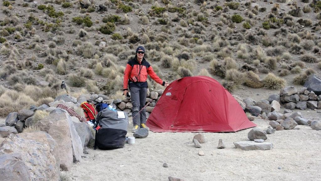 Poi ancora terreno misto prima di raggiungere l’inizio del ghiacciaio, dove ci aspetta una fitta barriera di penitentes che obbligano a continui traversi per trovare il passaggio migliore, infine il crestone nevoso largo e inclinato intorno ai 35-40° che porta verso la cima, con pochi crepacci da attraversare e/o aggirare. Il Campo Base è su terreno pianeggiante, su sabbia e terriccio decisamente comodo e con la presenza di acqua nei dintorni, molto spazioso, non ci sono problemi per montare la tenda, anche in presenza di molta gente ; mentre al Campo Alto su pietrame e detriti non c’è spazio per più di 7 o 8 tende, e qui è difficile trovare l’acqua…quindi occorre provvedere dal basso e portarsi le bottiglie necessarie per bere e cucinare.