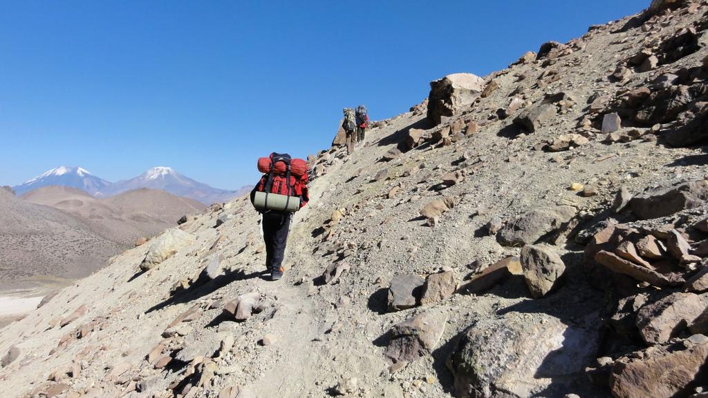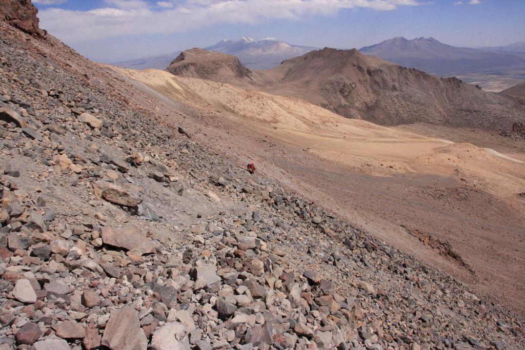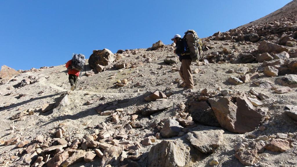 Qui il sentiero prosegue a mezzacosta sempre verso sinistra tagliando una vasta pietraia, fino a raggiungere la cresta NO del Sajama. Passati sul versante opposto il sentiero sale subito ripidamente su pietrame e sfasciumi verso un imponente blocco roccioso della cresta NO, che viene aggirato sulla sinistra, non lontano dalla parete rocciosa. Successivamente il sentierino imbocca un ripido canale di pietrame che viene risalito con numerosi tornanti, fino a raggiungere una piccola conca sotto un blocco roccioso, una ultima rampa verso sinistra conduce alla sella detritica posta a 5700 m. dove è collocato il Campo Alto (qui si possono montare al massimo 7-8 tende), se non c’è neve è difficile trovare l’acqua. (dal Campo Base ore 3,30 / 4,00. Dislivello 900 m. circa).