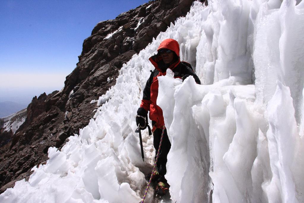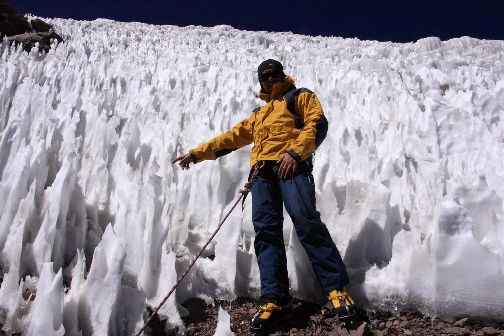 Usciti dal canalino, si prosegue sulla nostra destra per una cresta rocciosa poco ripida, ma a tratti abbastanza esposta (passi di I/II, 1 spit nel passaggio forse più delicato) per circa 200 metri, fino a raggiungere la base del ghiacciaio. La prima parte del ghiacciaio è costituita da una fitta barriera di penitentes che costringe a continui zig-zag per cercare il passaggio migliore in mezzo a lame che talvolta superano anche un metro e mezzo di altezza. Questo tratto, circa 300 metri di dislivello richiede molto tempo per superarlo (non c’è alcuna pista e non è semplice indovinare il passaggio giusto).