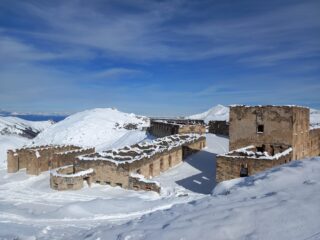 Discesa: tornati al forte Pernante, abbiamo sceso giù dritto per dritto il valloncello che arriva allo skilift dismesso. Molta neve accumulata e conseguente tribolazione.