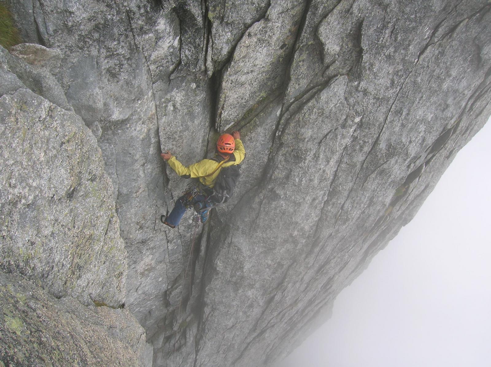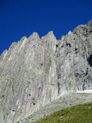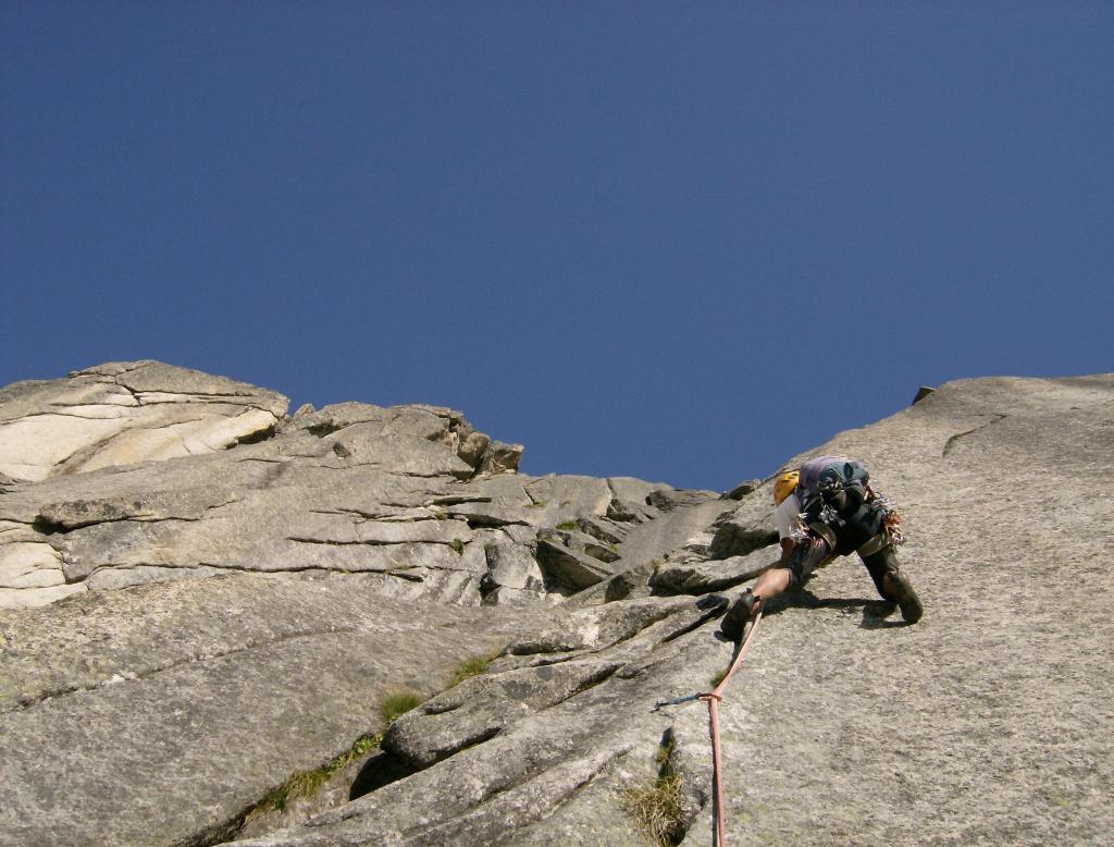 - -6 7 8 & 9 tiro: risalire tutto il diedro (ben proteggibile) con qualche vecchio cordino incastrato e chiodo occasionale. Uno spit sulla lunghezza 7 a proteggere un passo più difficile.