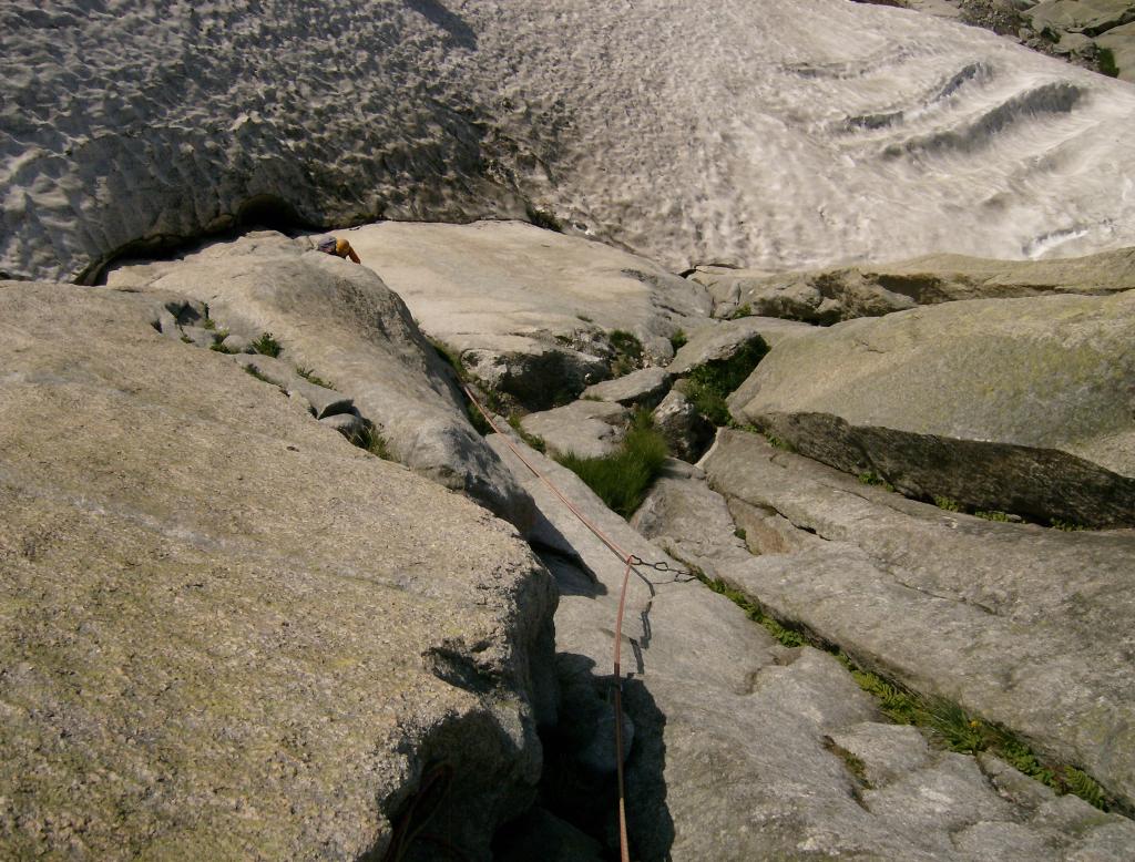 - – 3 tiro: rimontare il blocco che chiude la cengia sulla destra, scendere dall’altra parte e scalare lo splendido diedro sino al suo termine. 5c+