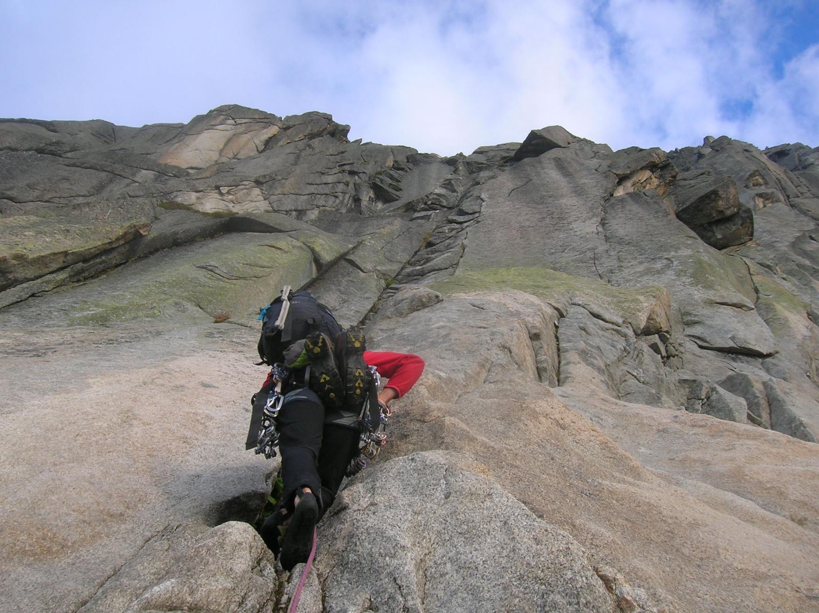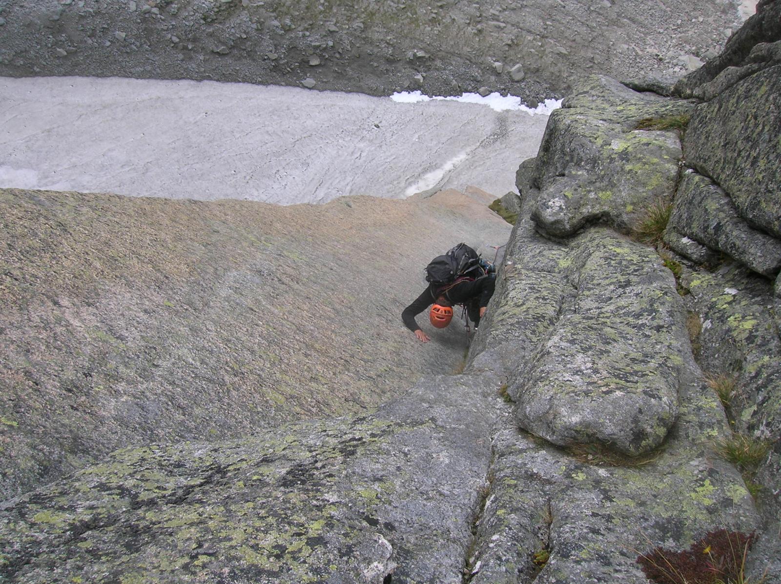 - – 5 tiro: dalla sosta andare decisamente a destra contornando una costola, quindi risalire la rampa canale in diagonale a sinistra cercando il terreno più facile in direzione di un diedro evidente, posto sulla parete quasi dritta sopra la sosta, allo sbocco del canale che scende da sinistra. Nessuna protezione intermedia 2 e 3