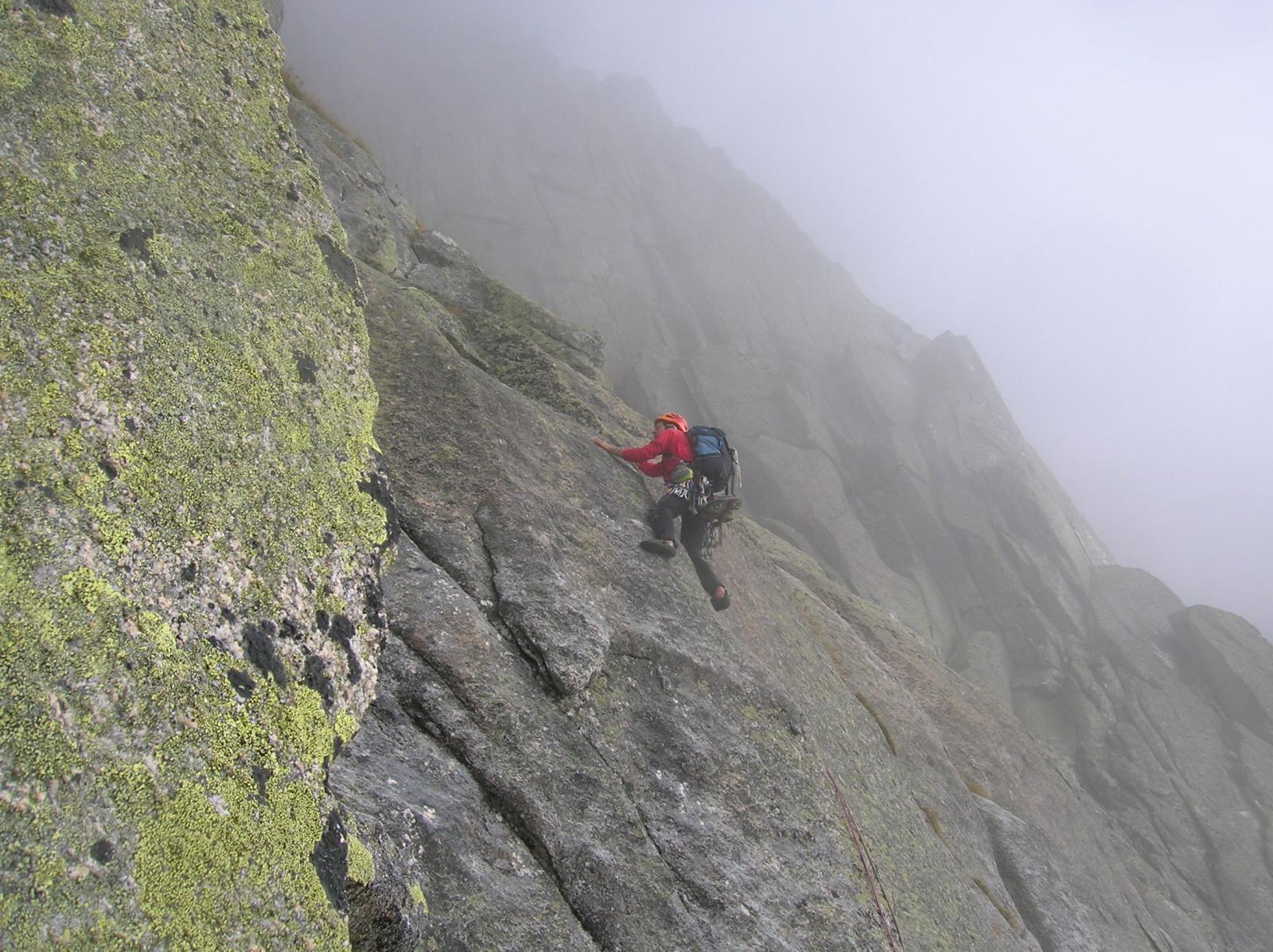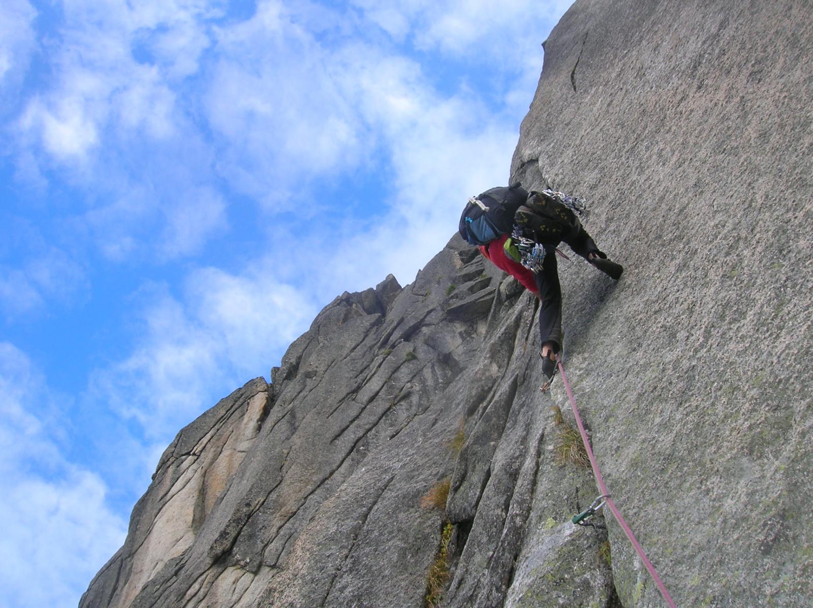 - – 14 tiro: dalla sosta andare a destra, anche se pare più invitante a sinistra, fino a trovare un chiodo, da lì piegare a sinistra, ormai nei pressi della cresta sommitale.