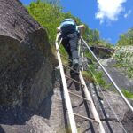 Si percorre un breve tratto di strada asfaltata in direzione Premia per poi girare a dx su una sterrata che si segue fino a un bivio nei pressi di una cascata dove si va a sx (scritta in vernice “bacino e fiume”). Qua inizia il sentiero che risale una parete rocciosa con l’ausilio di gradini di pietra e di un paio di scalette metalliche (mancorrenti sempre presenti). Finito il tratto più spettacolare si va a dx a un bivio (scritta su un muro “Fiume”) fino a raggiungere l’Alpe Fiume. Si va a dx perdendo circa 200 metri di dislivello fino a portarsi nei pressi di una cascata (guado difficoltoso in caso di forte portata d’acqua). Superato il corso d’acqua, si risale ripidamente nel bosco, si supera l’Alpe Altiaccio e dopo poco si incrocia a quota 1450 (altitudine massima della gita) il sentiero che sale al Passo del Muretto. Si scende a dx, si passa il nucleo di baite di Morando e subito dopo si raggiunge Salecchio Inferiore (m.1320). Volendo da qua si può raggiungere Salecchio Superiore in circa 30′ (d+205 metri). Si segue l’evidente sentiero in discesa (indicazioni “Passo”) che converge poi sulla strada asfaltata che ci riporta sulla statale di fondovalle. La seguiamo per pochi metri a dx per poi attraversare il Toce e seguire il sentiero che corre parallelo al fiume. Si riattraversa il corso d’acqua su un ponte metallico che ci porta alla località San Rocco (chiesa e cimitero). Da qua si segue la strada asfaltata per una decina di minuti fino al punto di partenza. Tempo complessivo indicativo 4h 30′.