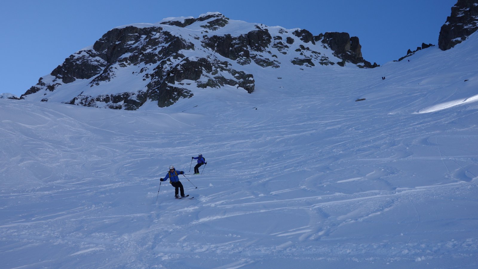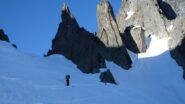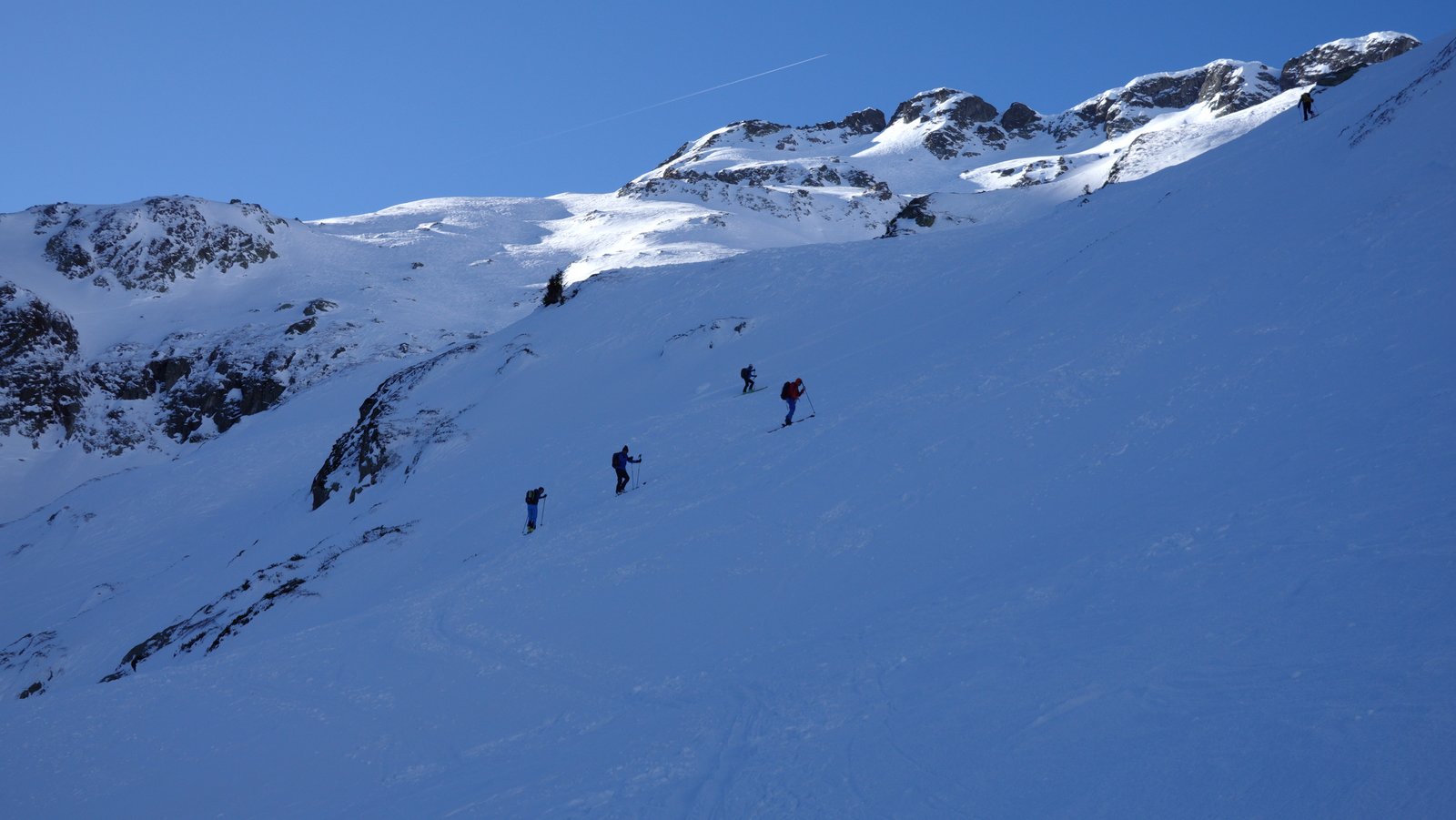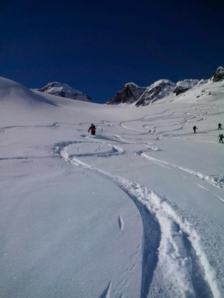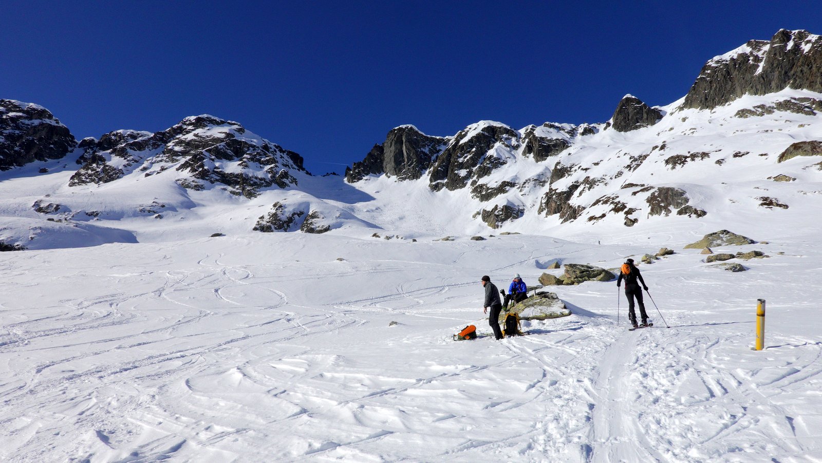 Giunti al pianoro,proseguire sino al fondo del vallone (da qualche parte sotto la neve si trova il Rifugio, sepolto in questa stagione) per innalzarsi verso dx (senso di marcia) su pendii ripidi che portano verso la Brèche. Gli ultimi metri sono ancora più ripidi ed il colletto non è molto spazioso!