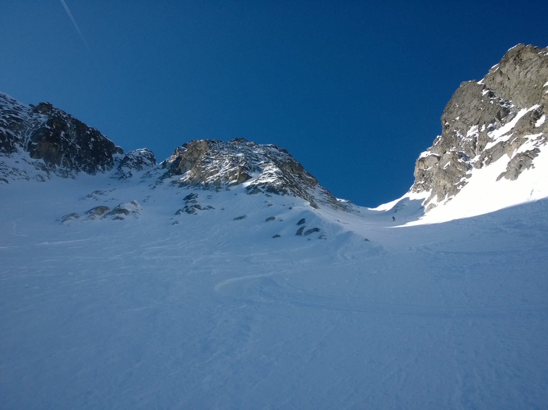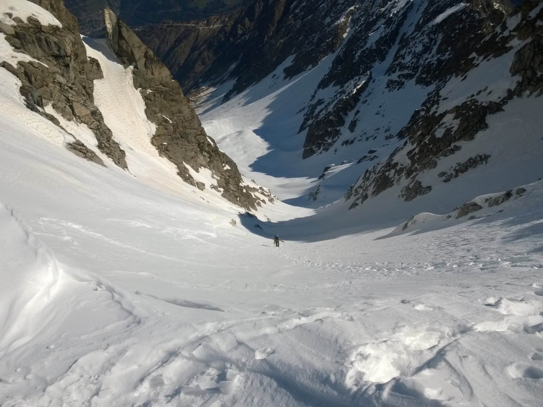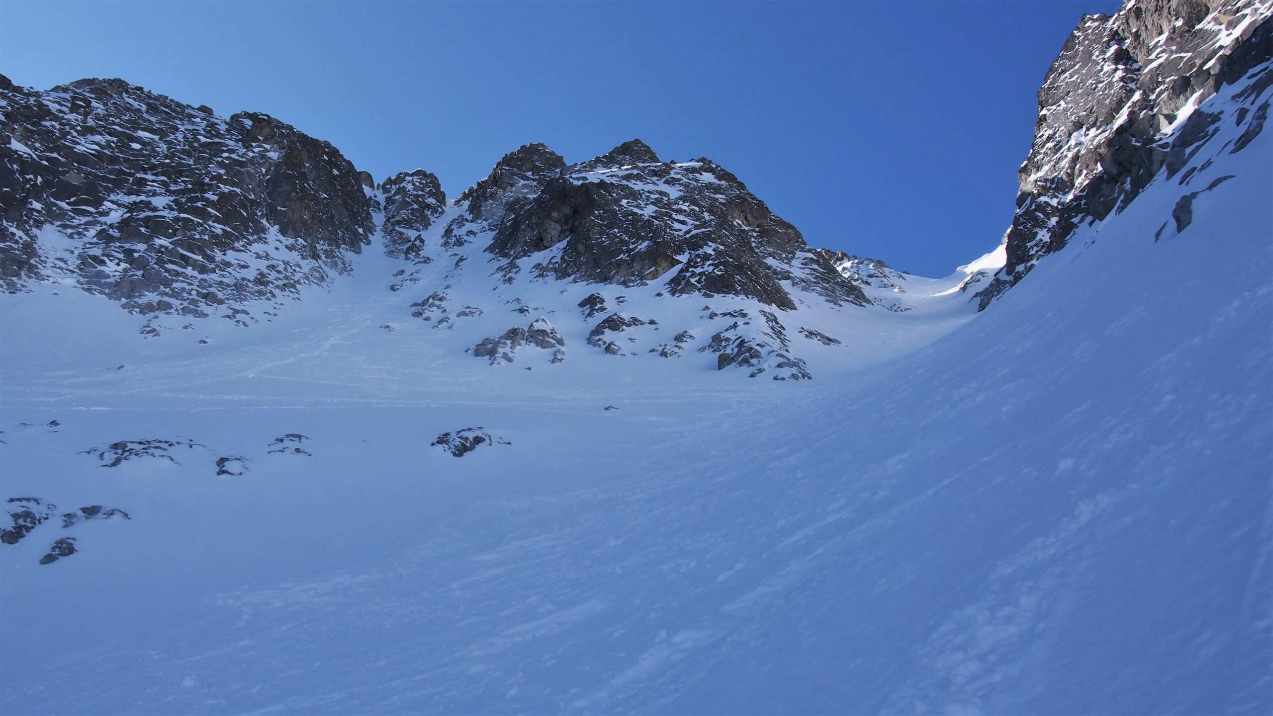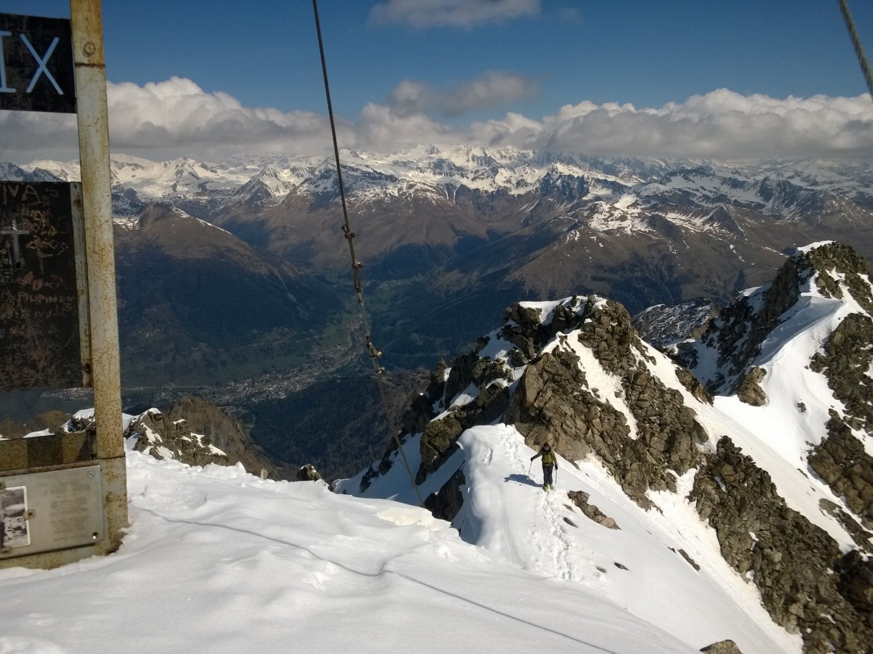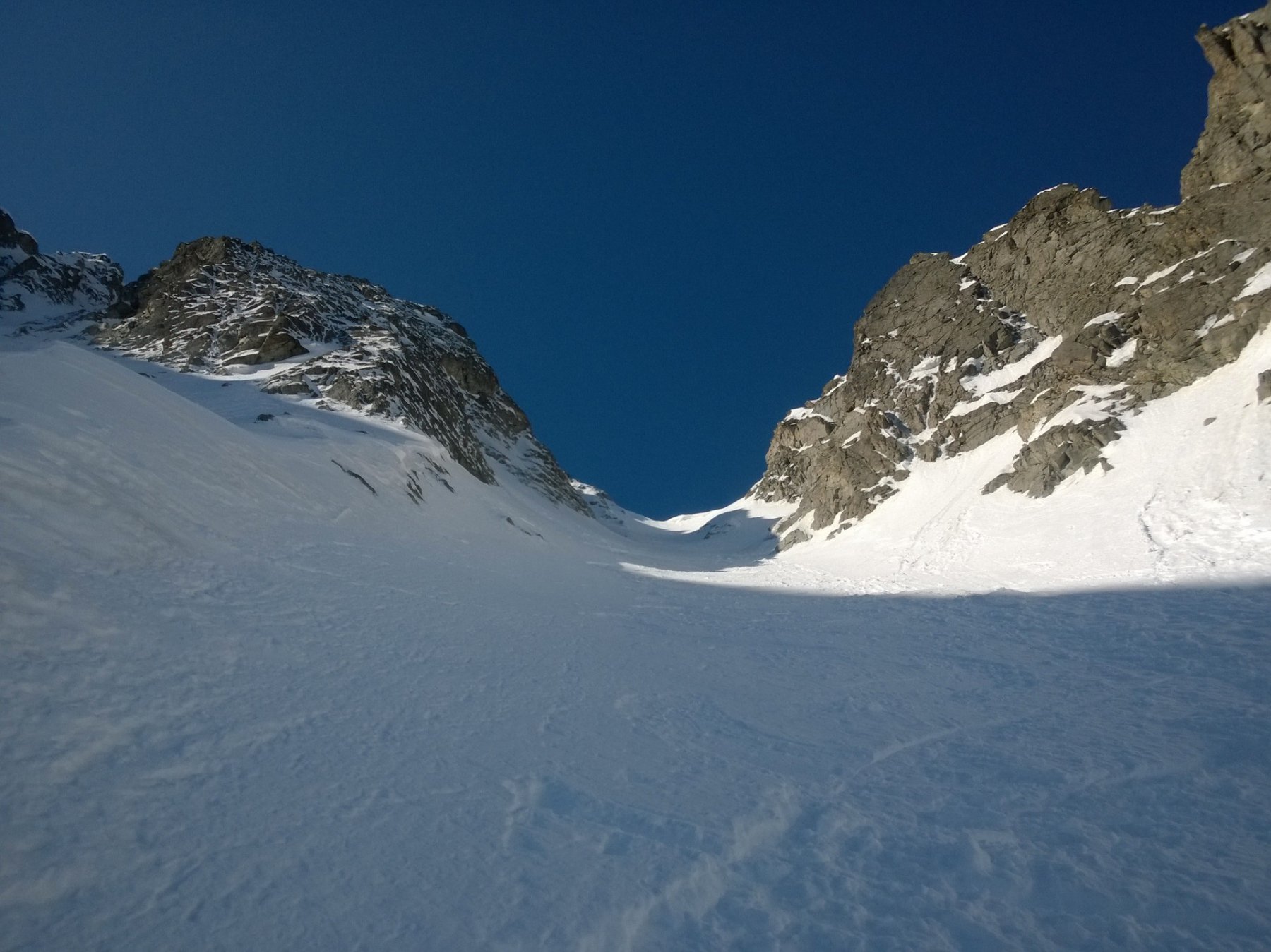 Dalla conca appare evidente la bella Cima di Salimmo con il canalino Faustinelli a sinistra più ripido ( 50-55° ), e il canale più largo ed un po’ meno ripido detto “la pala ghiacciata” ( 45-40° parte alta poi meno )salire fino a quando le condizioni lo consentono con gli sci poi con i ramponi fino al colletto con cornice in uscita e con facile e corta cresta verso destra si raggiunge la croce di vetta.