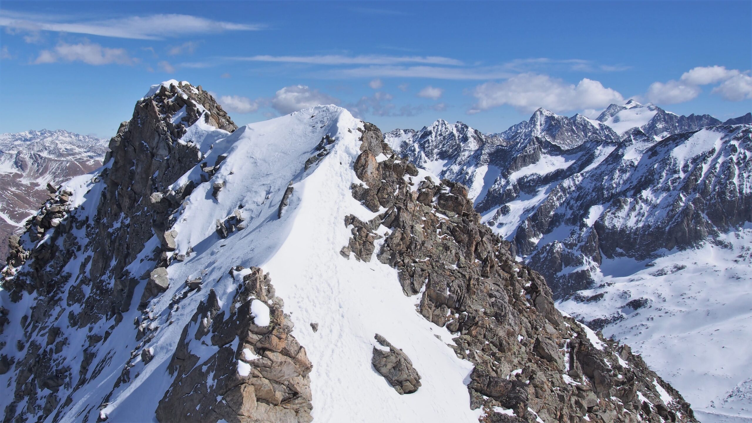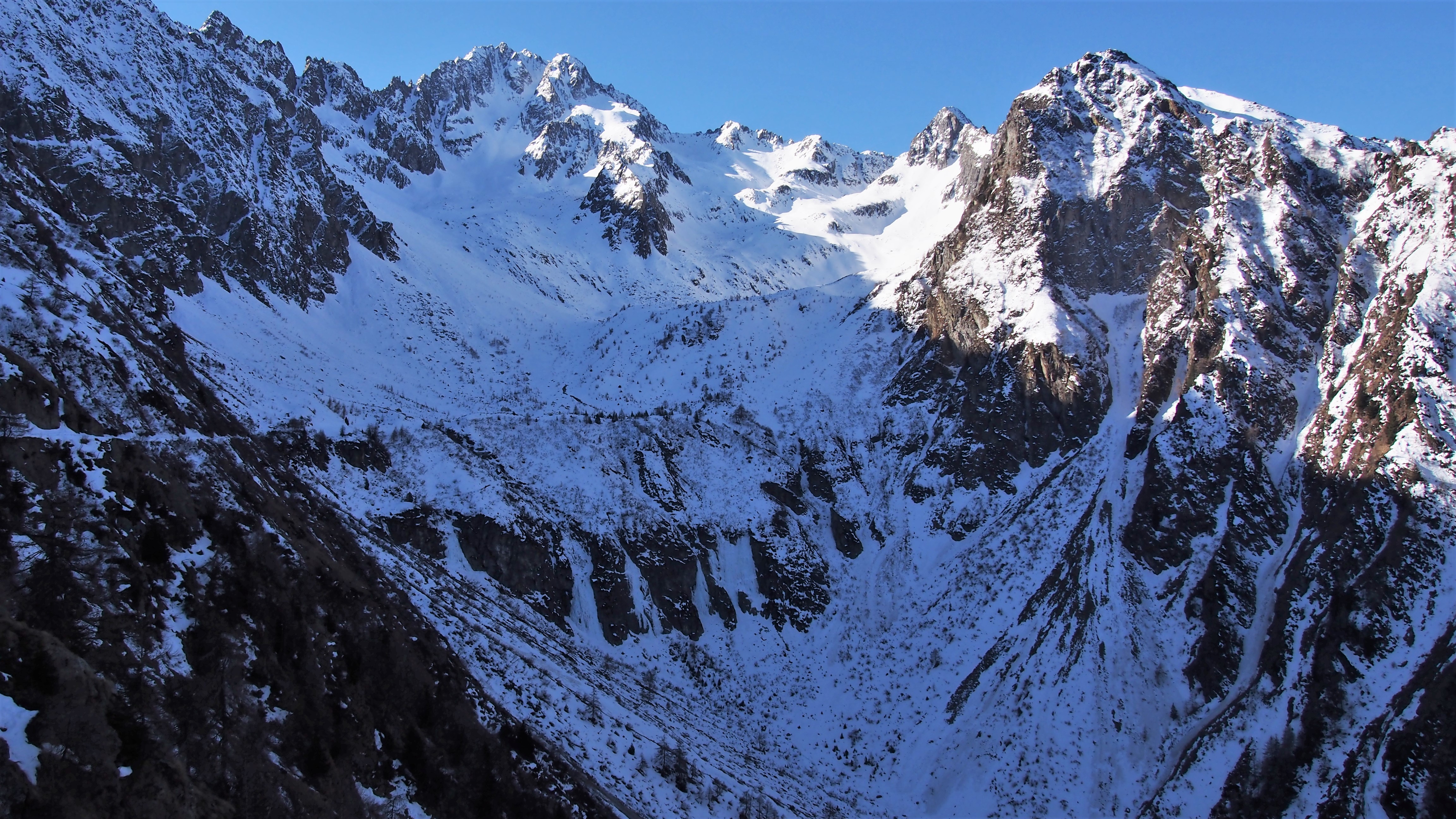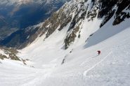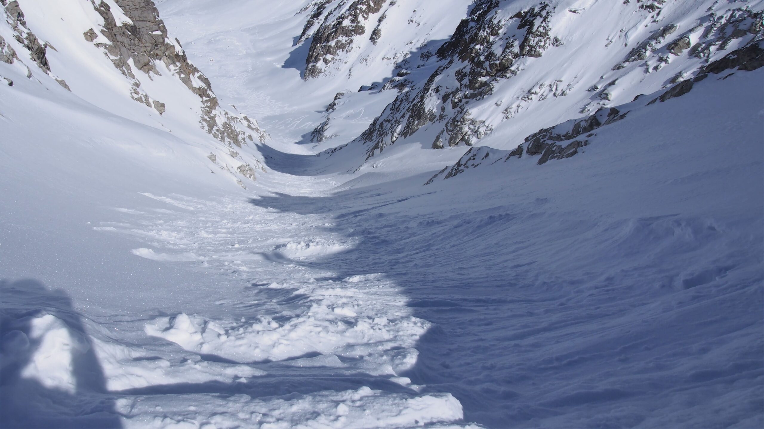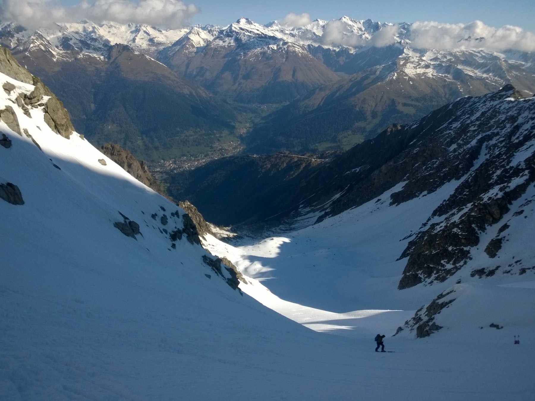 Dalla conca appare evidente la bella Cima di Salimmo con il canalino Faustinelli a sinistra più ripido ( 50-55° ), e il canale più largo ed un po’ meno ripido detto “la pala ghiacciata” ( 45-40° parte alta poi meno )salire fino a quando le condizioni lo consentono con gli sci poi con i ramponi fino al colletto con cornice in uscita e con facile e corta cresta verso destra si raggiunge la croce di vetta.
