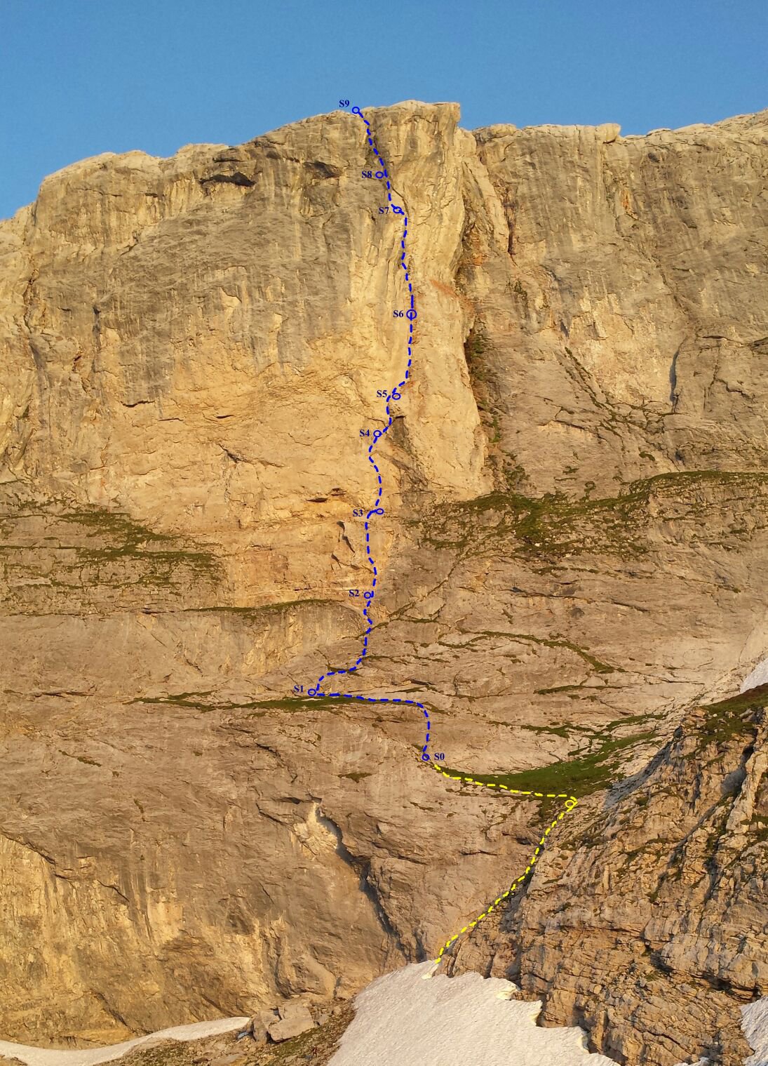 La via supera la fredda e selvaggia parete NW, sotto la verticale della vetta, a metà tra lo spigolo NE e la via Mattioli, prima sulle placche basali e poi lungo una fessura che solca l’aggettante pilastro giallo. La qualità della roccia, in alcuni tratti, richiede attenzione.