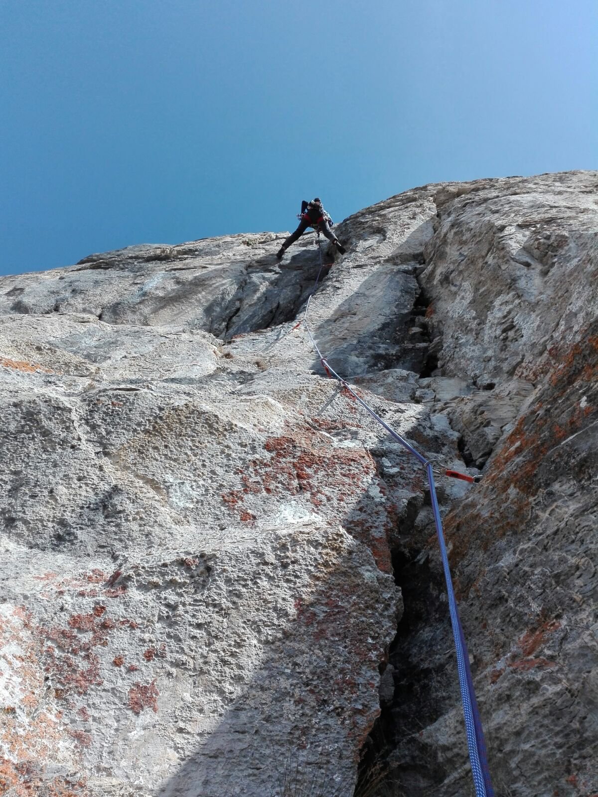 - L6 40 mt fessura diedro strapiombante (6c) poi fessura verticale (6b) – 7 fix integrabile con friend fino al n.3.