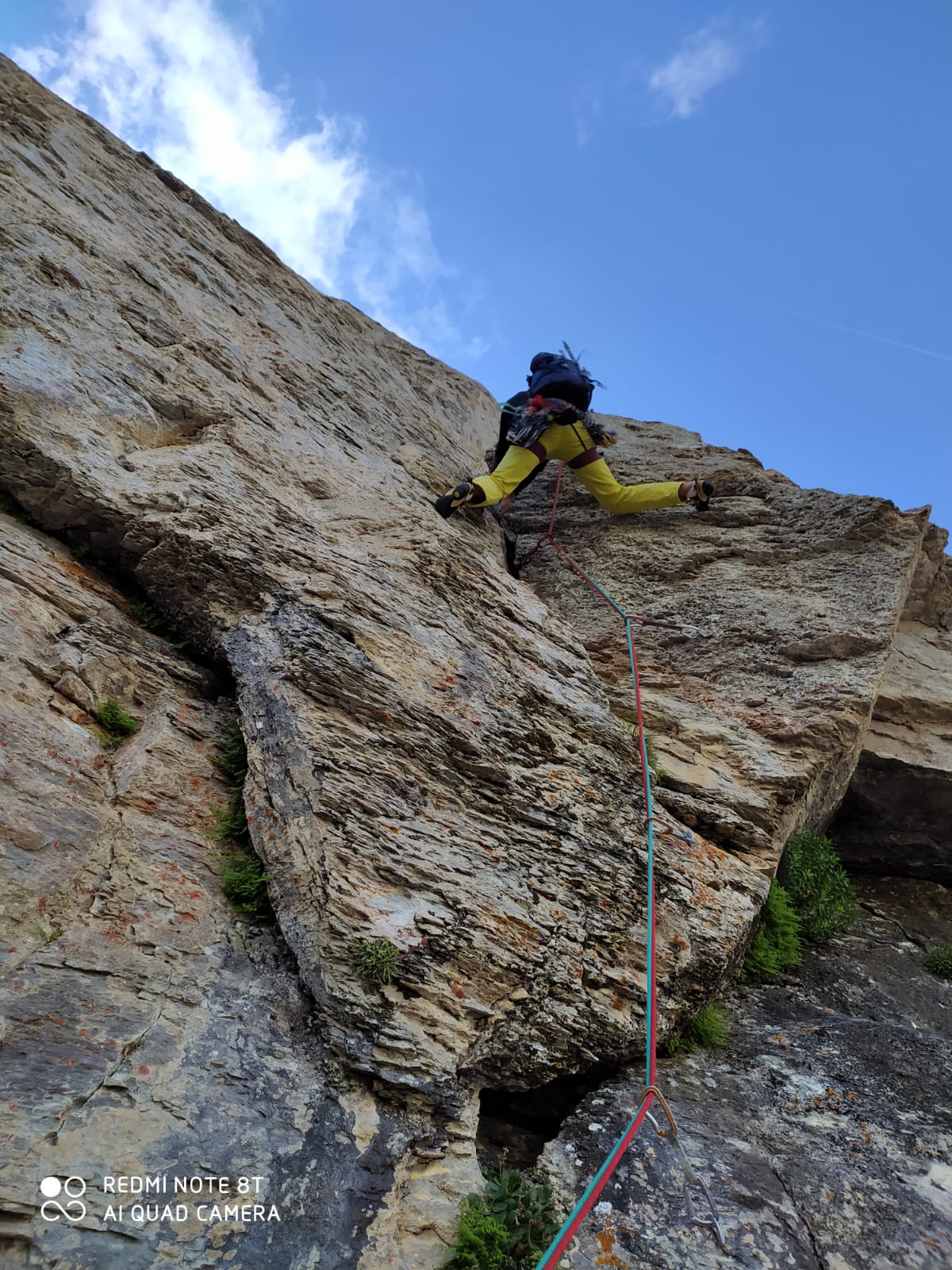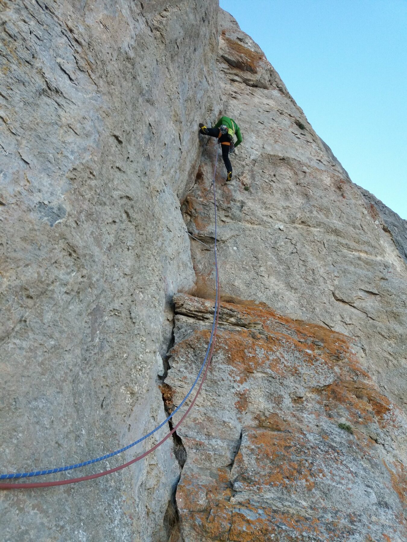 - L9 35 mt pancette e risalti con passo difficile (7a+ ) poi bel diedro ammanigliato, un po’ di erba all’inizio. (6b) fino all’uscita dal pilastro: 9 fix, friend medio piccoli.