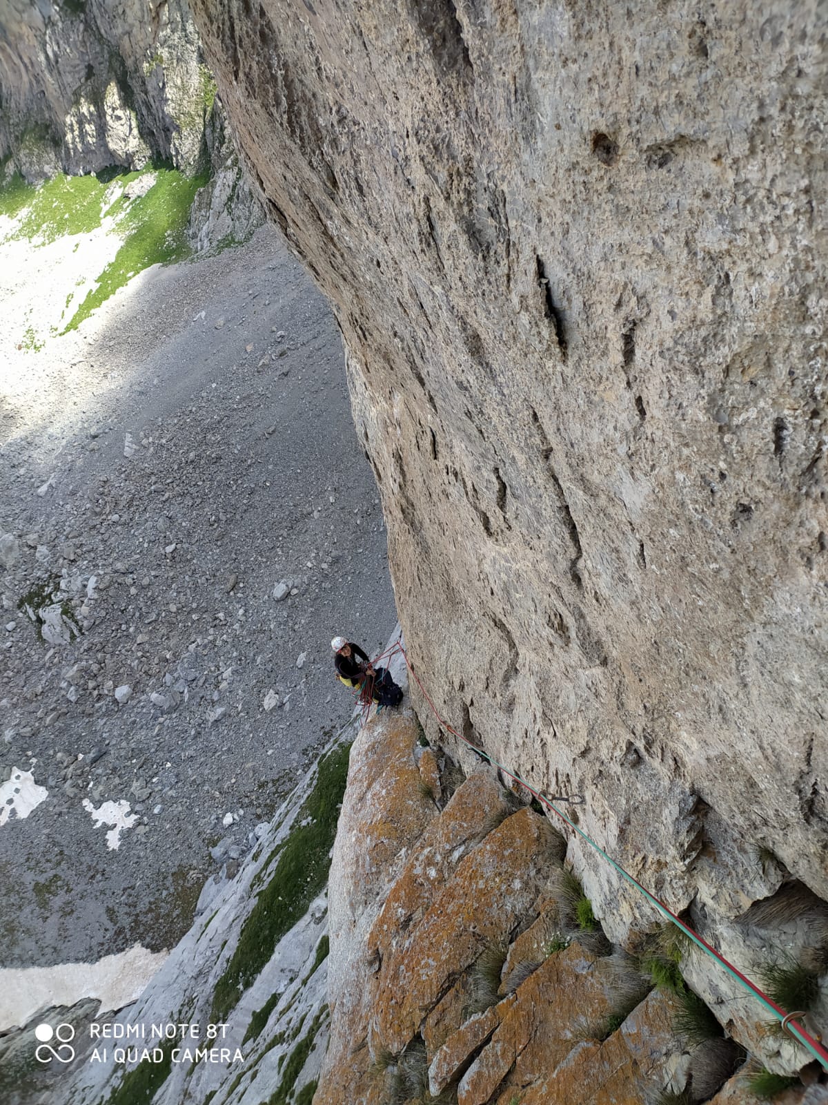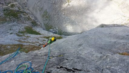 Traversare 50 metri a sinistra sulla cengia erbosa, facile ma esposta (1 chiodo all’inizio) fino alla sosta 0.