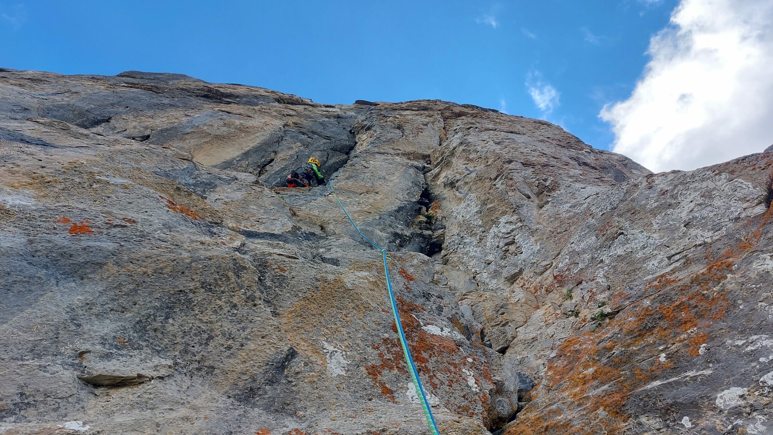 - L4 25 mt bel diedro chiuso da strapiombetto (6a+) poi breve placca liscia (A0 passaggio non liberato) fino in sosta – 4 fix e friend medi