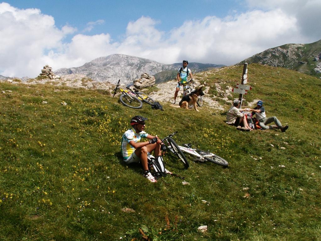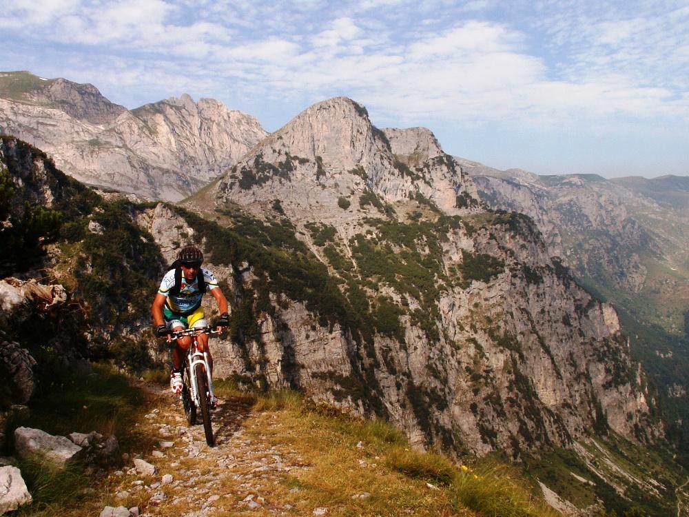 Si prosegue in sella, spettacolari, lunghi tornanti nel muro finale, incantevole anfiteatro dolomitico, sino quota 1900 m, ultimo tornante ove a breve si spalanca L’alta valle Pesio dominata dall’imponenete parete nord del Marguareis. A breve spingendo si giunge al Passo del Duca 1989 m, libro. Comoda ma breve discesa da fare in sella intervallata da rampetta non pedalabile porta al gias dell’Ortica 1836 m (di solito acqua).