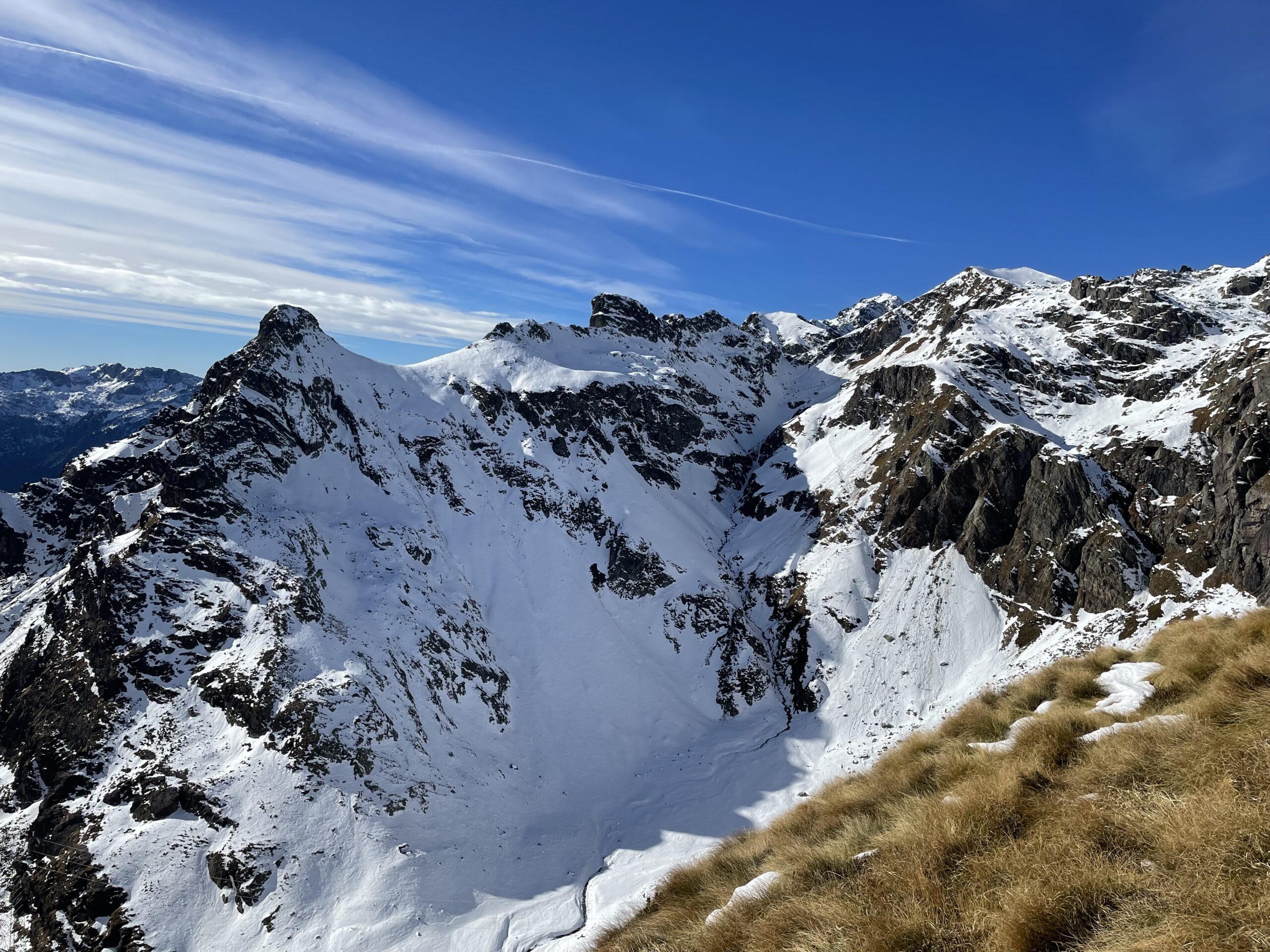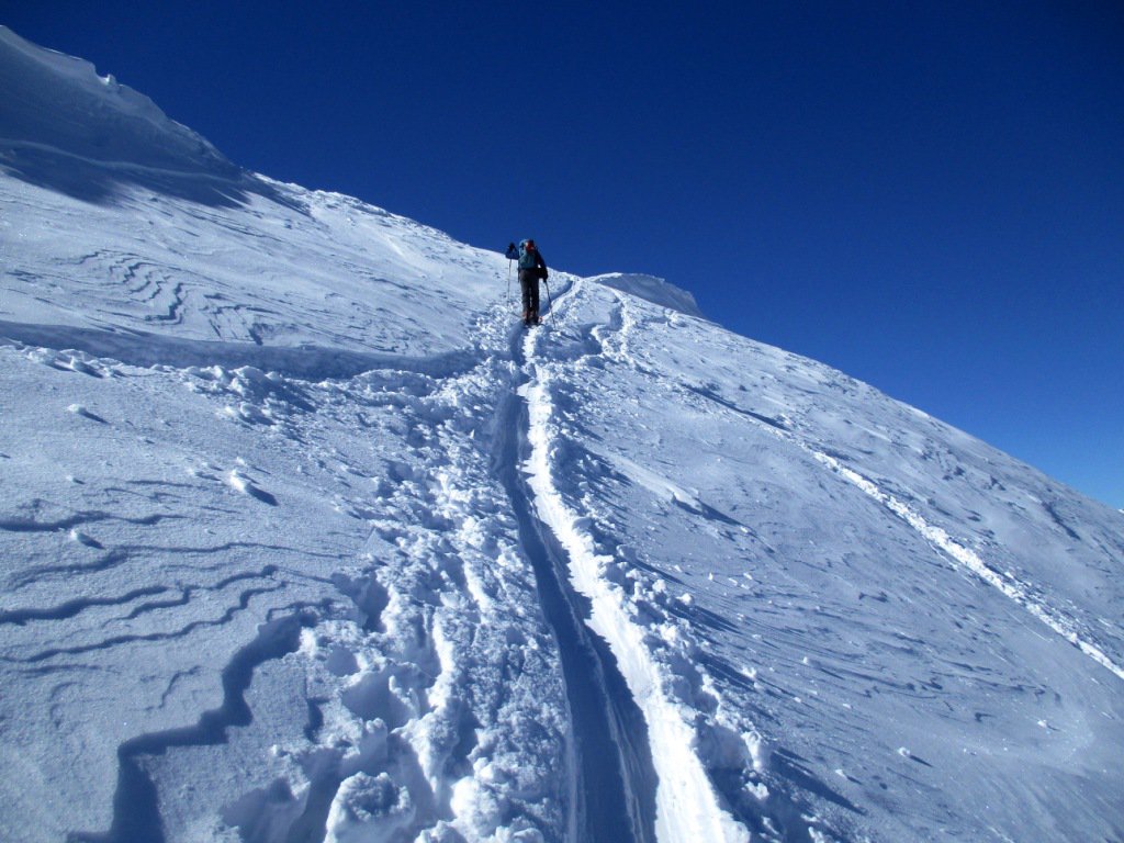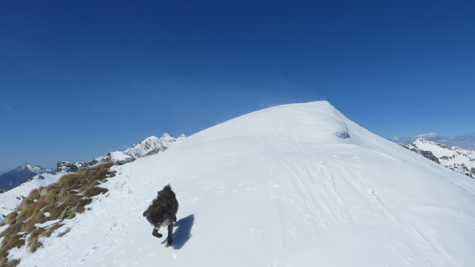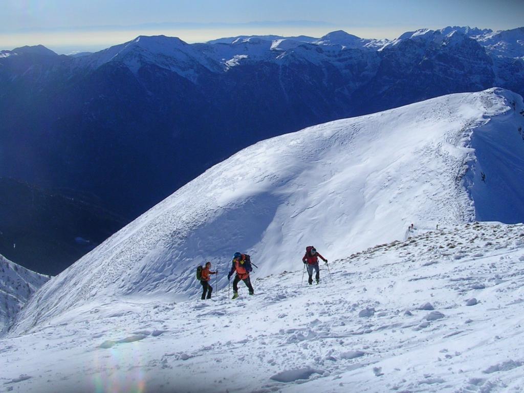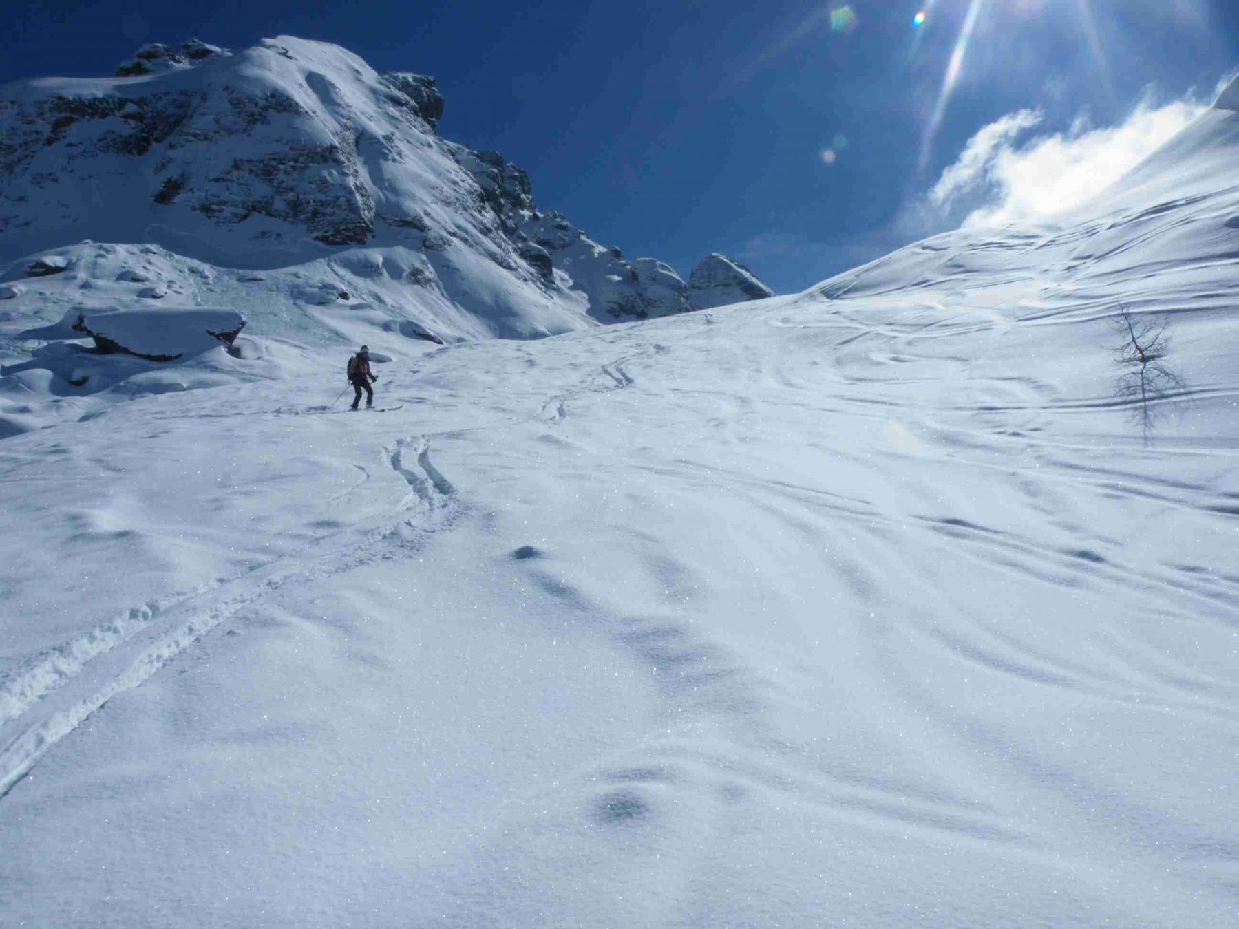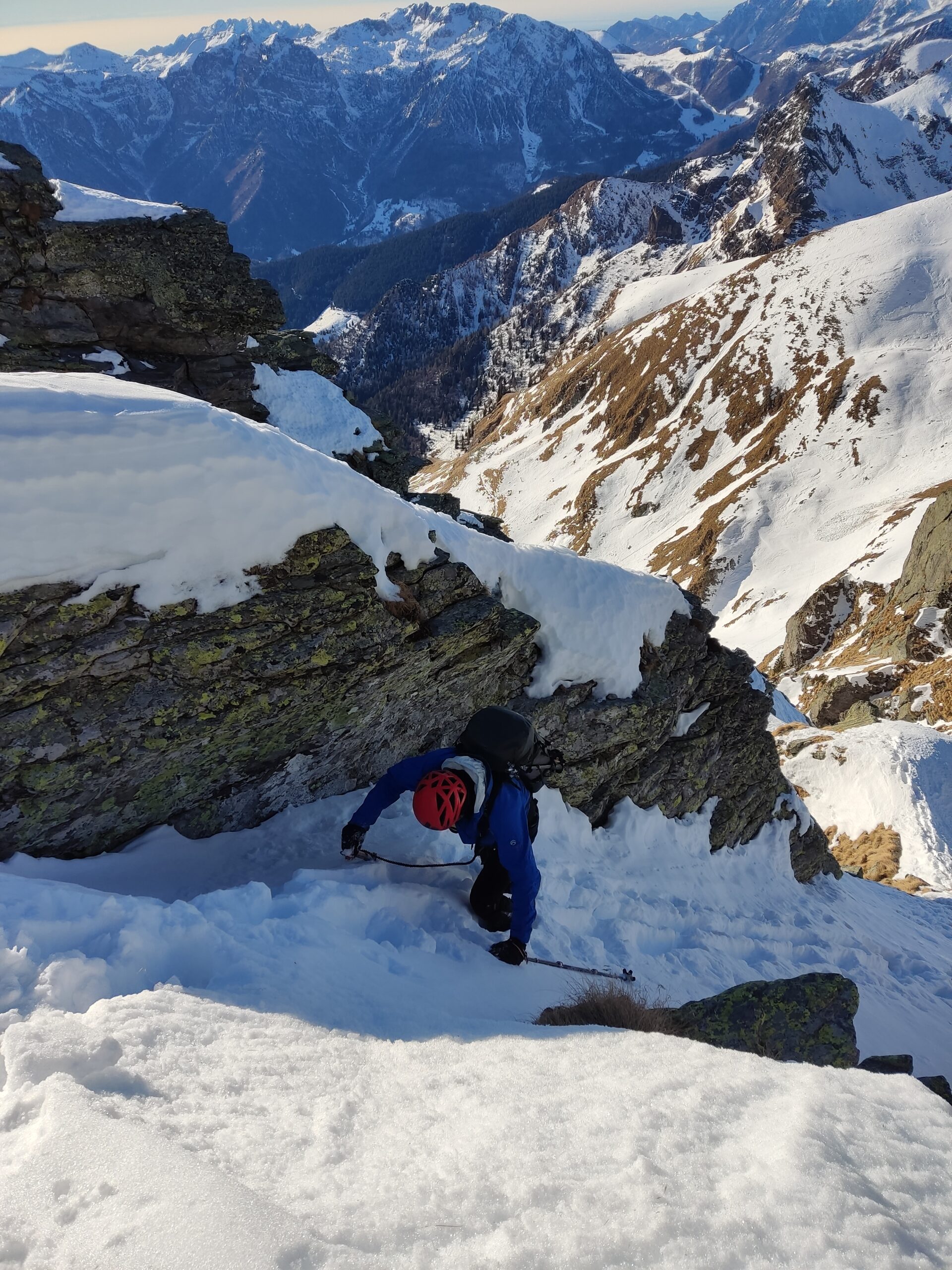 Discesa lungo l’itinerario di salita oppure, con neve sicura, per il versante nord ed un ripido canale che porta sulla via di salita in prossimità delle baite.