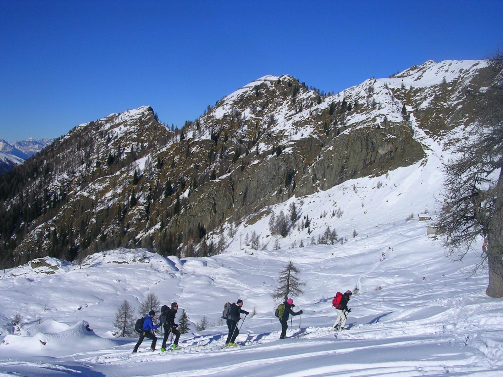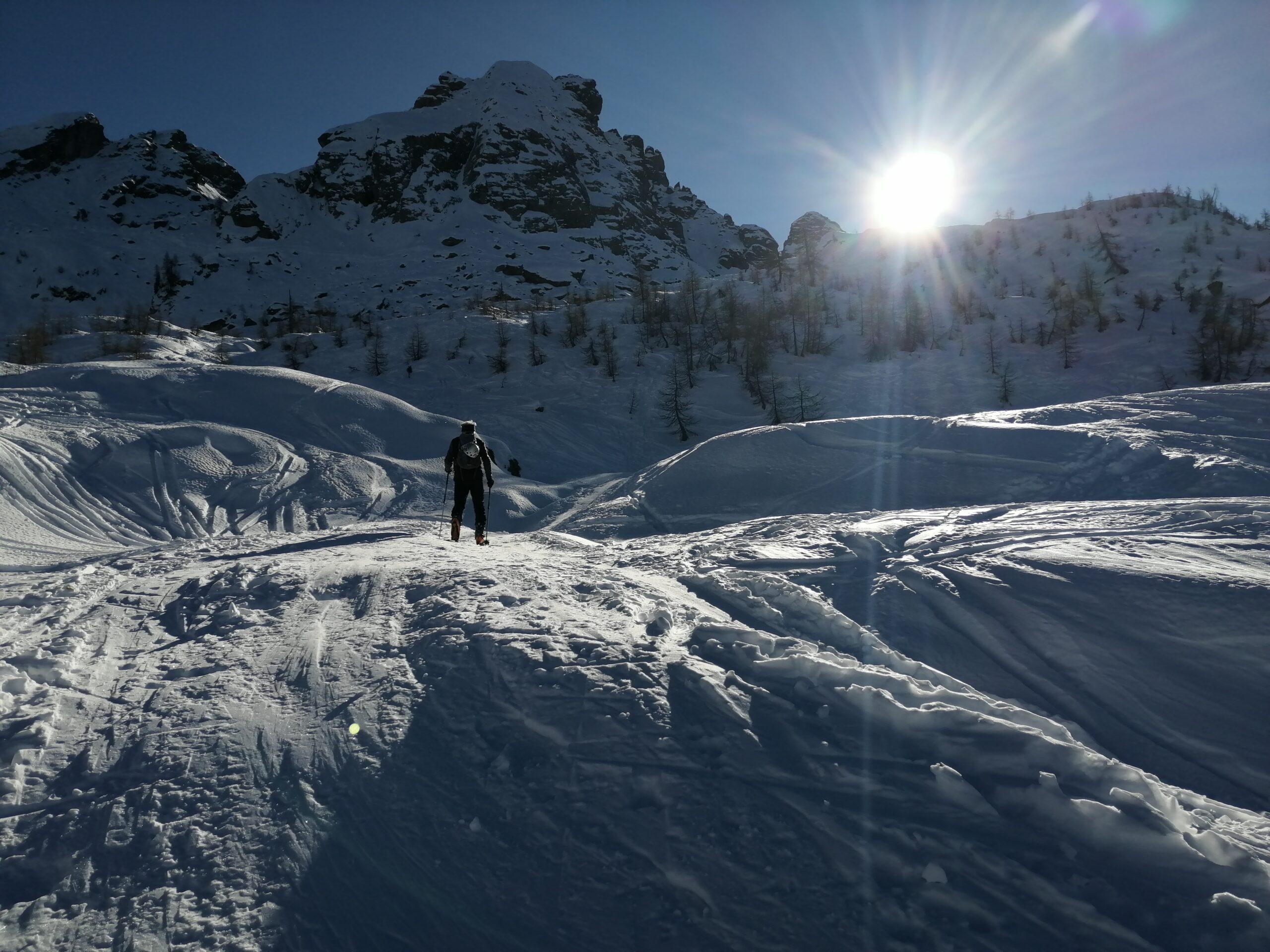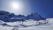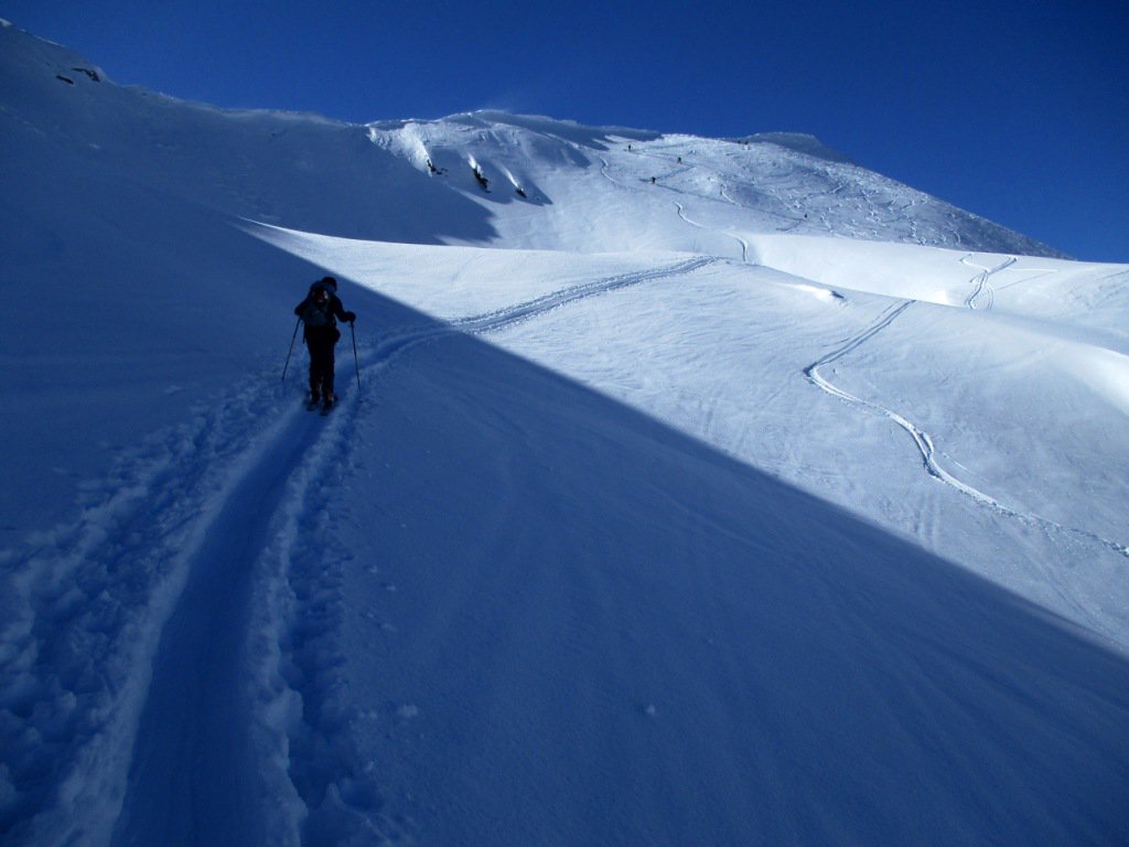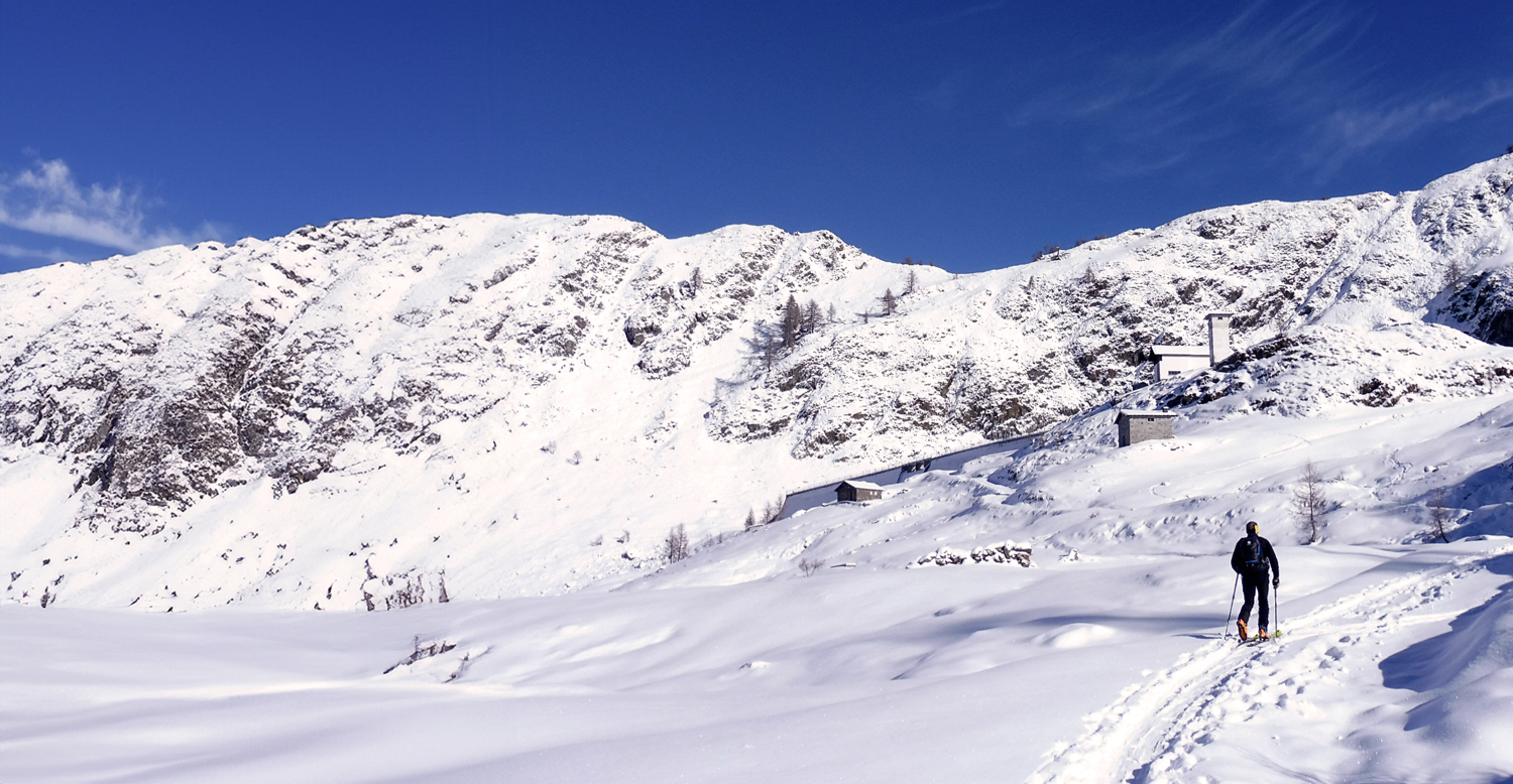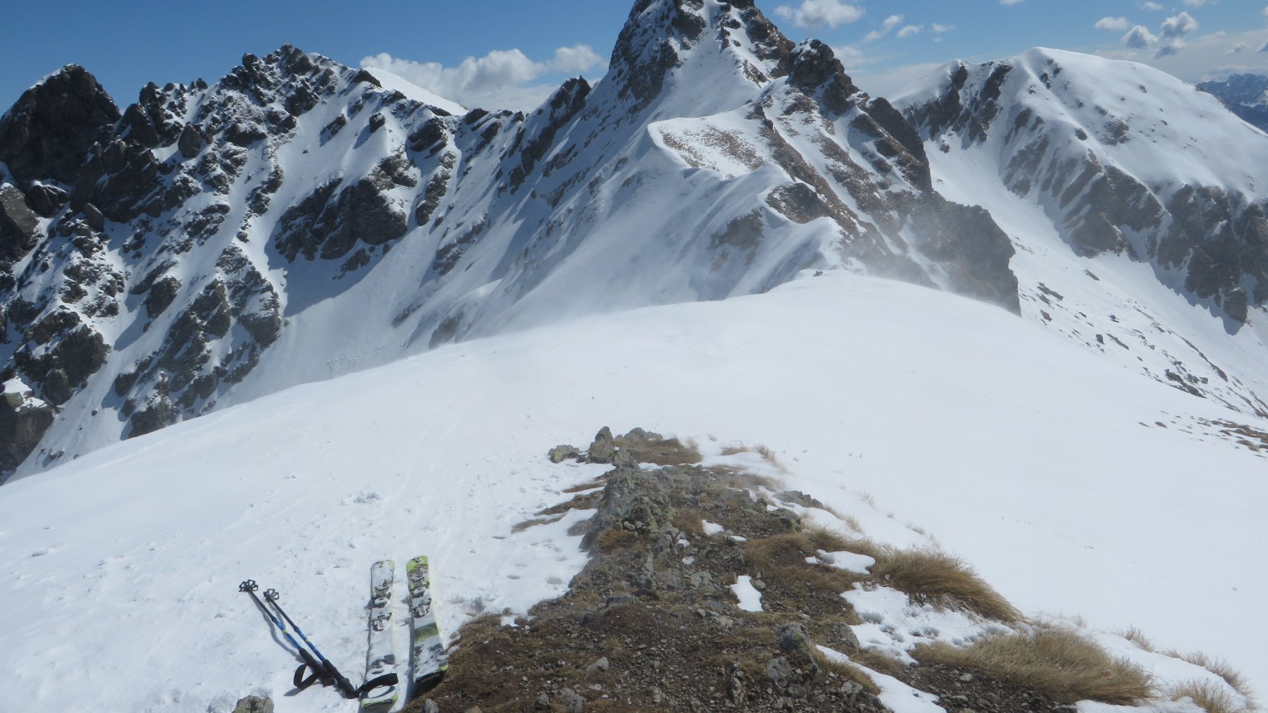 Discesa lungo l’itinerario di salita oppure, con neve sicura, per il versante nord ed un ripido canale che porta sulla via di salita in prossimità delle baite.