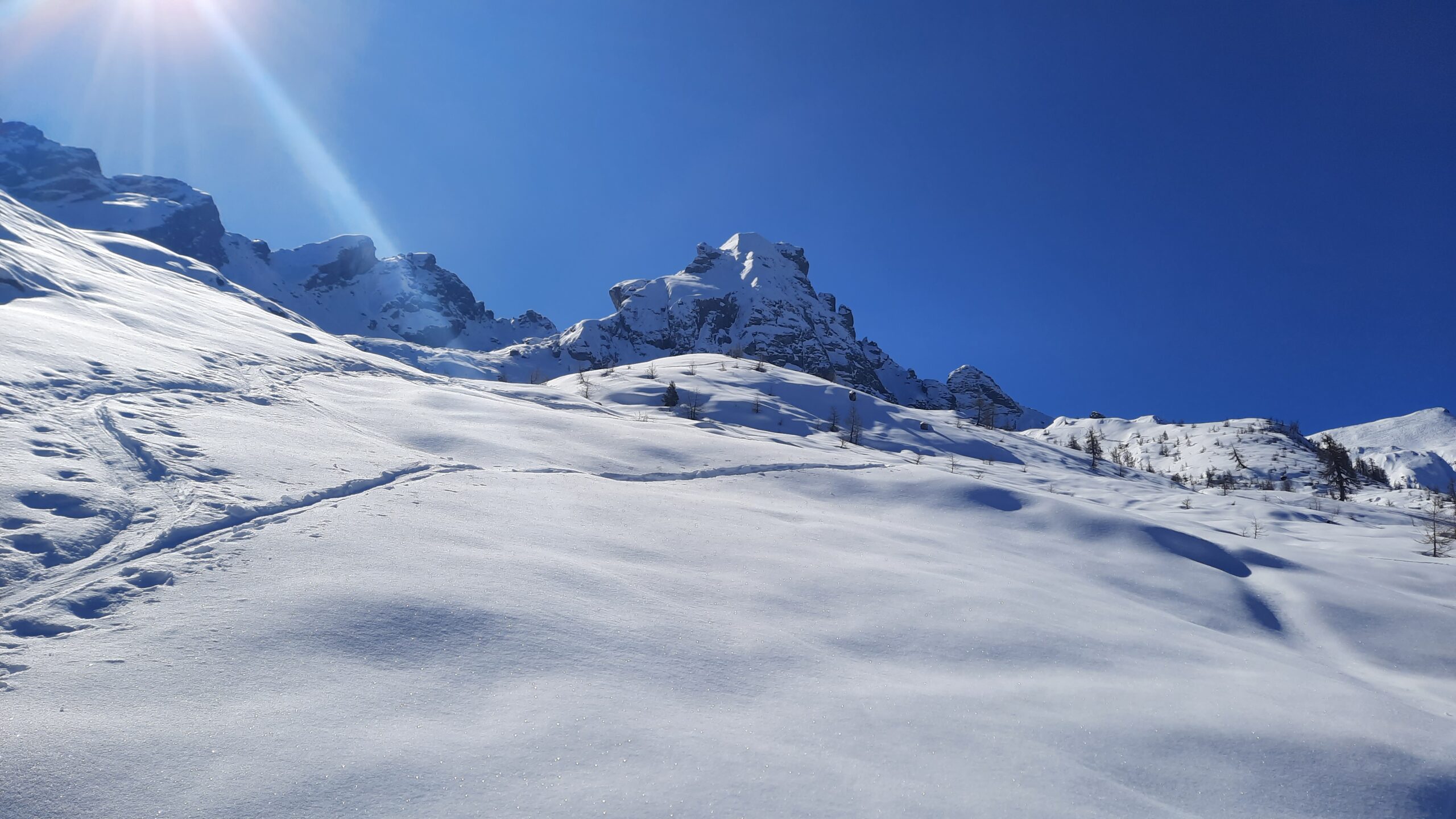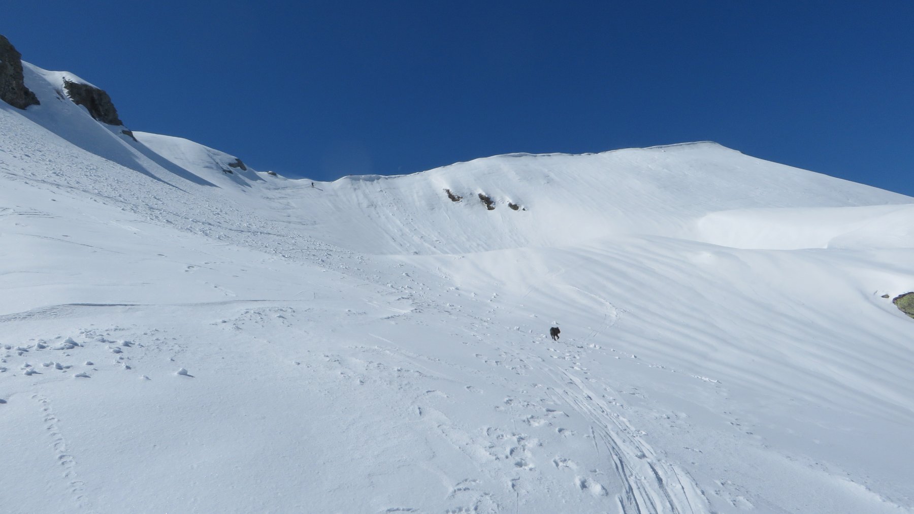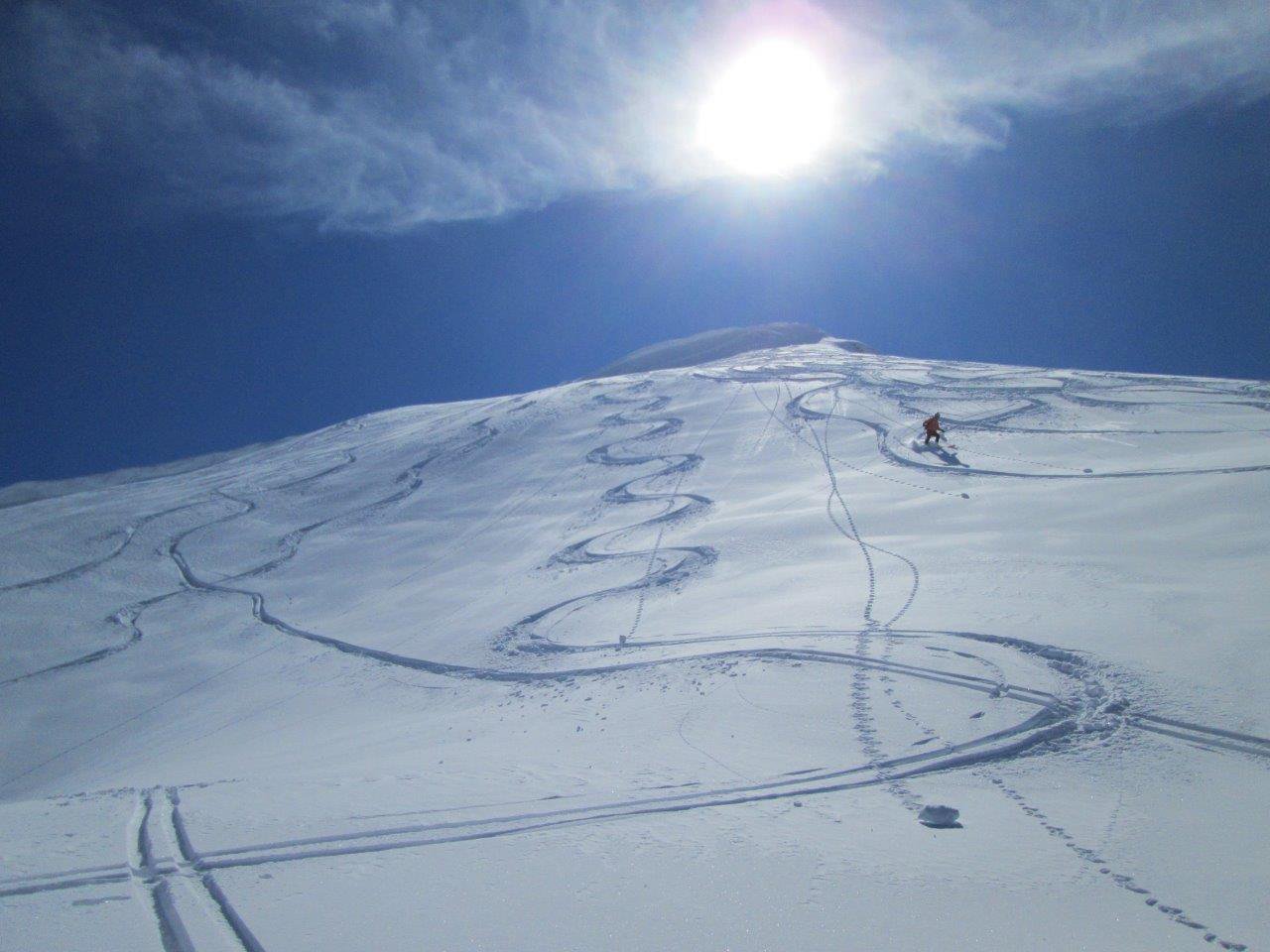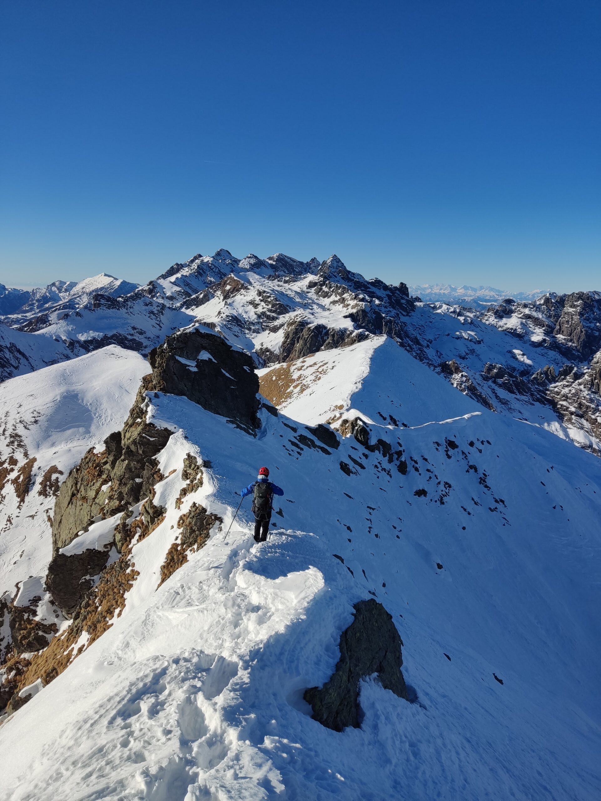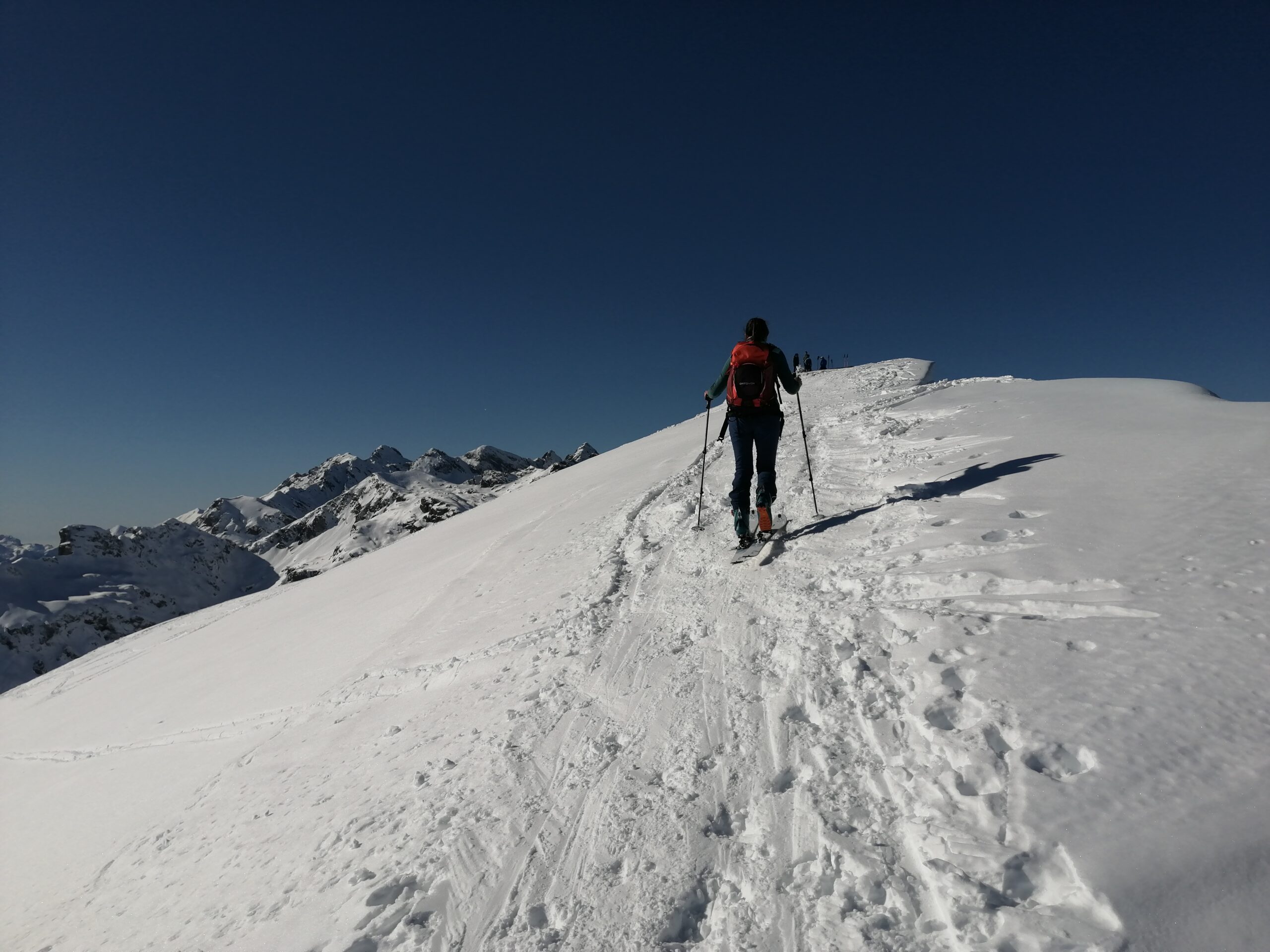 Discesa lungo l’itinerario di salita oppure, con neve sicura, per il versante nord ed un ripido canale che porta sulla via di salita in prossimità delle baite.