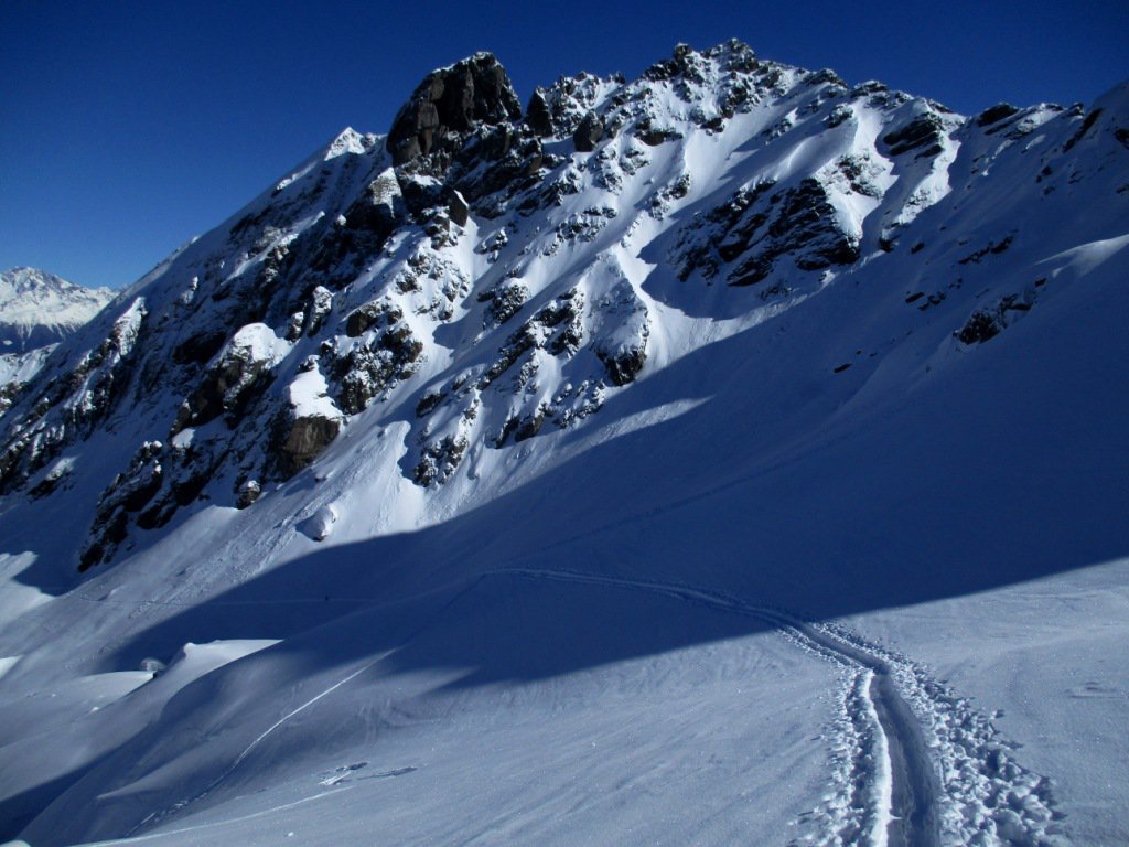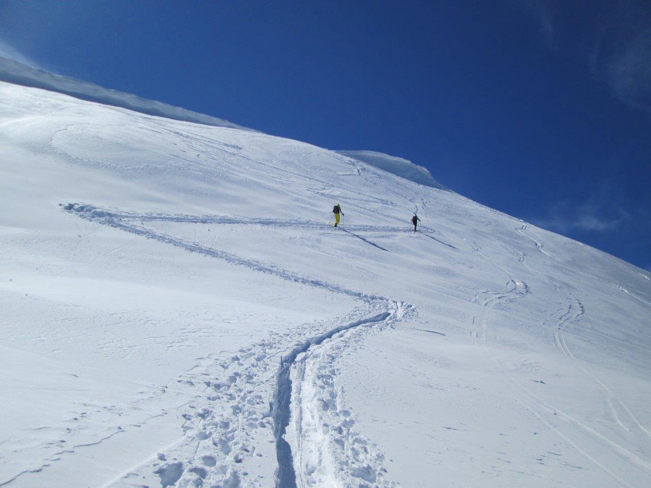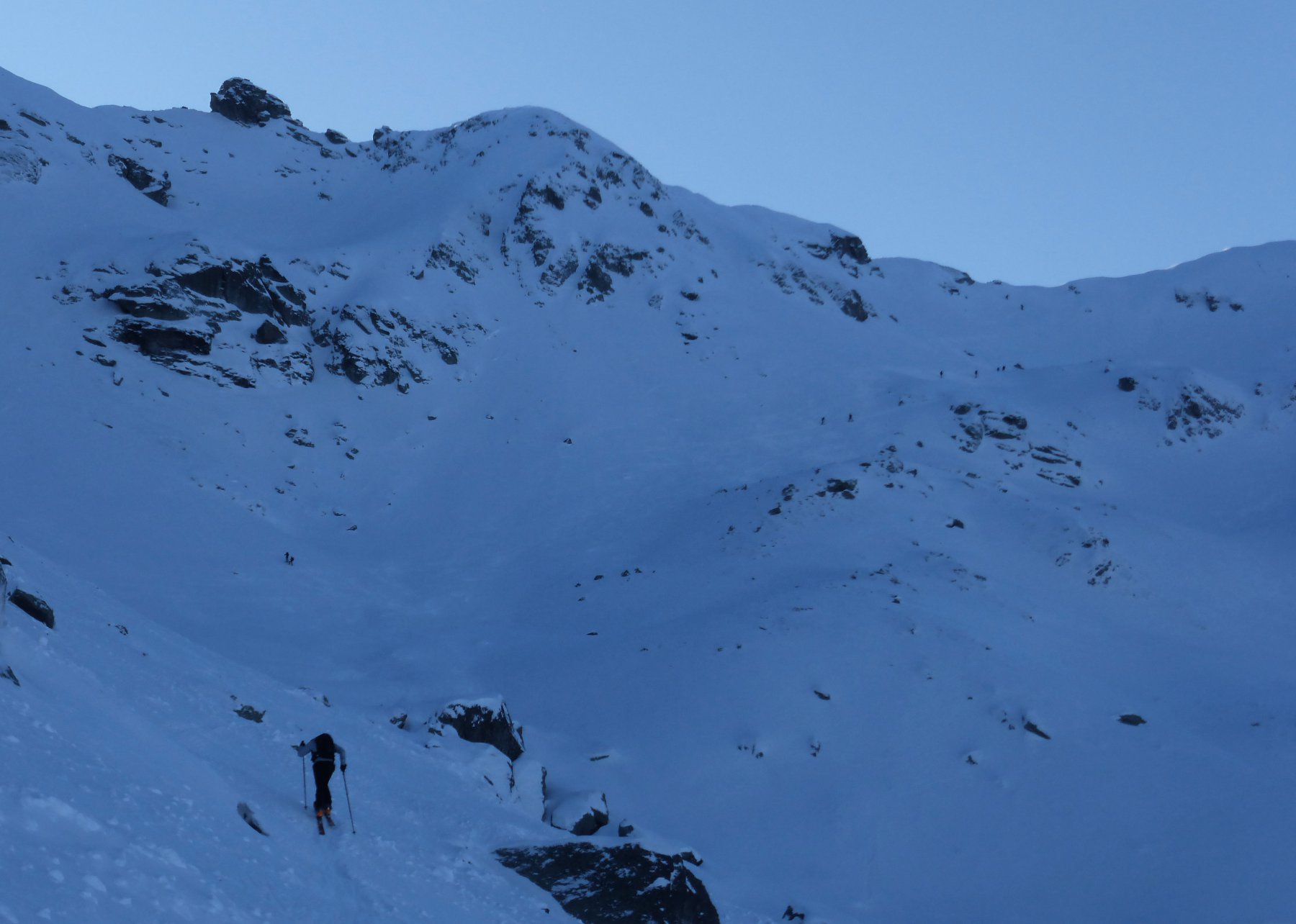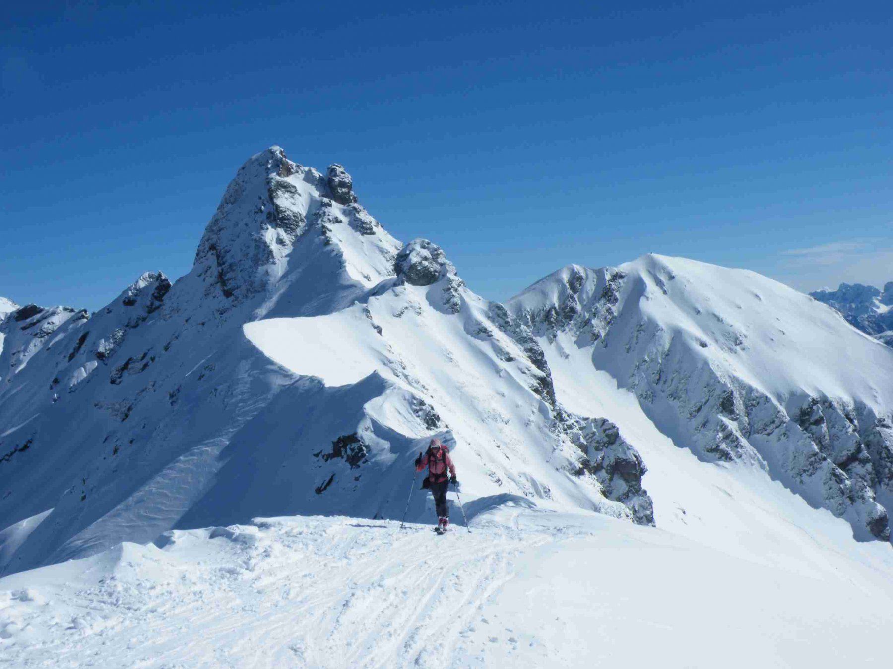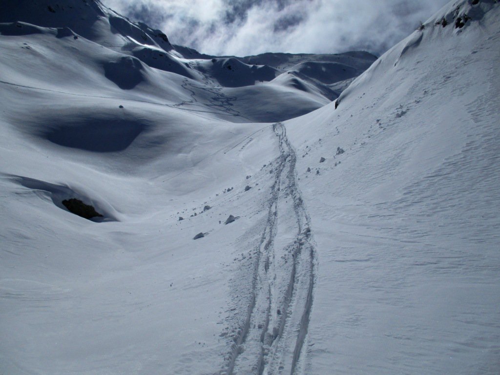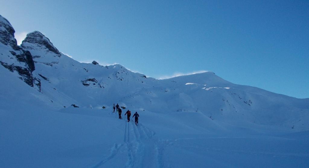 Discesa lungo l’itinerario di salita oppure, con neve sicura, per il versante nord ed un ripido canale che porta sulla via di salita in prossimità delle baite.