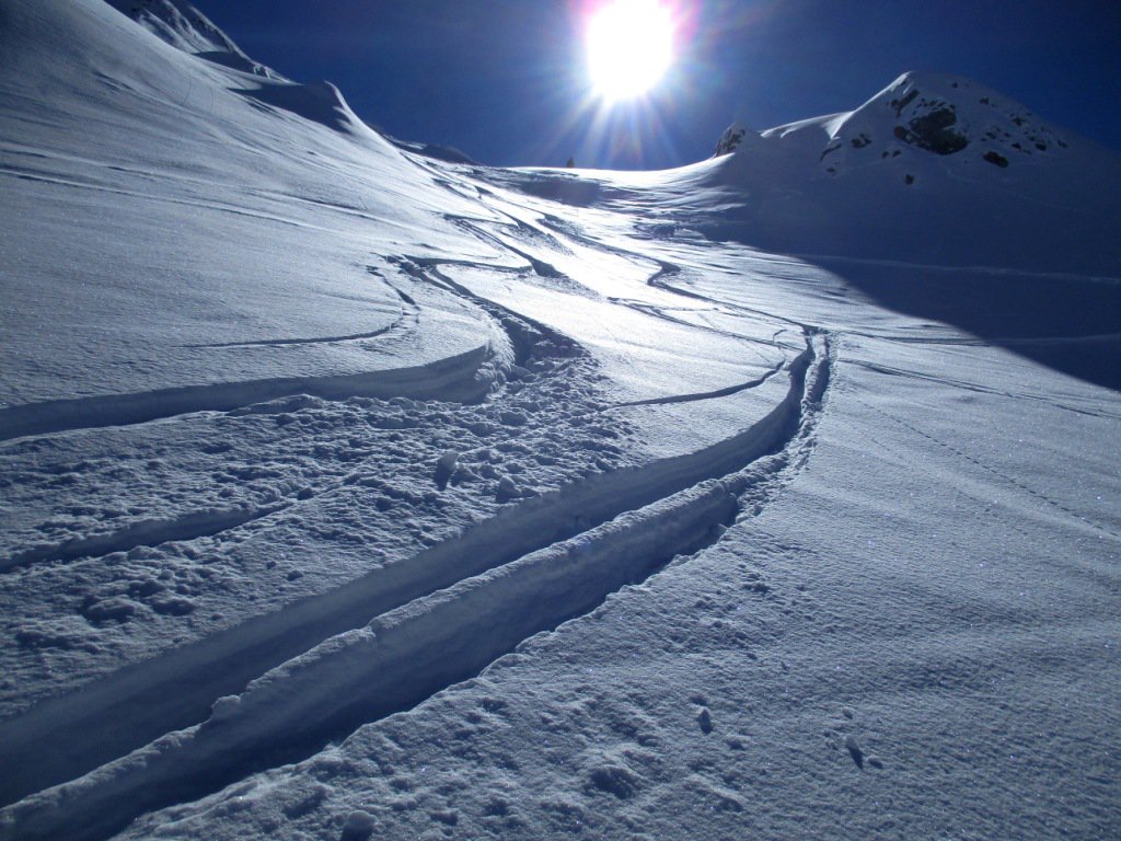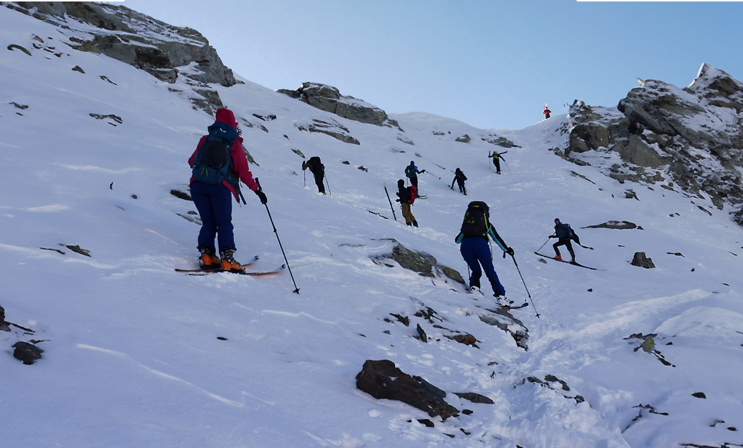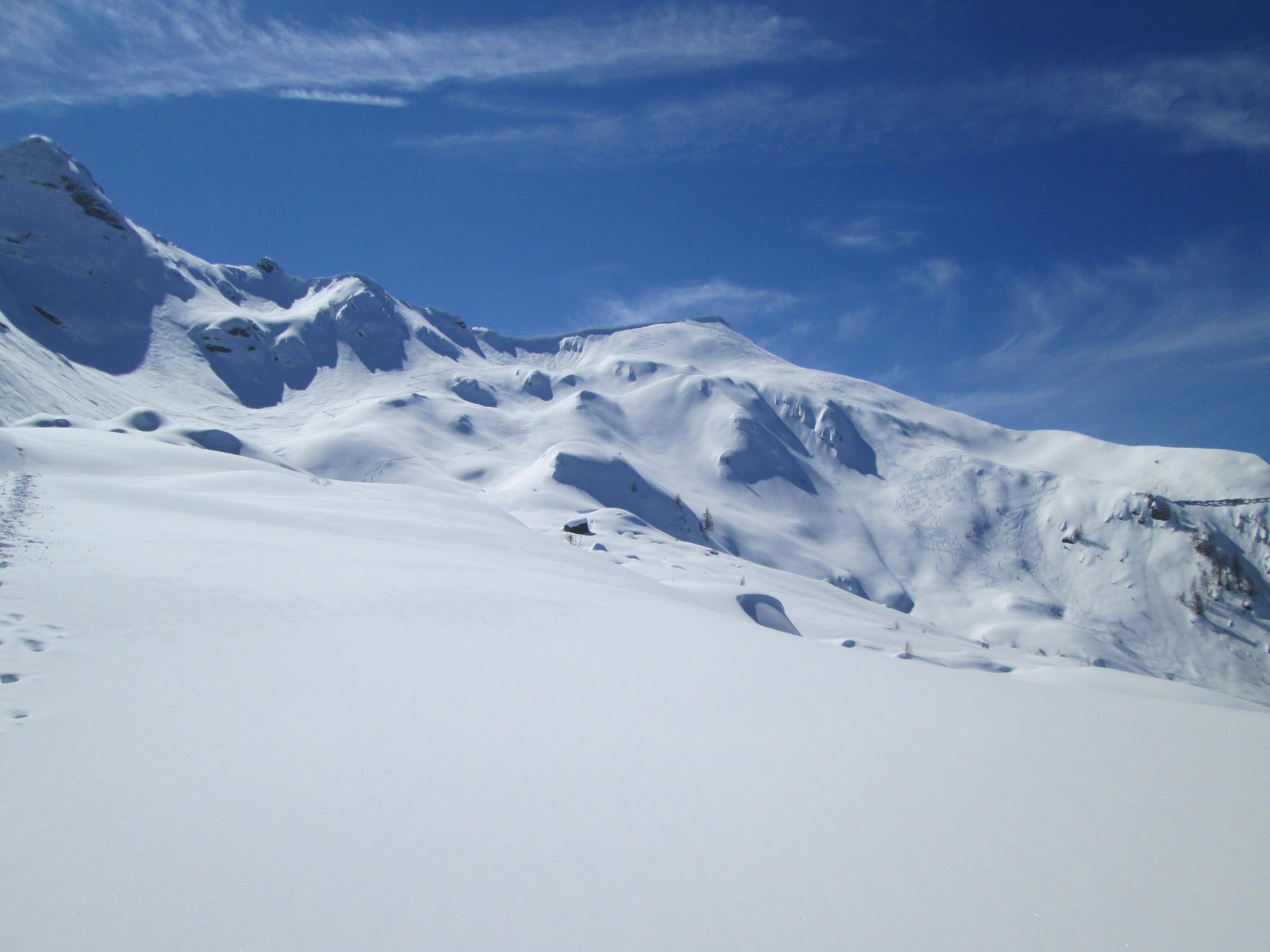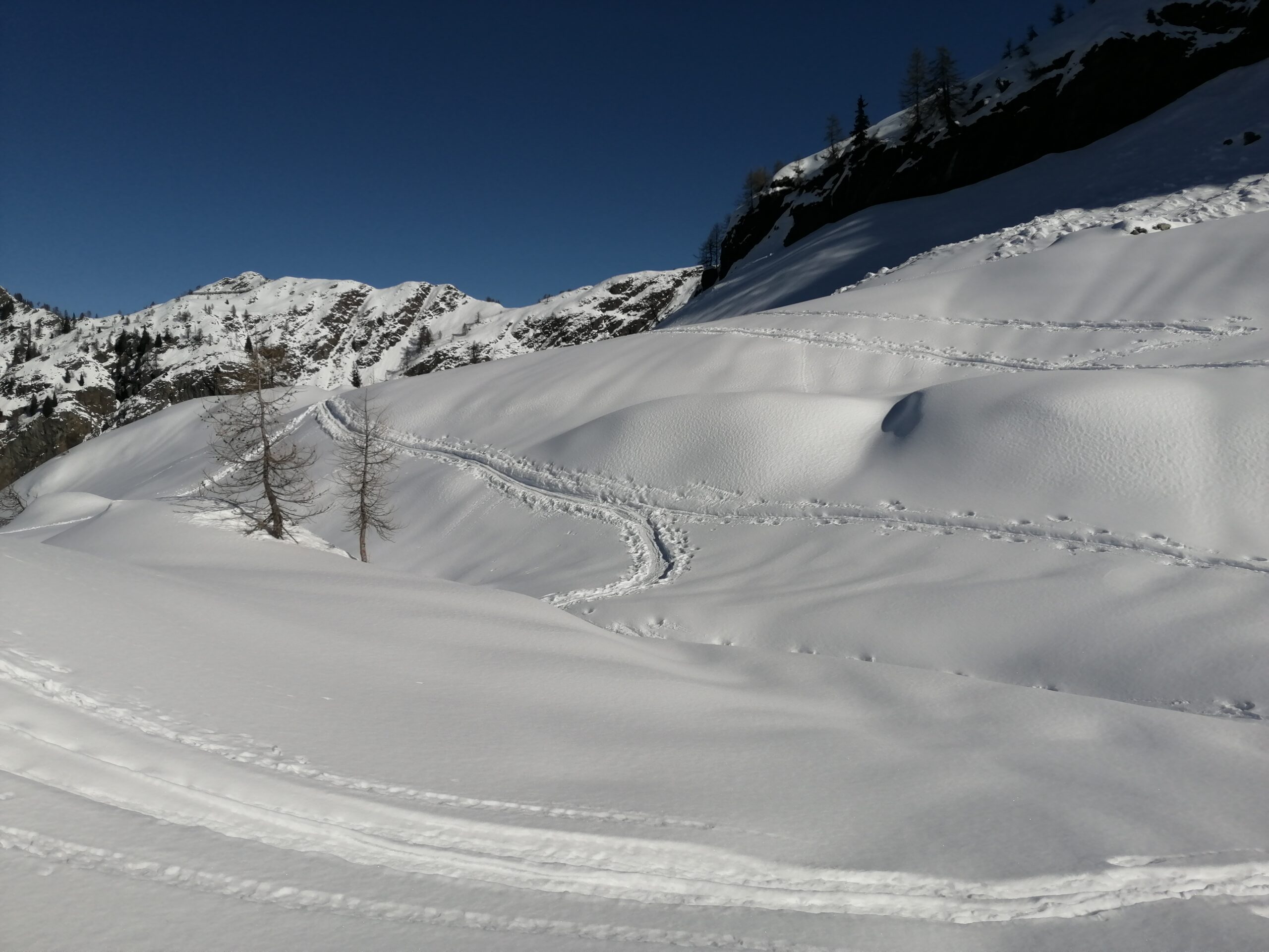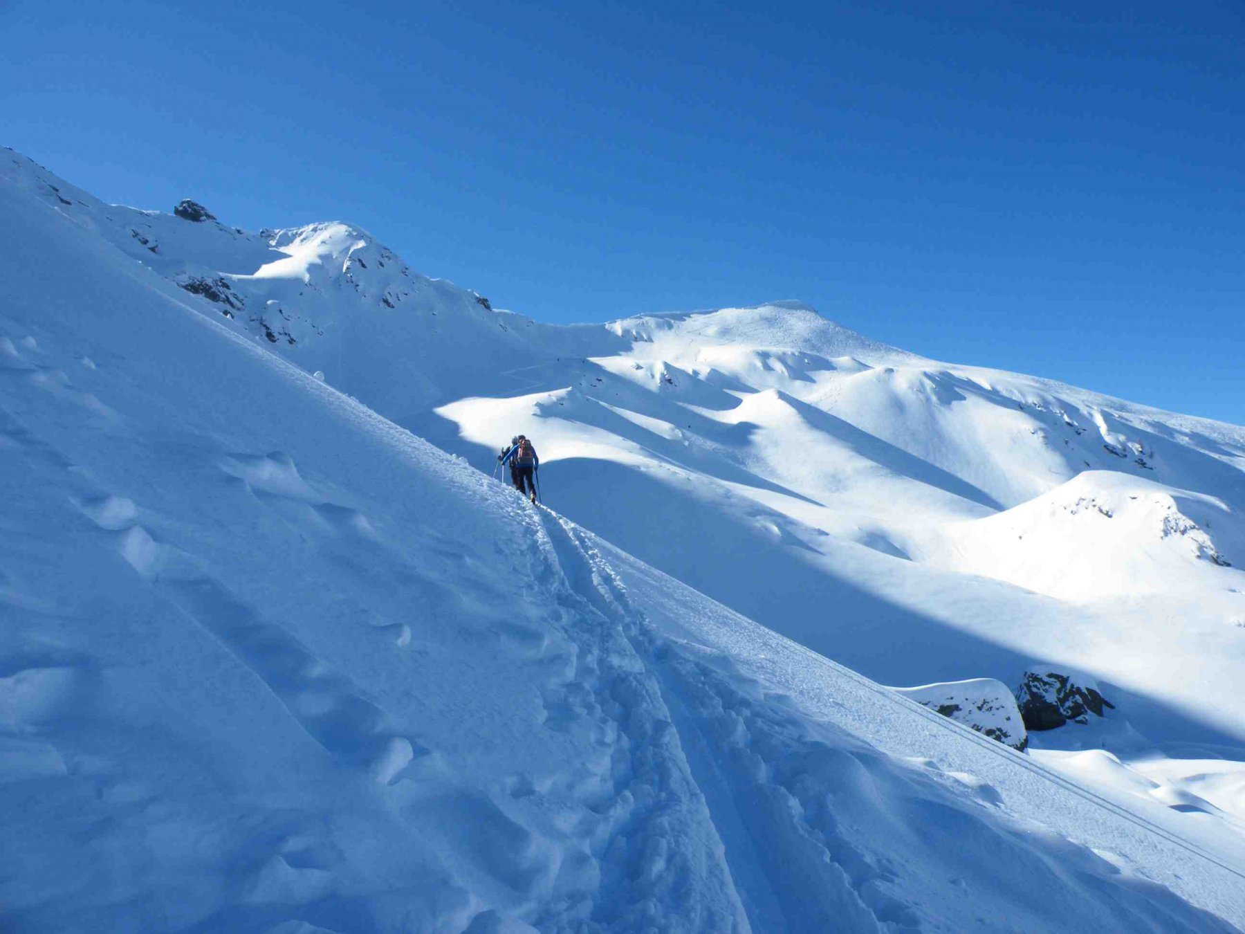 Discesa lungo l’itinerario di salita oppure, con neve sicura, per il versante nord ed un ripido canale che porta sulla via di salita in prossimità delle baite.