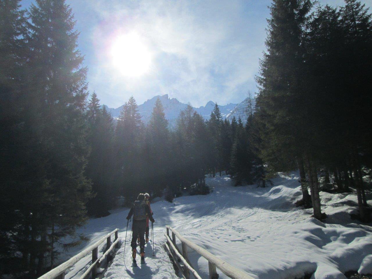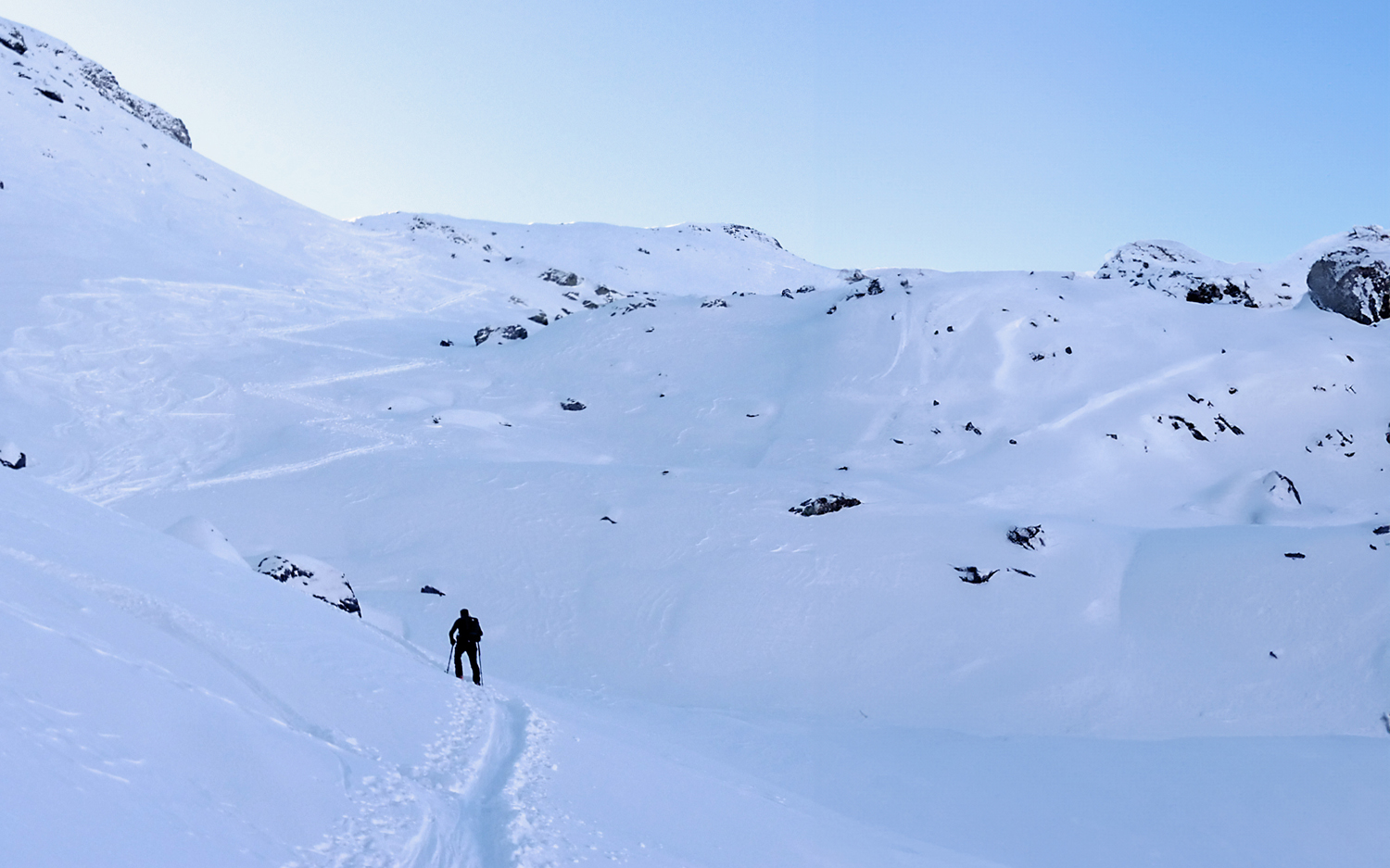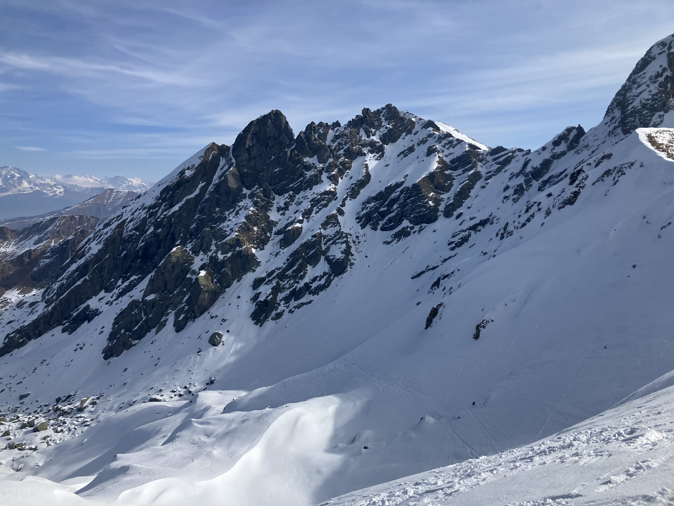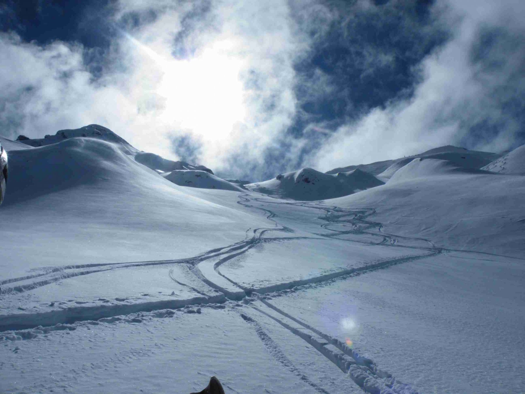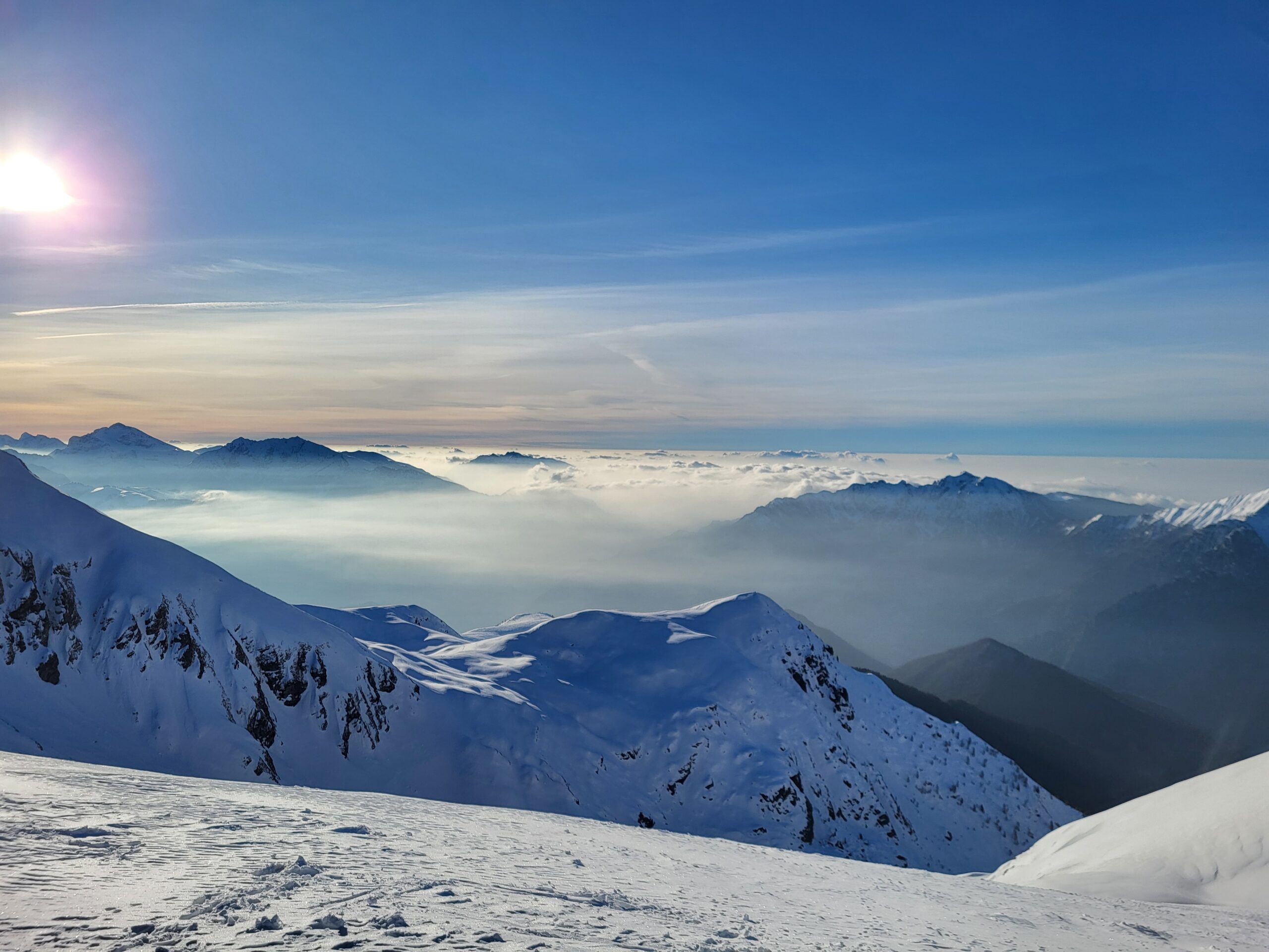 Discesa lungo l’itinerario di salita oppure, con neve sicura, per il versante nord ed un ripido canale che porta sulla via di salita in prossimità delle baite.