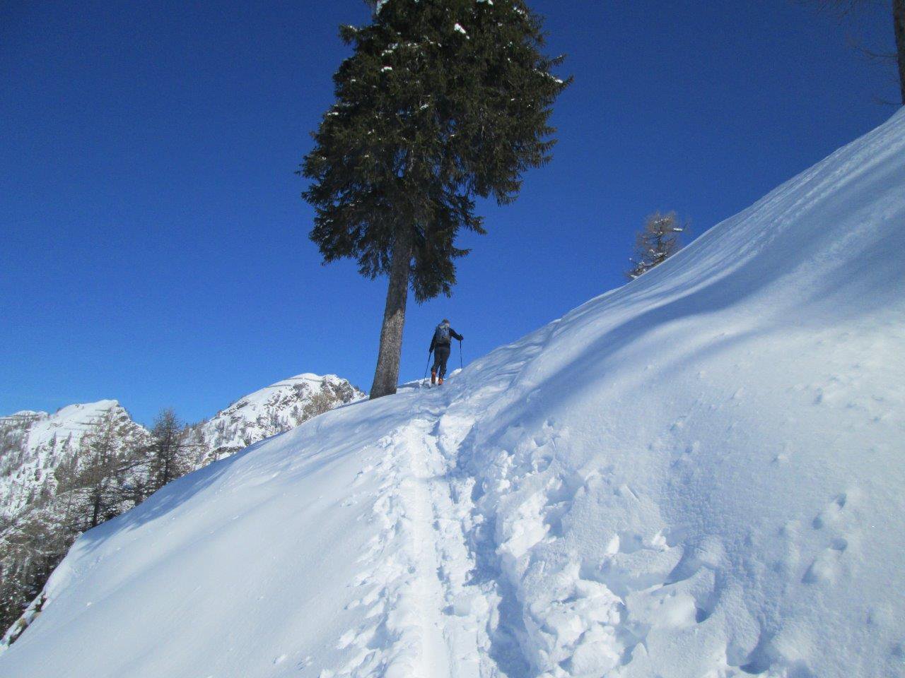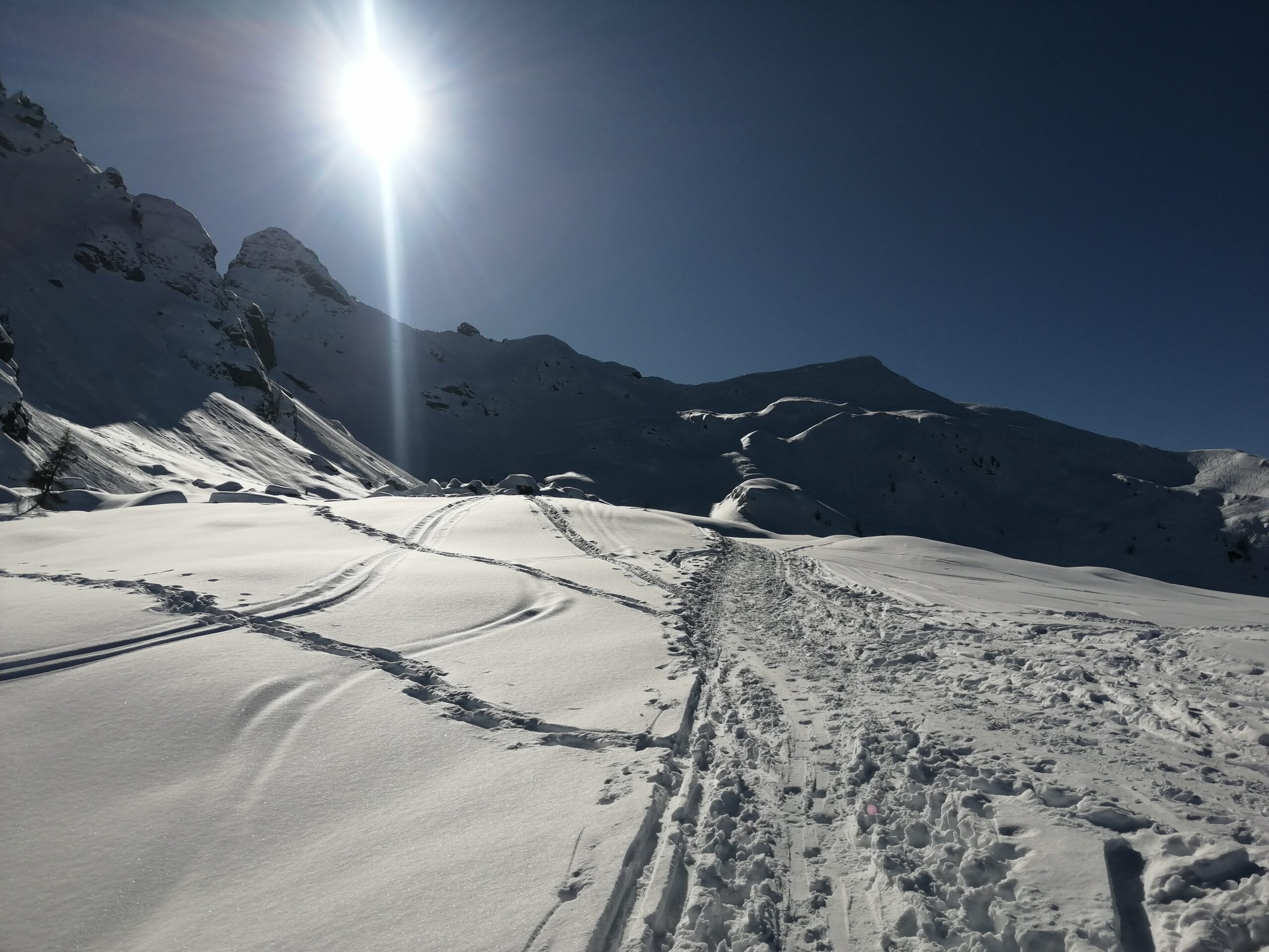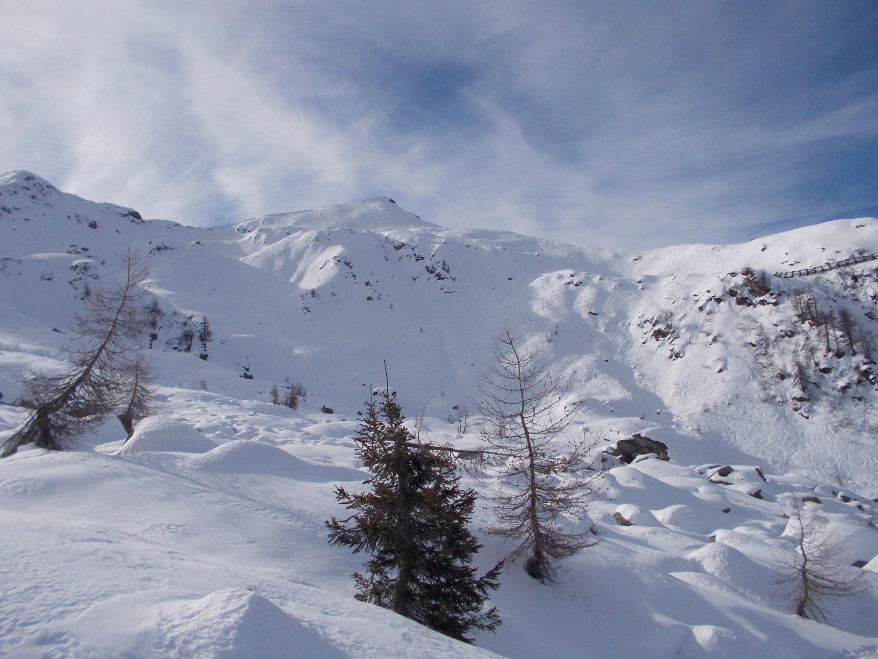 Dal piazzale si sale a sx della pista di sci fino a trovare una stradicciola che passa in prossimità di numerosi paravalanghe.