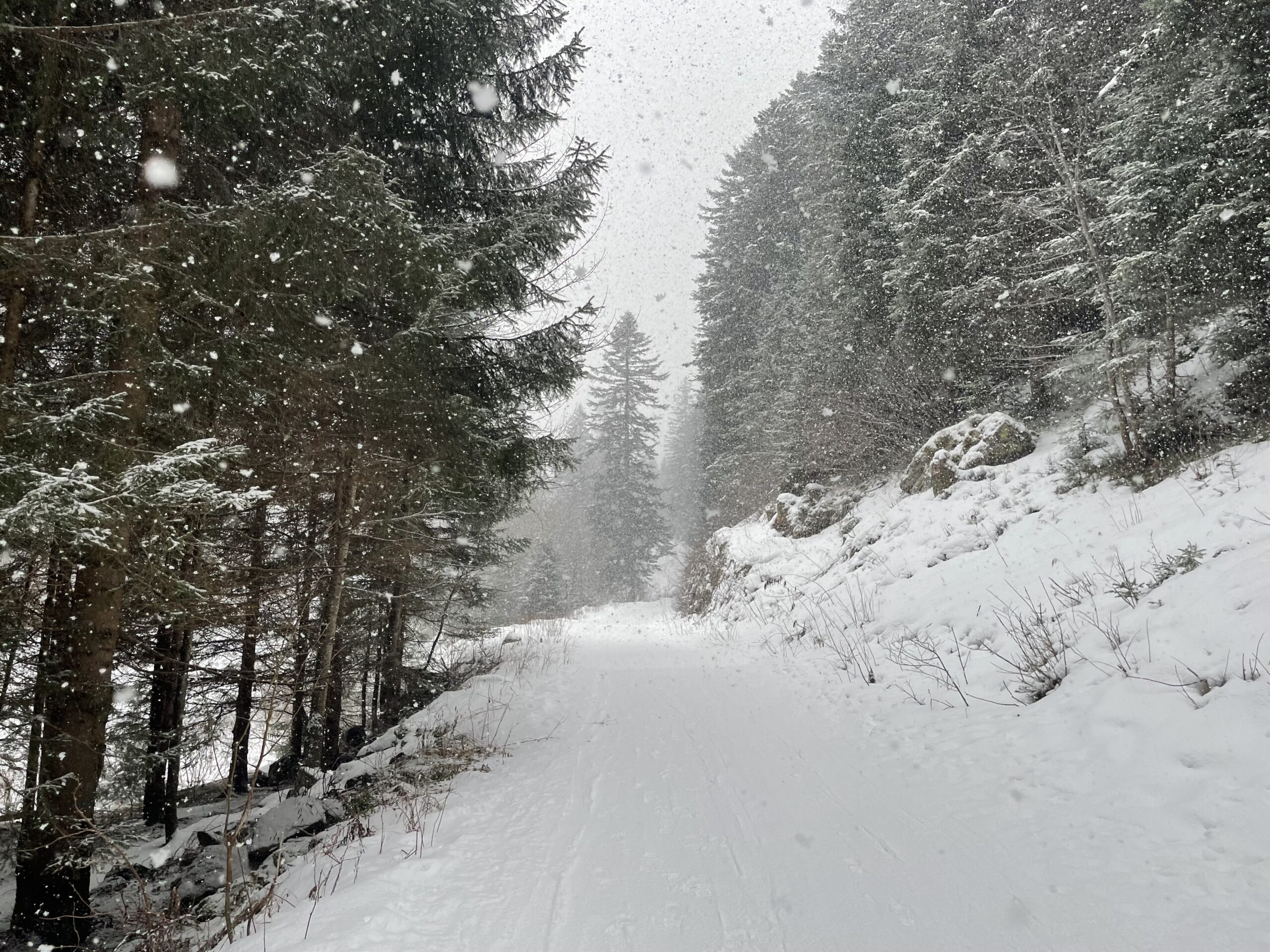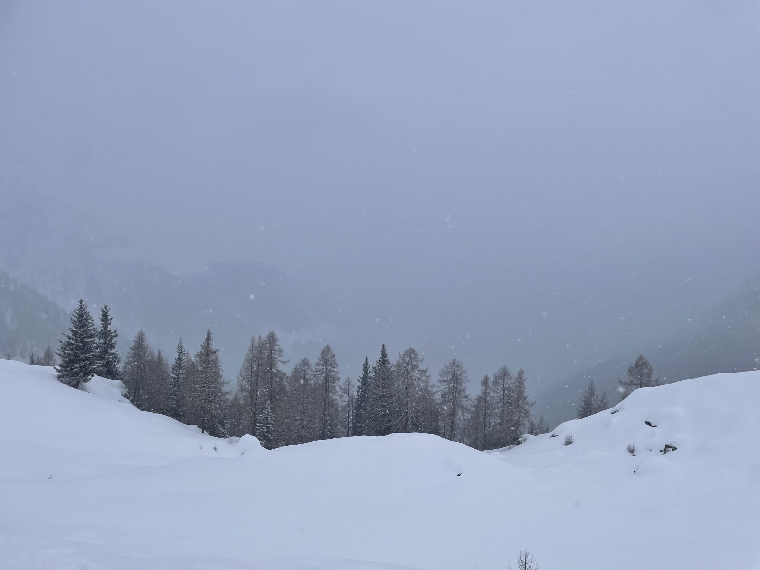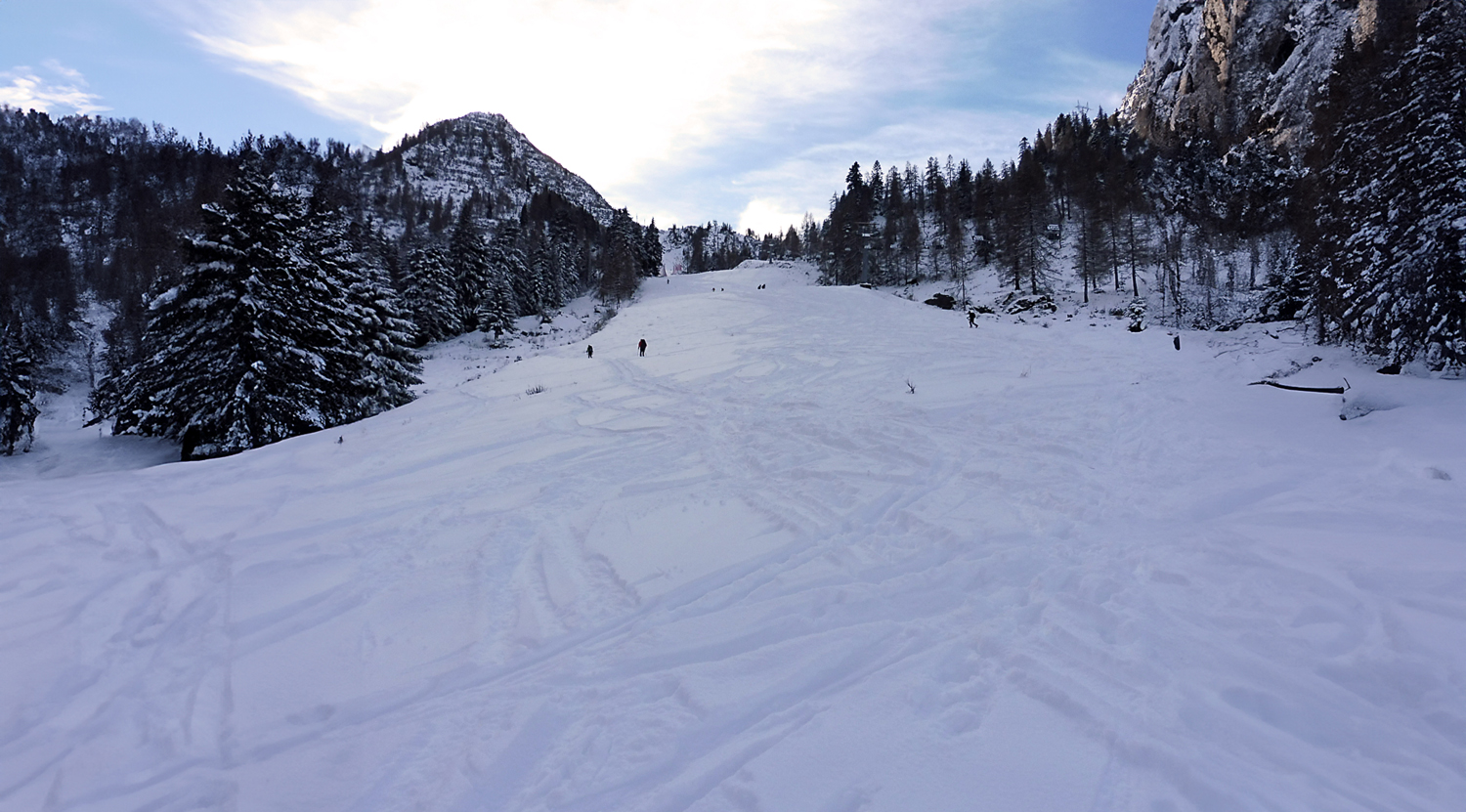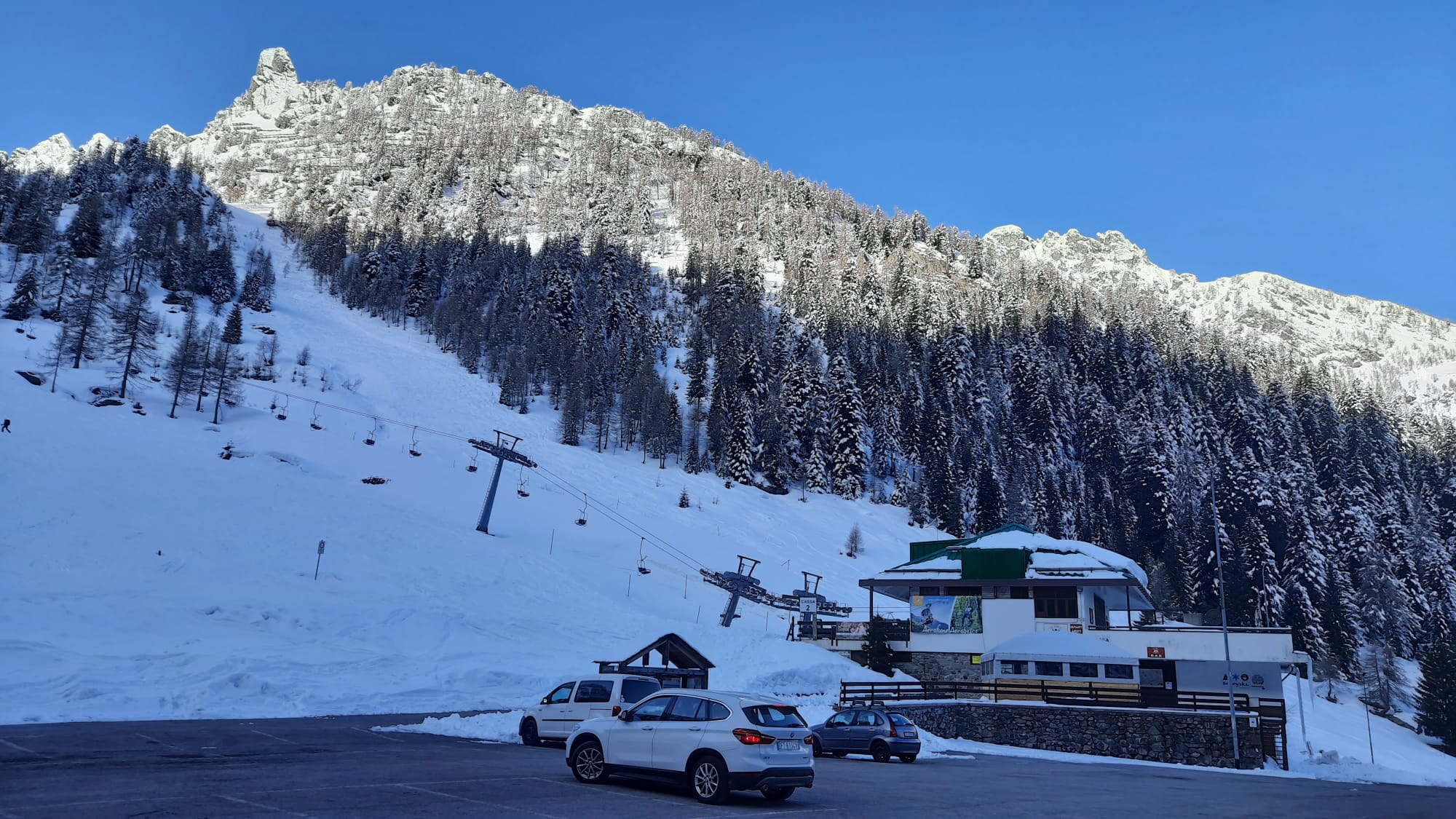 Dal piazzale si sale a sx della pista di sci fino a trovare una stradicciola che passa in prossimità di numerosi paravalanghe.