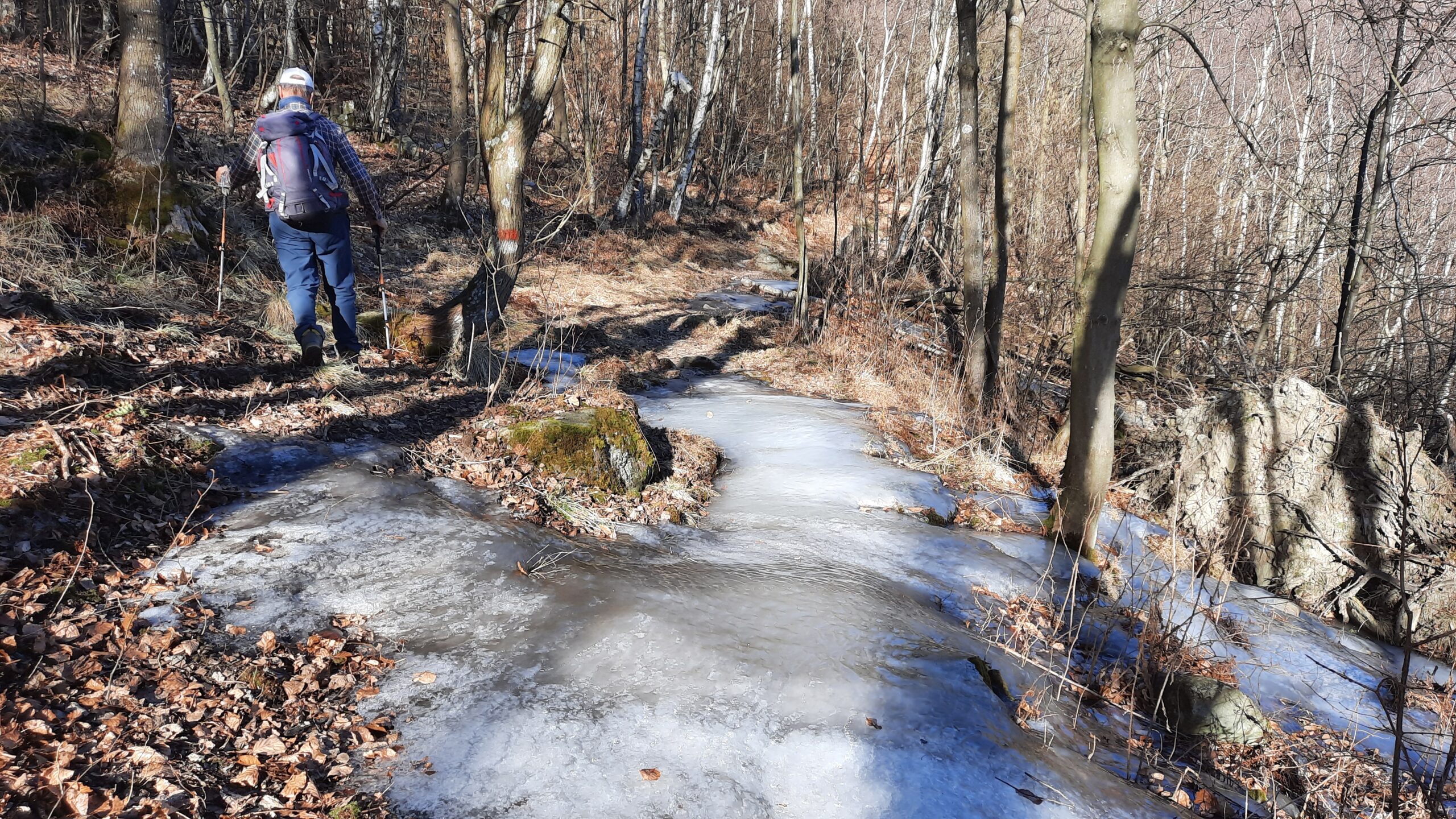 Qui inizia il sentiero che prosegue a mezzacosta con saliscendi tra betulle e pascoli; si tocca un punto panoramico nei pressi del Pilone di Punta Penna m. 1320 e si superano diversi alpeggi ormai abbandonati. Attraversarsato un ruscello si passa nei pressi di un caratteristico alpeggio incassato tra le rocce (Ca dou Magu).
