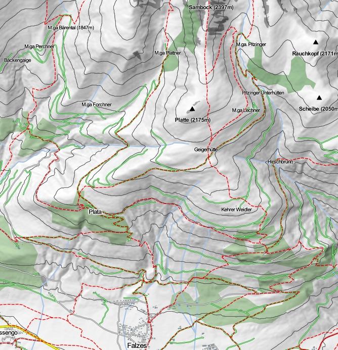 Dalla borgata di Plata/Platten 1571 m si sale verso nord lungo una strada forestale (possibilità di accorciatoia) che dopo aver superato la zona boscosa (abetaia) a quota 1960 , raggiunge delle malghe. Da qui si risalgono i pendii verso nord che portano, lungo il lunghissimo crestone, alla cima del Monte Sommo/Sambock.