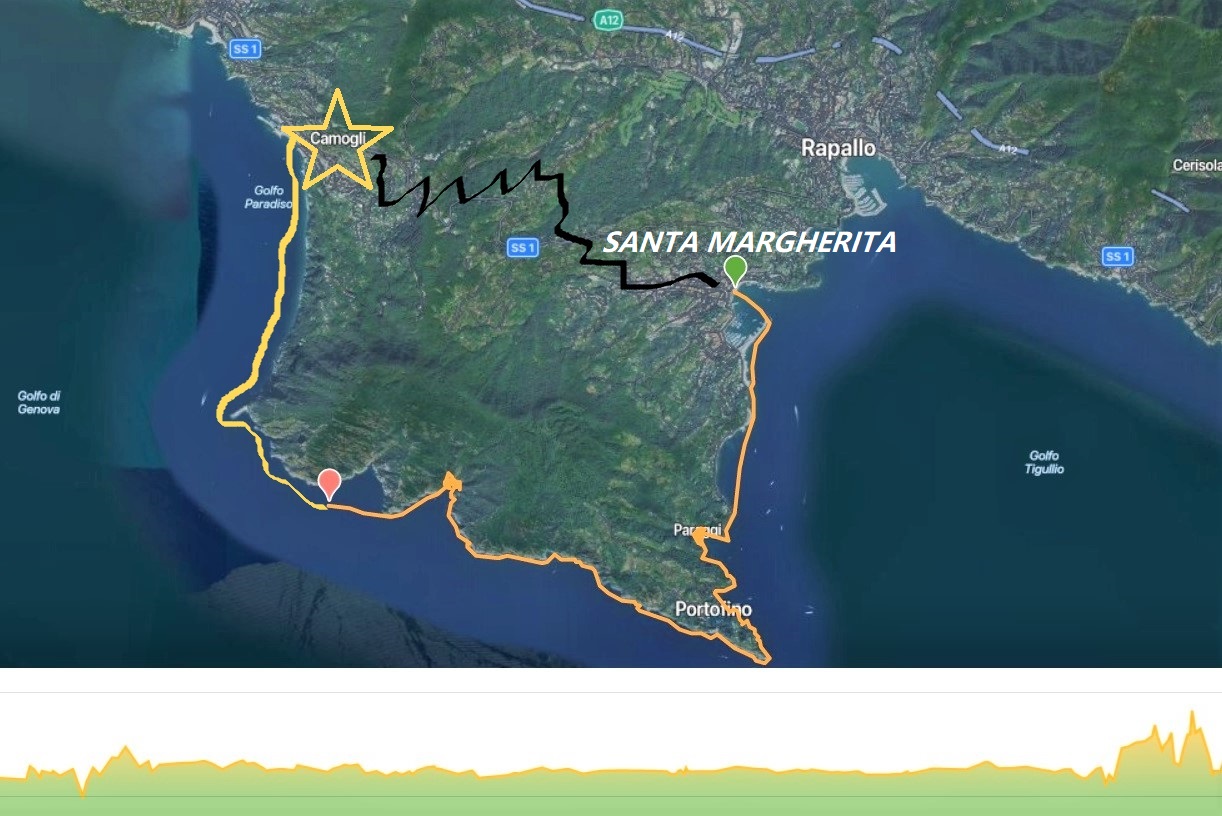 Si parte dalla baia di Paraggi o Niasca, fra Santa Margherita Ligure e Portofino, per arrivare alla spiaggia di San Fruttuoso di Camogli, sovrastata dalla storica abbazia medievale dei Doria.
