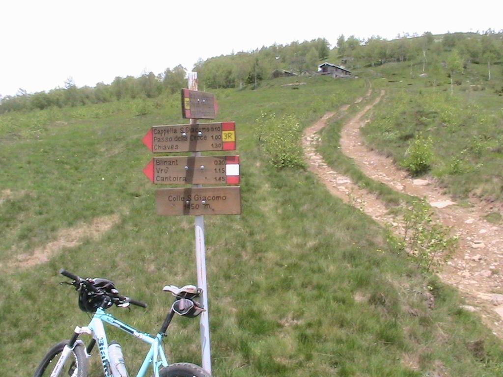 Si lascia a destra la diramazione per le baite S. Barbara, si incontra un nuovo bivio che a sx consente di raggiungere la sottostante cappella di S. Giacomo. Si prosegue a dx direzione Blinant e dopo un tornante si arriva presso alcune baite.
