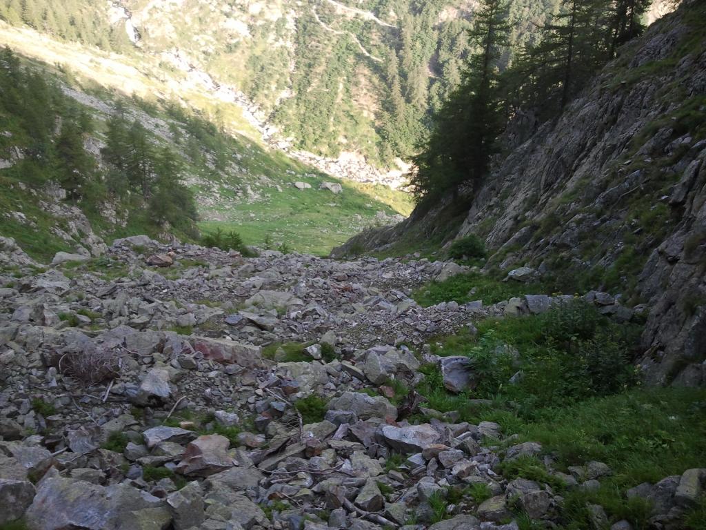 In alternativa dal colletto si può scendere dalla parte opposta, per raggiungere il gias delle Mosche. Si scende per sfasciumi e pietraia, a tratti cengie erbose, un alveo prosciugato di torrente. Quando questo torna a farsi vedere formando una cascatella, ci si accorge che il percorso proseguirebbe in una sorta di canyon. A questo punto si piega decisamente a destra, camminando sull’erba quasi in piano ed inoltrandosi in mezzo agli alberi. In questa maniera si bypassano i salti di roccia e si scenderà tramite pietraia ‘puntando’ il ponte di legno che guada il torrente, sul sentiero che dal gias delle Mosche va verso i laghi di Fremamorta. Occorre tenere in considerazione che bisognerà raggiungere le Terme su asfalto (circa 2km, mezz’ora ca.)