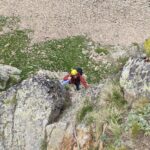 L4 muro lavorato con passaggi in placca e strapiombino finale (6a+, 30 m); seguire la linea di cresta per una decina di metri, quindi calarsi brevemente sulla destra e salire al colle, per poi ridiscendere di circa 80 m e attraversare verso destra (faccia a valle) fino alla base di un grosso camino;