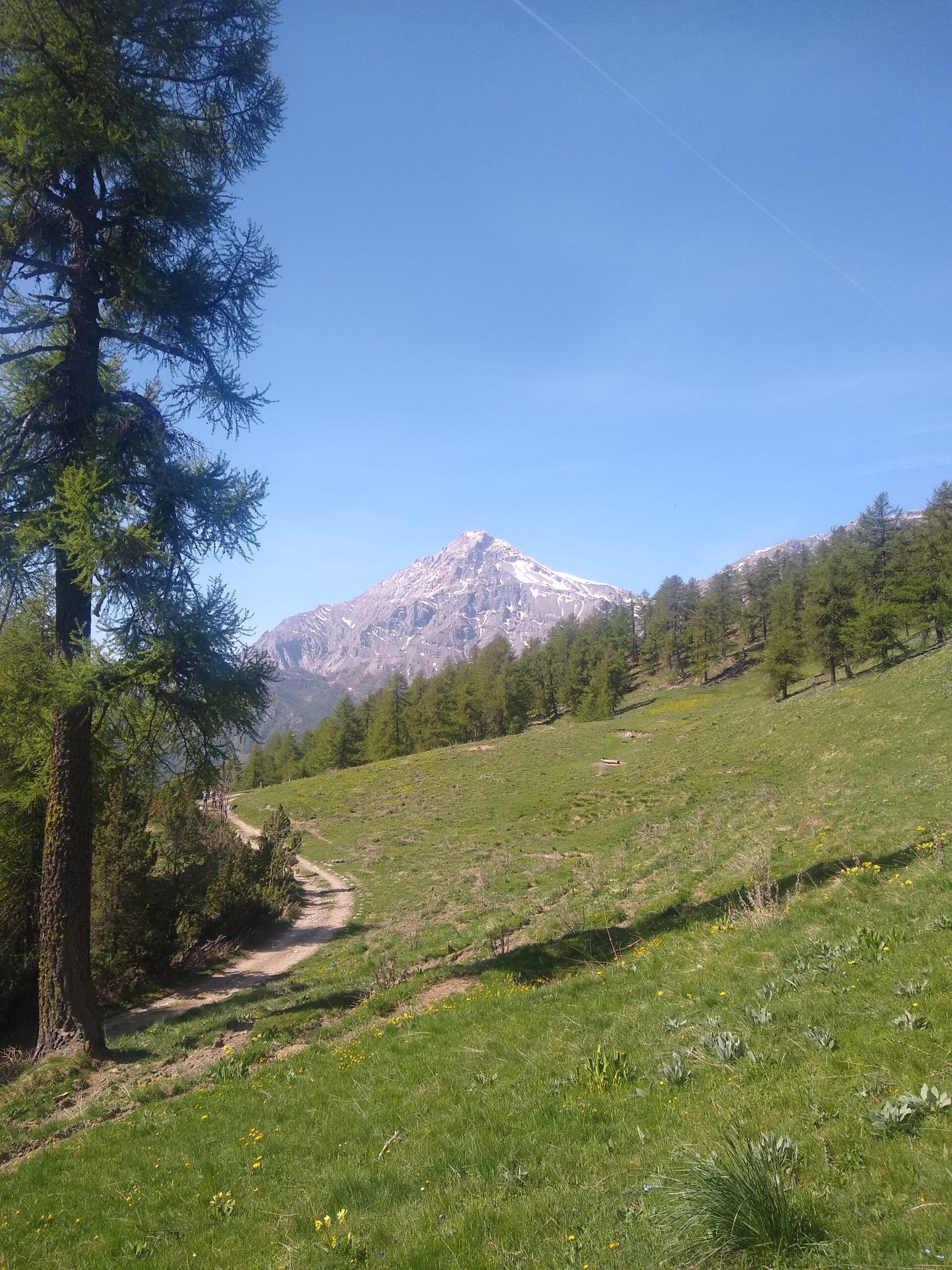 Dal Colletto Pourachet (Sbarra e parcheggio) la stradina prosegue in direzione est costeggiando i fianchi della cima della Croce di San Giuseppe.