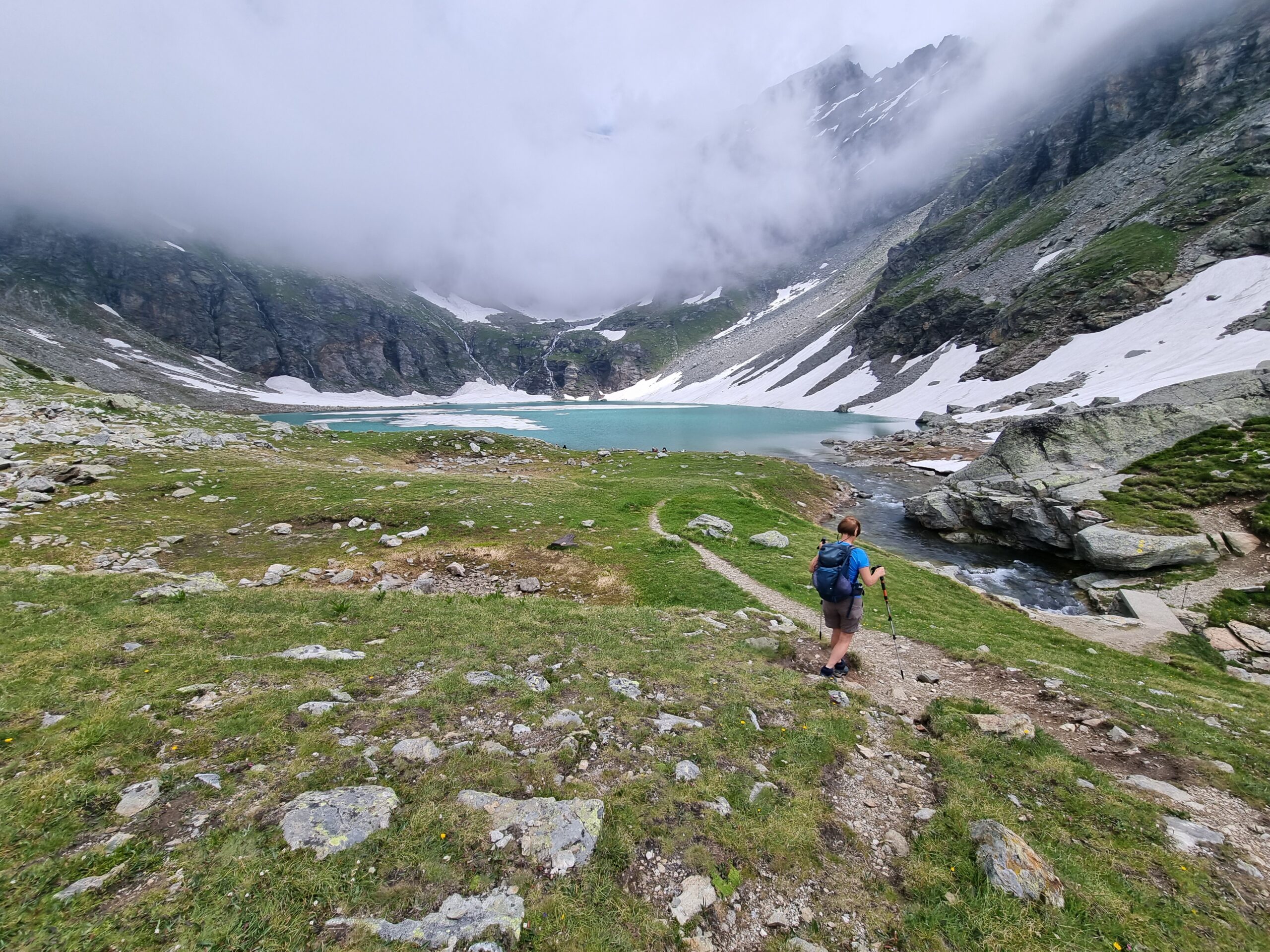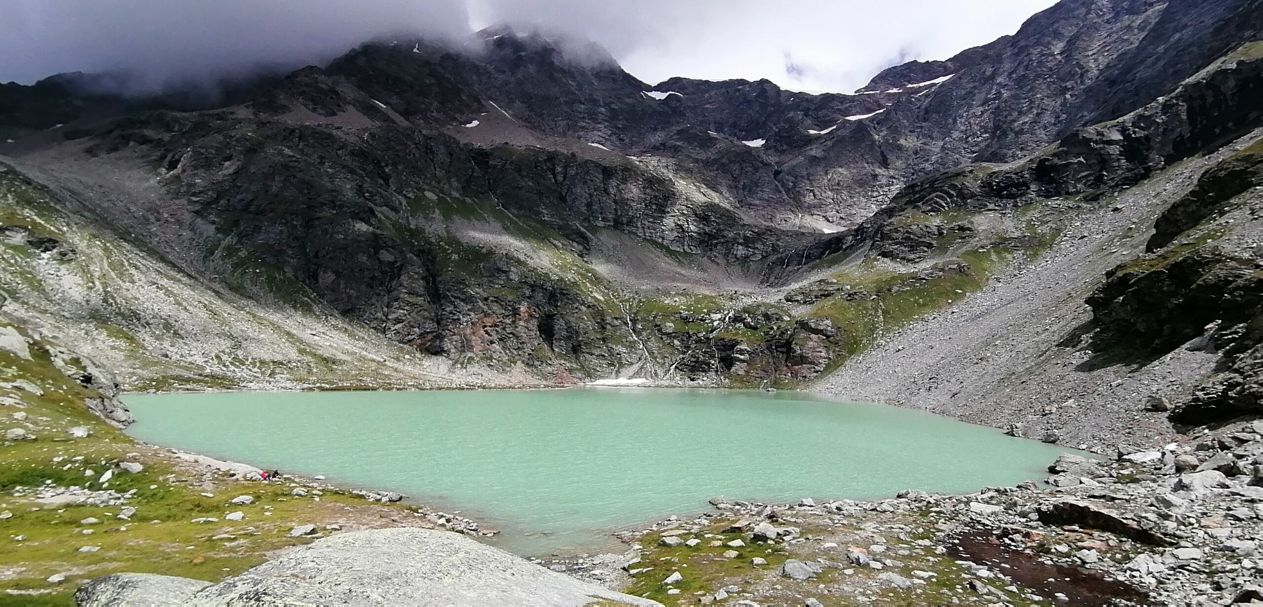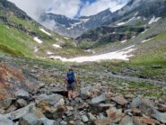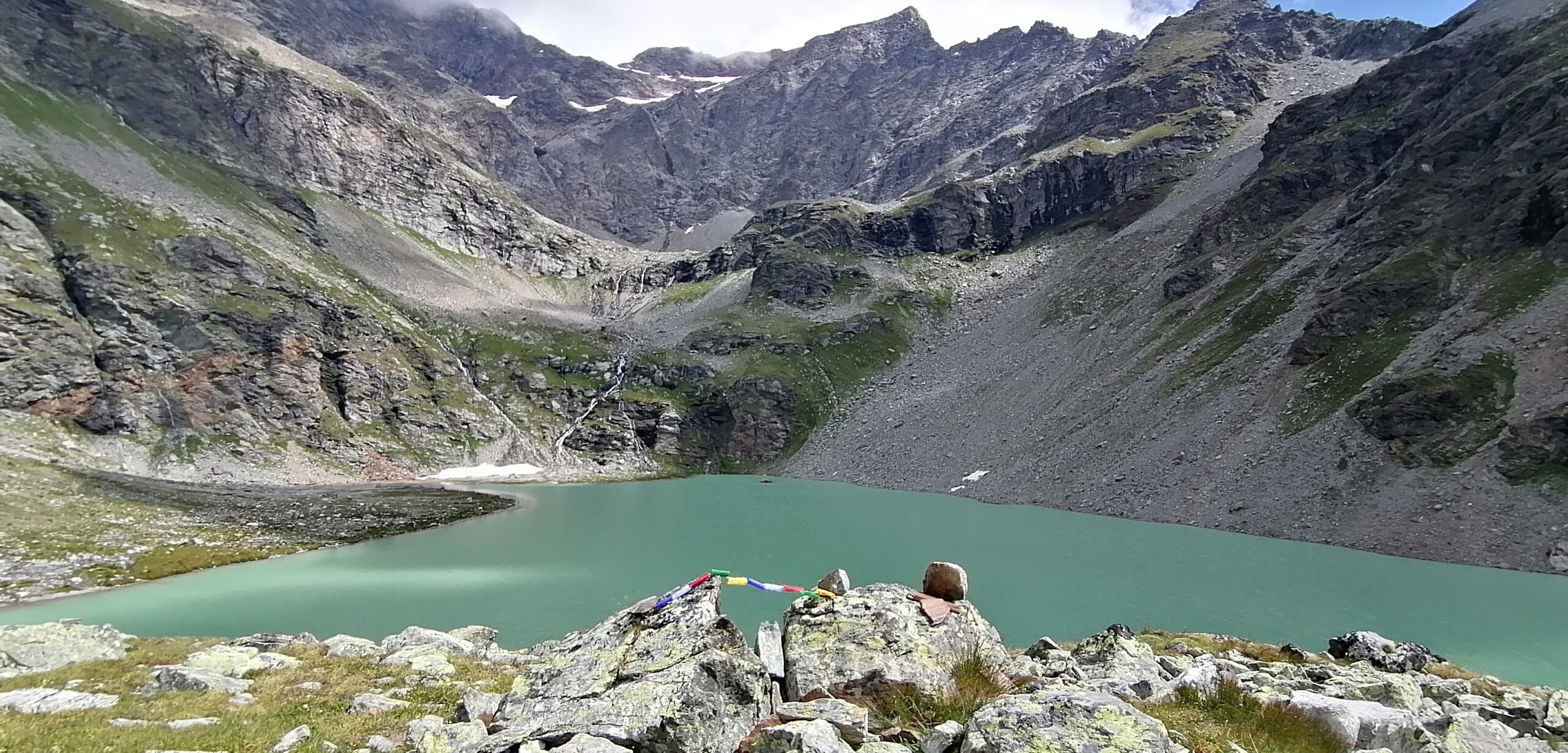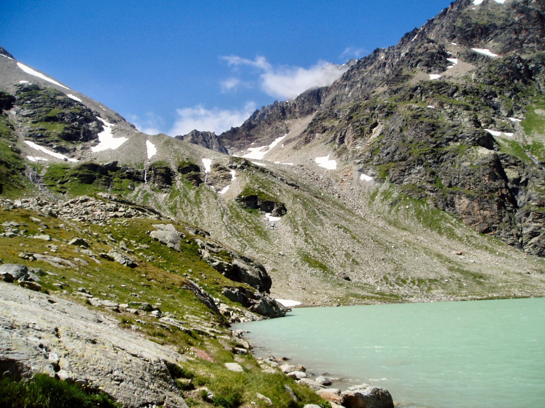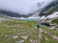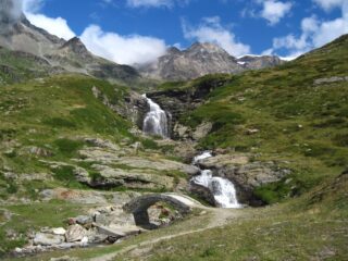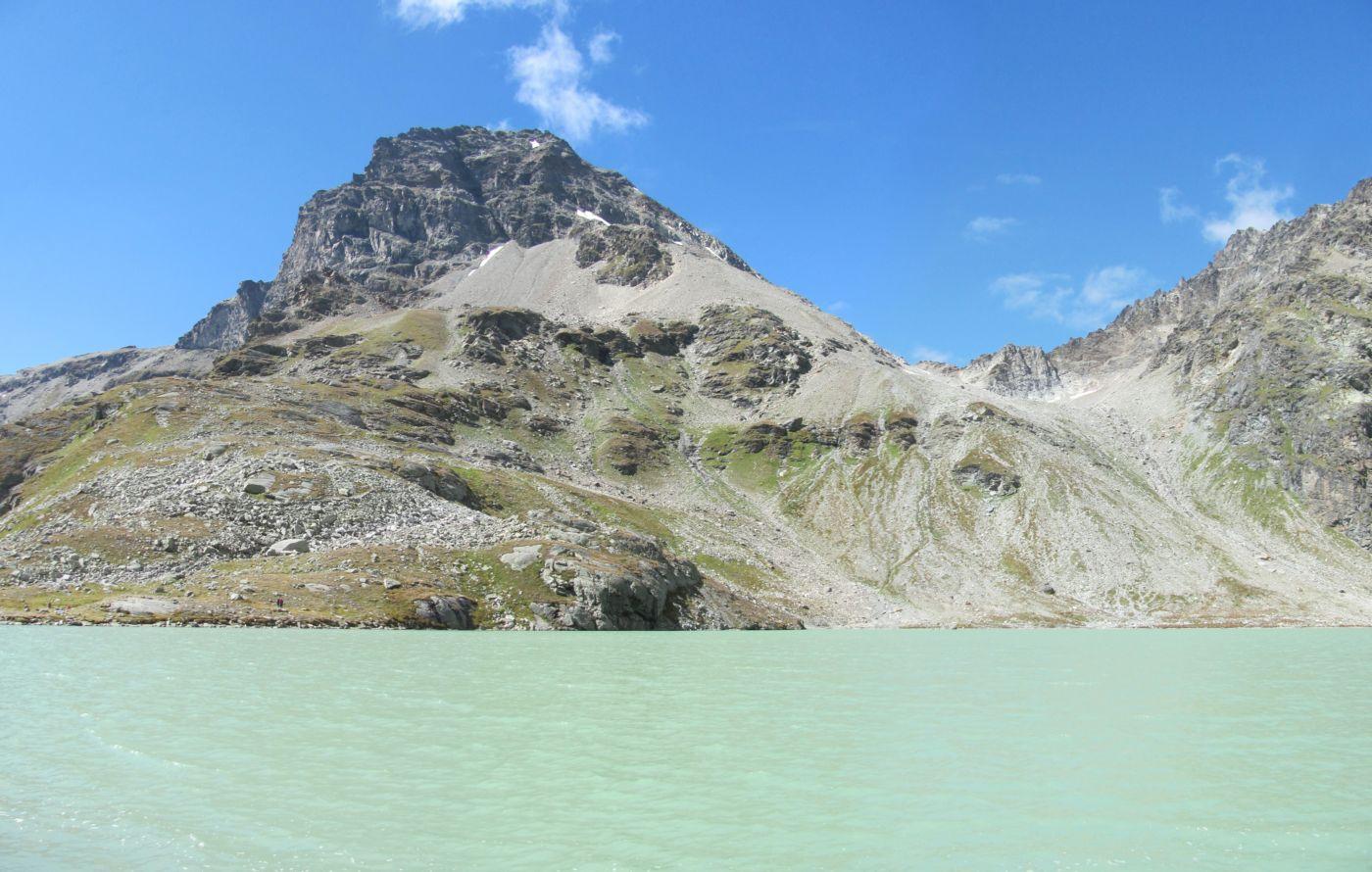 Per fare il giro circolare suggerito dallo Zavatta, anziche’ ritornare sulle tracce di salita, dal bordo del lago seguire a dx passando su di un ponticello i segnavia 14A e B; il percorso con alcuni saliscendi passa alto attorno all’Arp Vieille, e offre stupendi panorami sull’Ormelune prima, sulla Grande Rousse e San Martino e poi sul vallone che porta al Bezzi e sulla costiera Rabuigne-Feluma; il sentiero a tratti e’ stretto ed attraversa alcuni pendii molto ripidi.