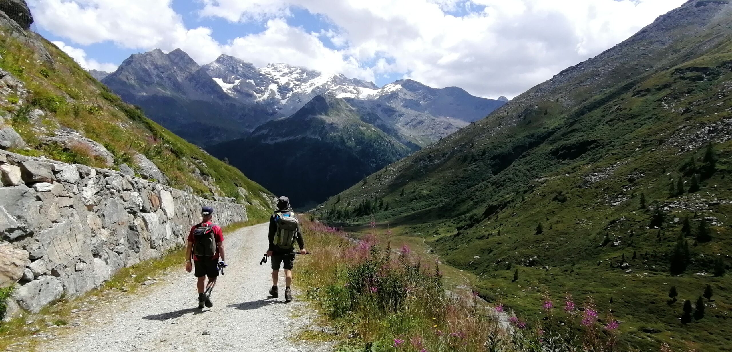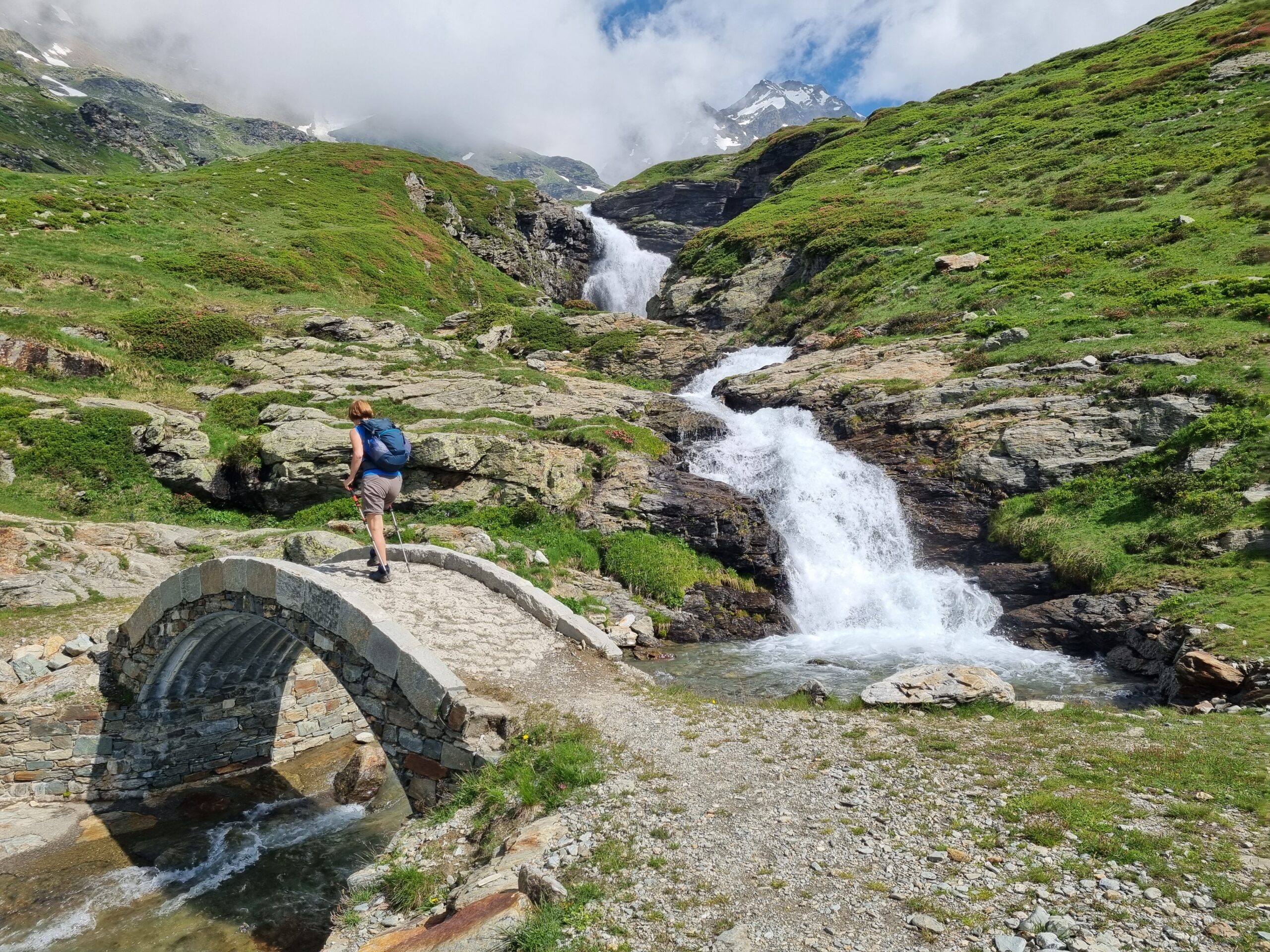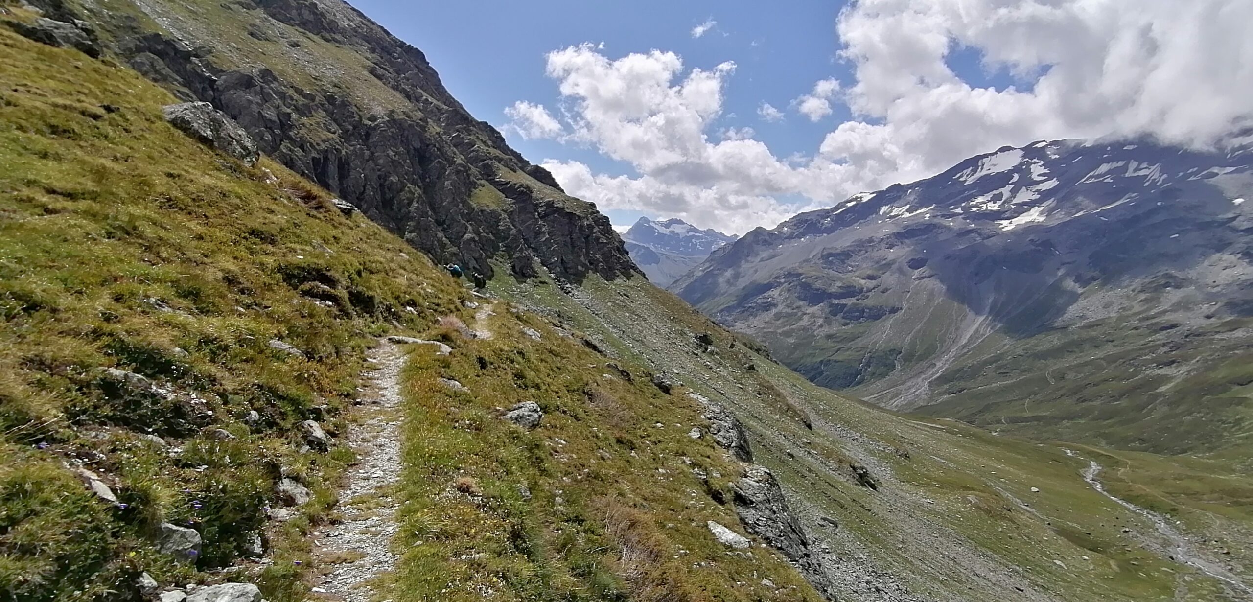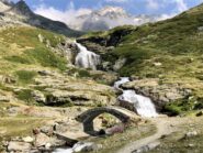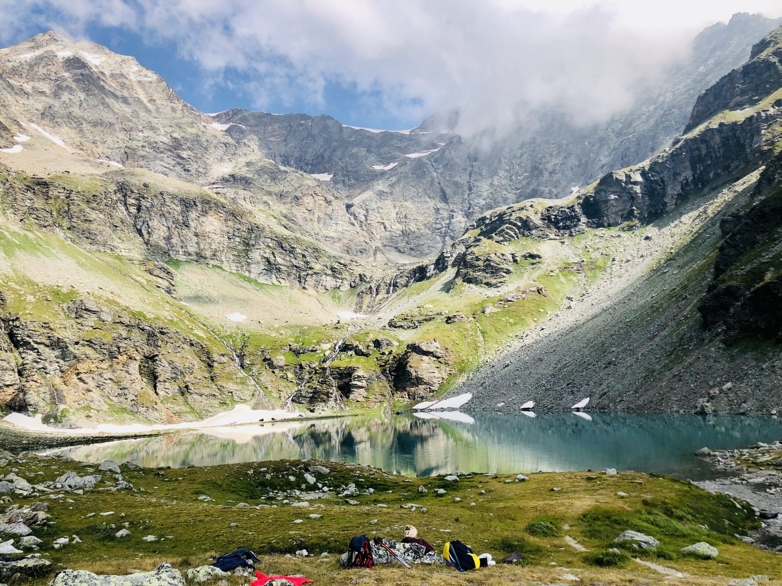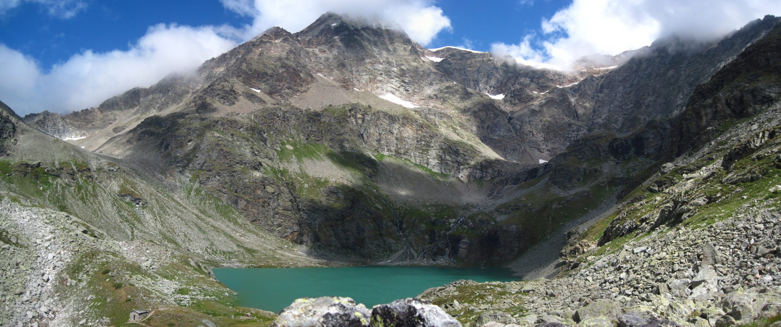 Per fare il giro circolare suggerito dallo Zavatta, anziche’ ritornare sulle tracce di salita, dal bordo del lago seguire a dx passando su di un ponticello i segnavia 14A e B; il percorso con alcuni saliscendi passa alto attorno all’Arp Vieille, e offre stupendi panorami sull’Ormelune prima, sulla Grande Rousse e San Martino e poi sul vallone che porta al Bezzi e sulla costiera Rabuigne-Feluma; il sentiero a tratti e’ stretto ed attraversa alcuni pendii molto ripidi.